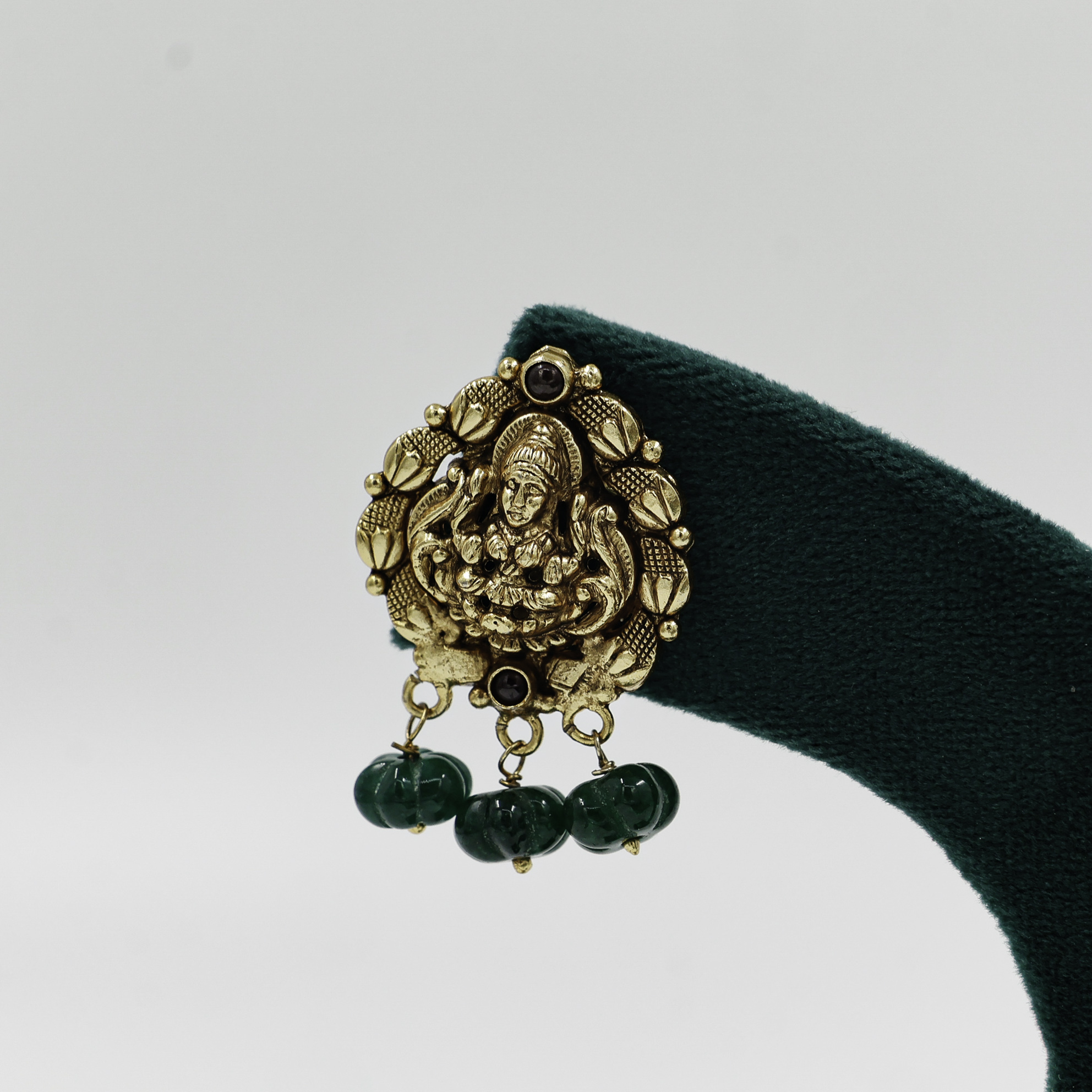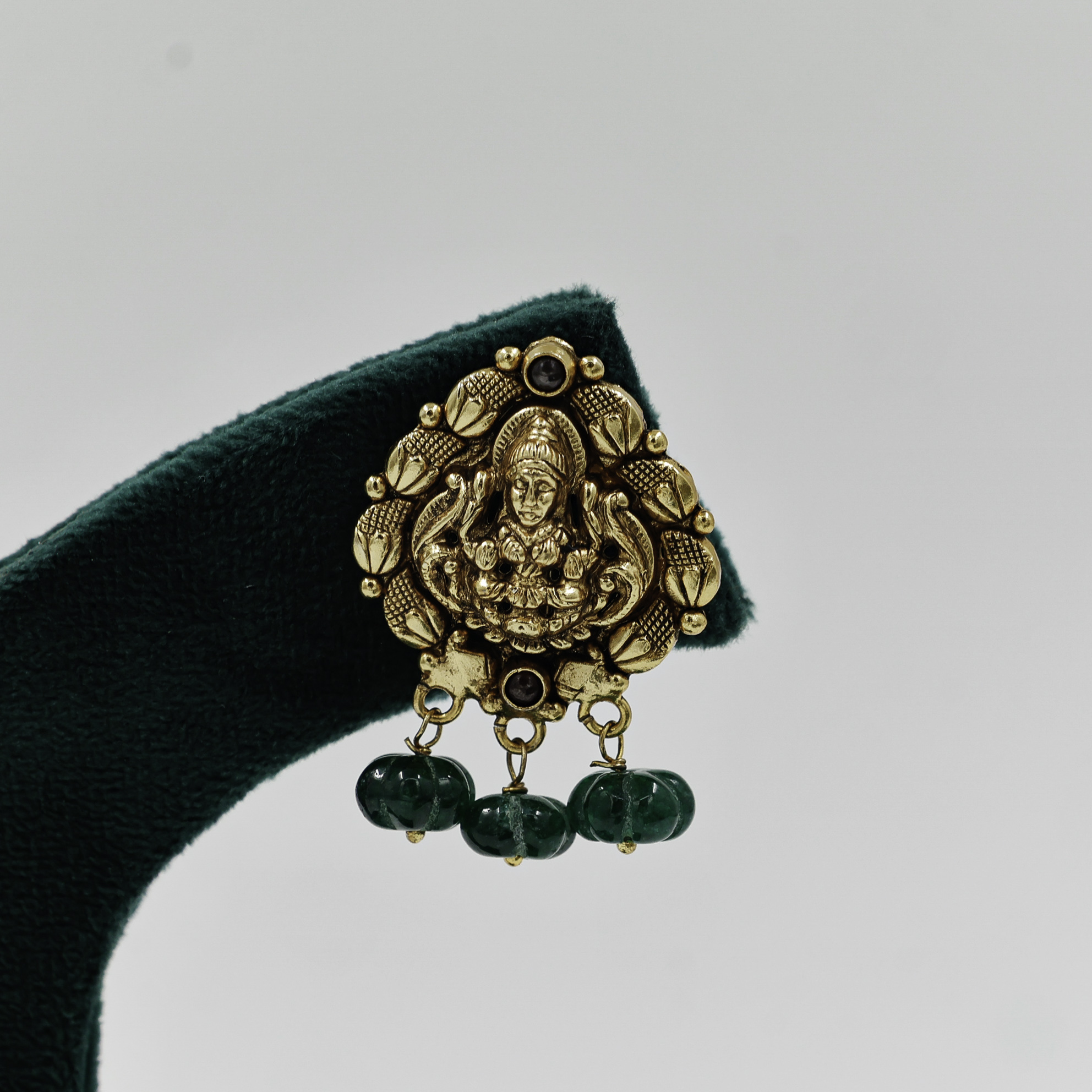 Antique Lakshmi design silver earrings with green beads. Buy Lakshmi Silver Earrings from Raag Silver Jewellery in Hyderabad, perfect traditional wear.