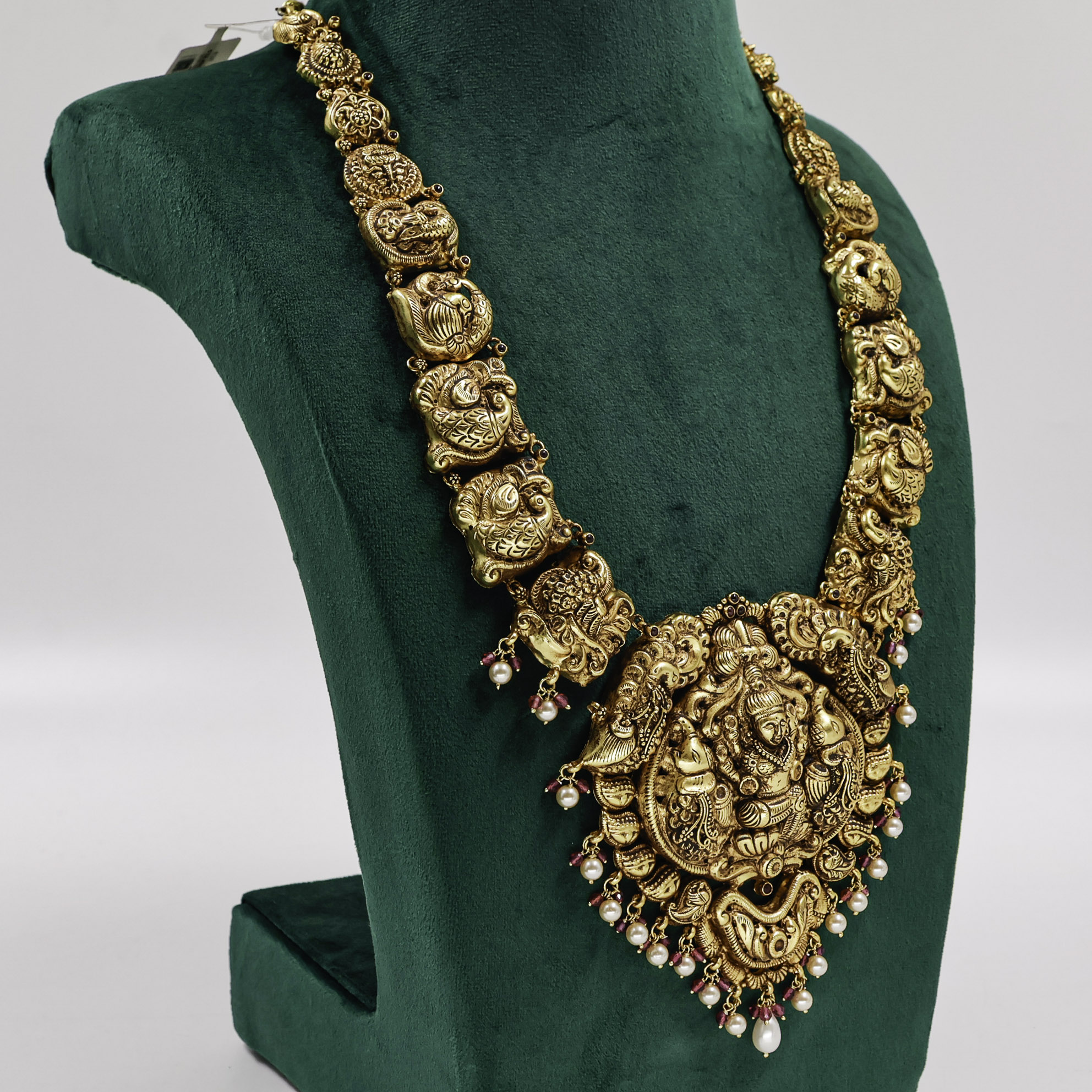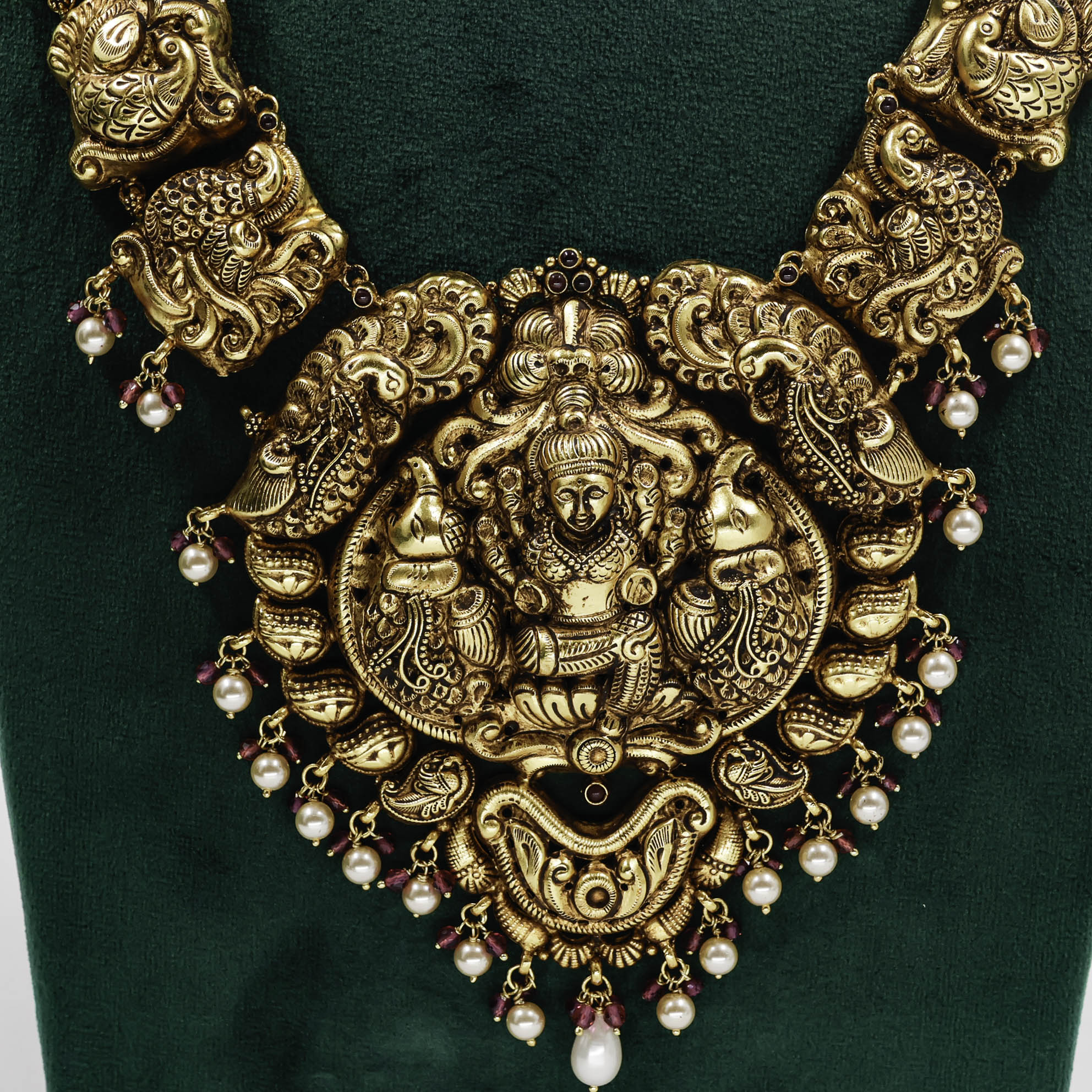 Antique Lakshmi design silver necklace with green stone drops, perfect for traditional occasions. Buy Lakshmi Silver Necklace from Raag Silver Jewellery in Hyderabad.