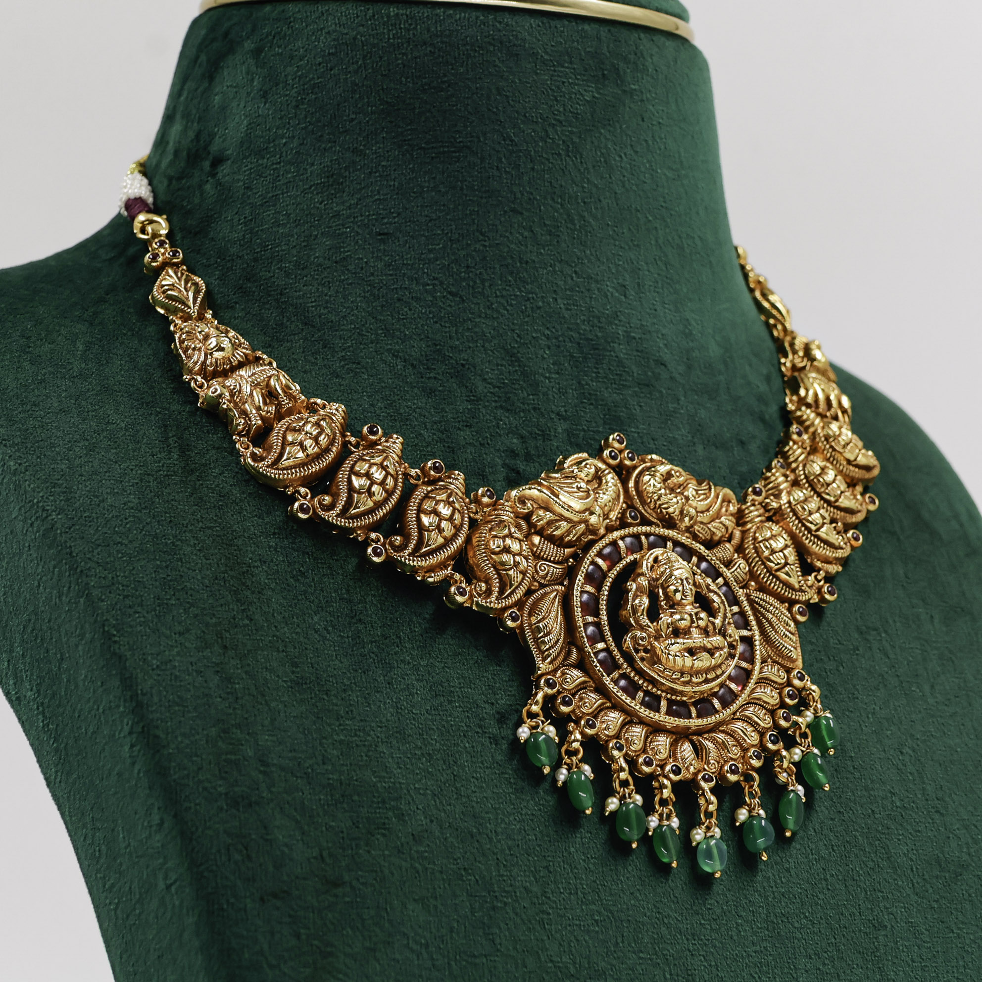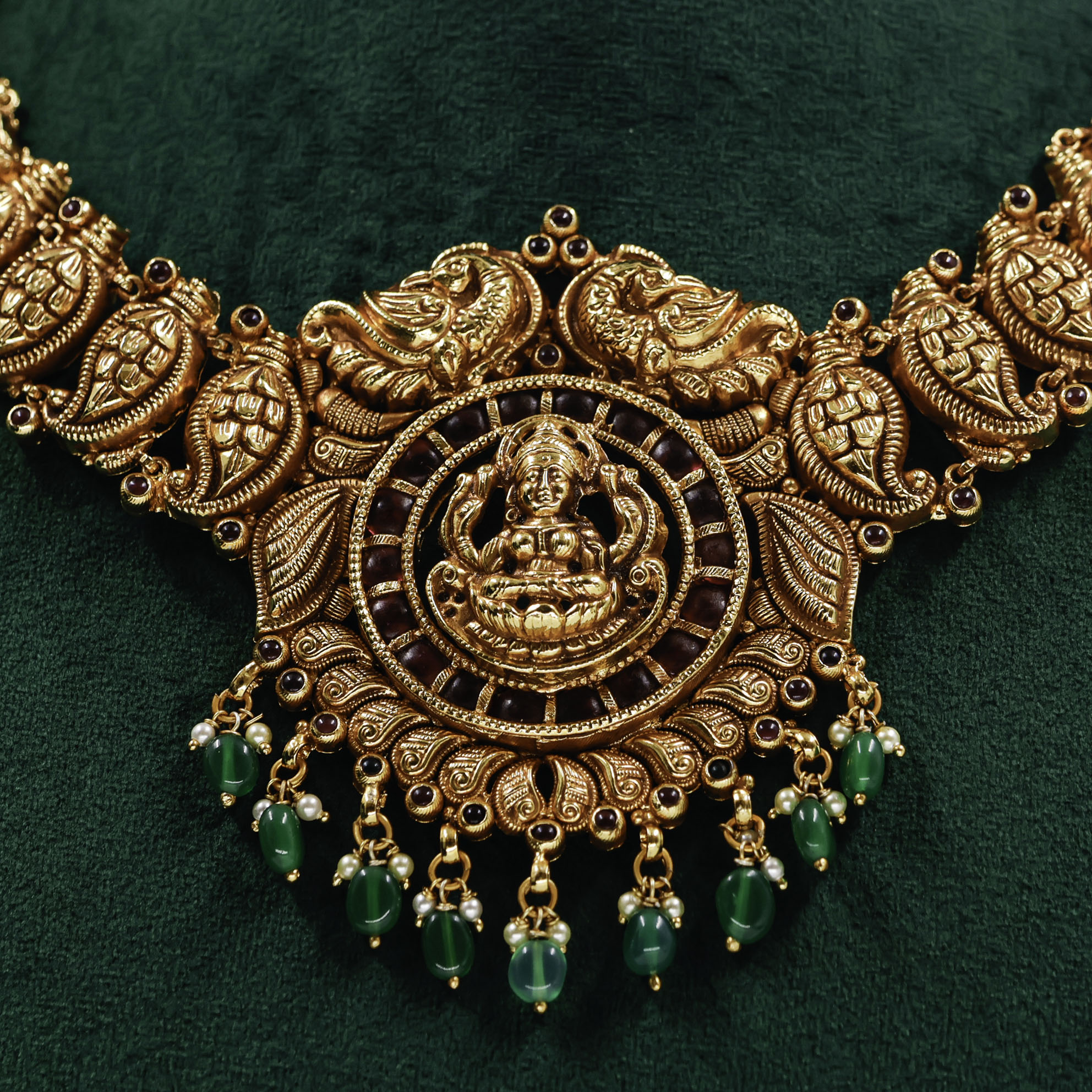 Gold Polished Silver-toned Lakshmi temple necklace with intricate detailing, perfect for traditional occasions. Buy Lakshmi temple necklace from Raag Silver Jewellery in Hyderabad.