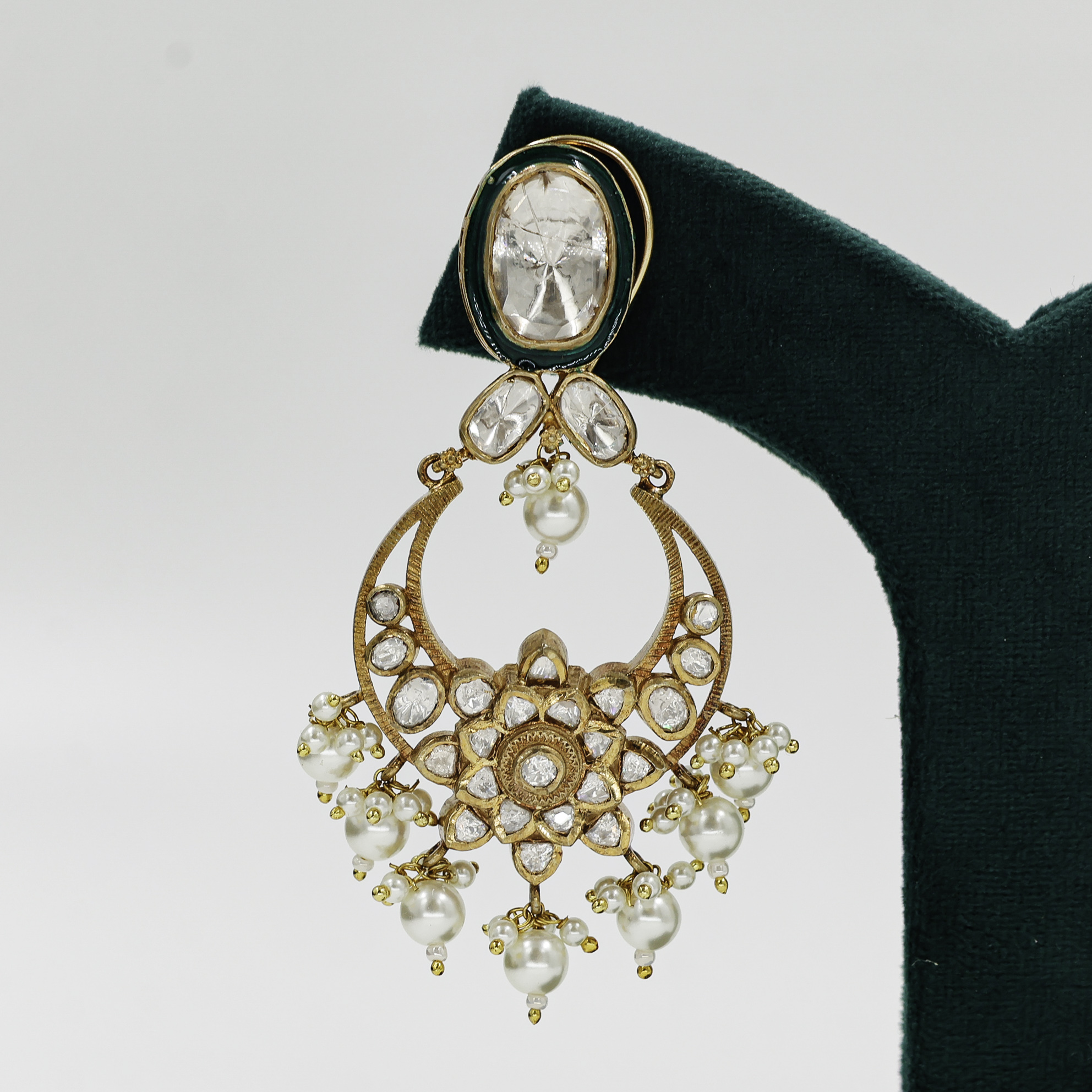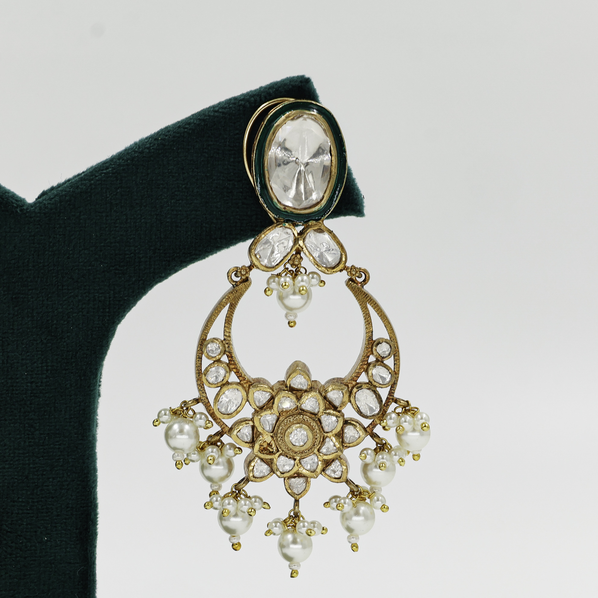 Gold Polished Silver-plated polki and pearl drop earrings, perfect for festive occasions and traditional wear. Buy Polki Drop Earrings from Raag Silver Jewellery in Hyderabad.