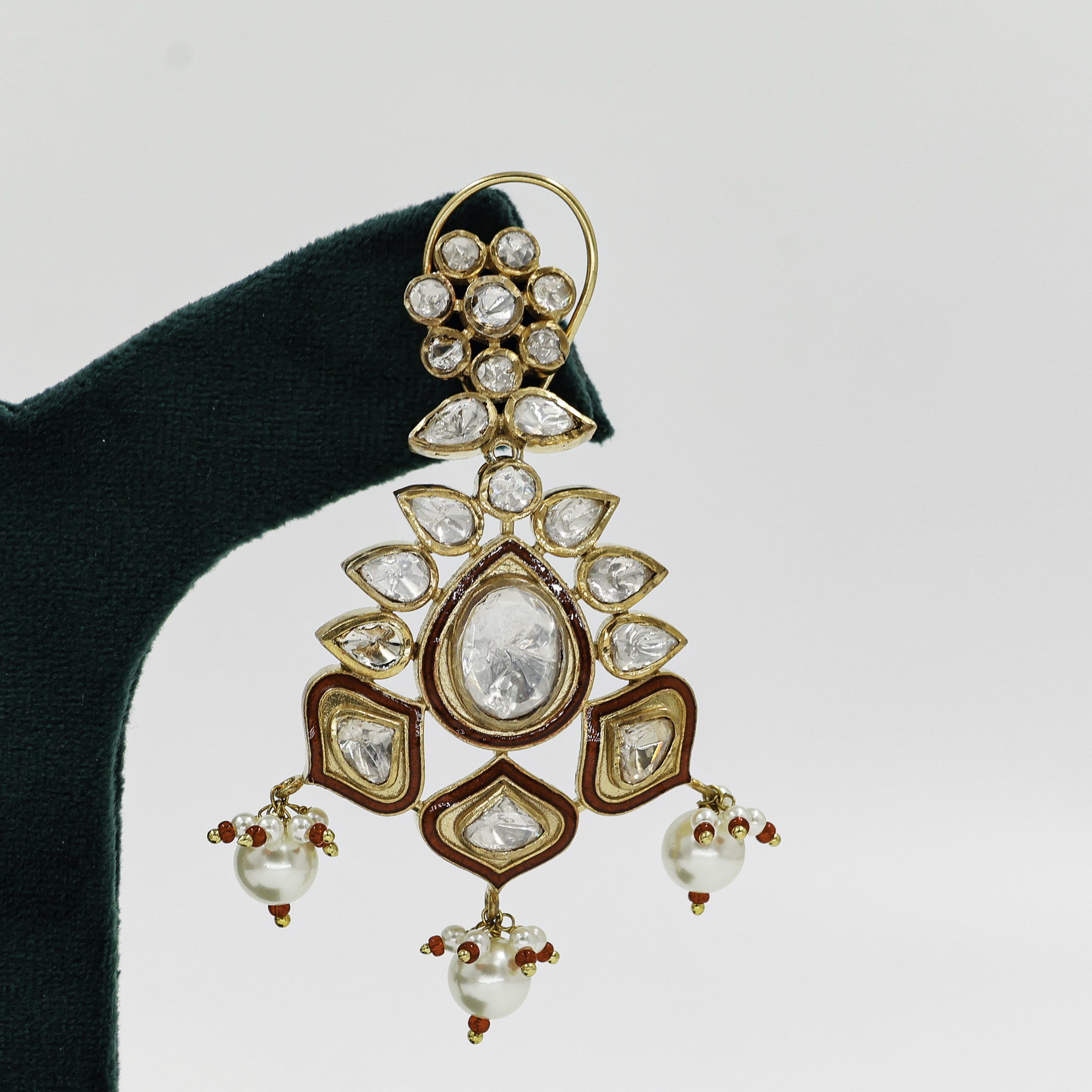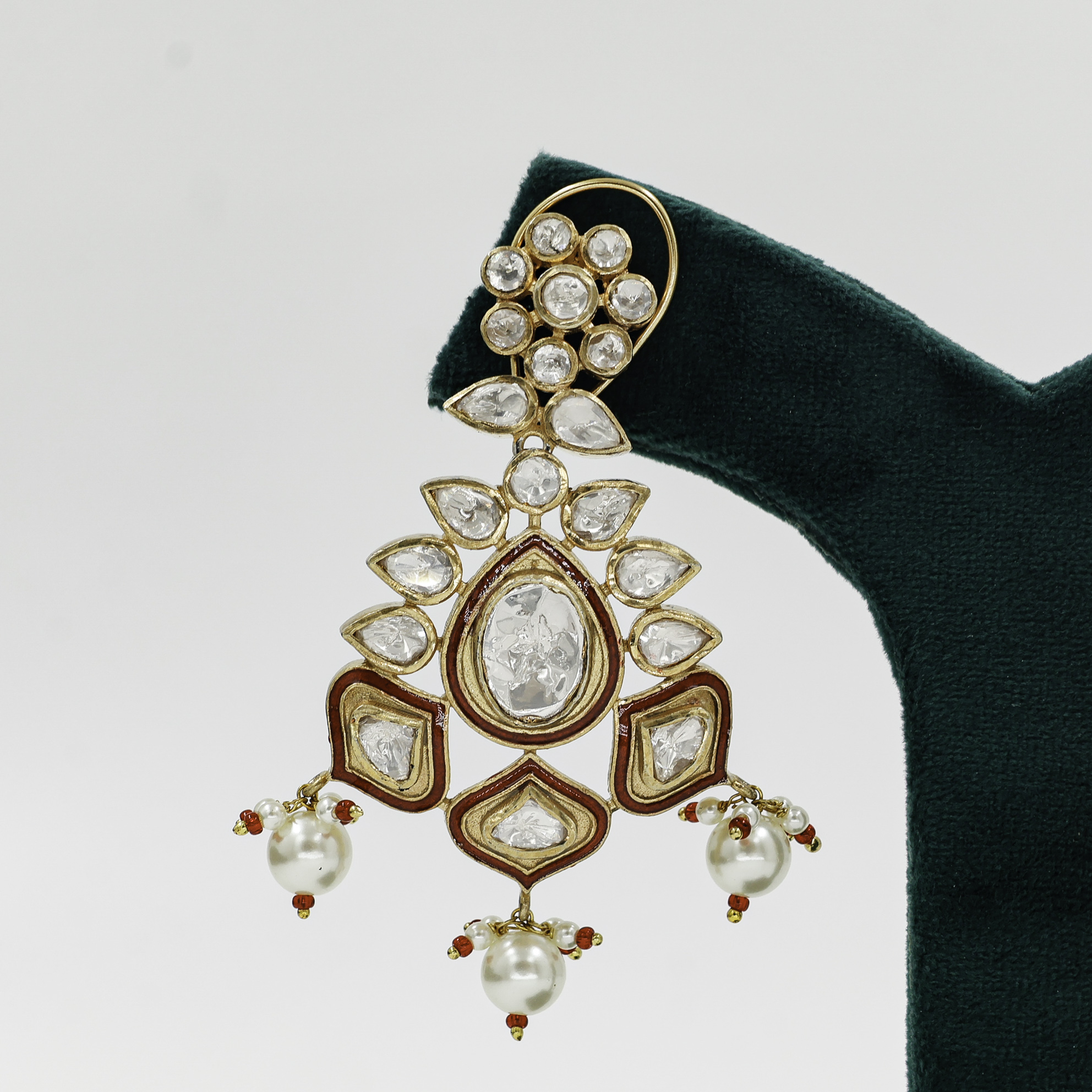 Elegant polki stone drop earrings with pearl accents, perfect for weddings and special occasions. Buy polki drop earrings from Raag Silver Jewellery in Hyderabad.
