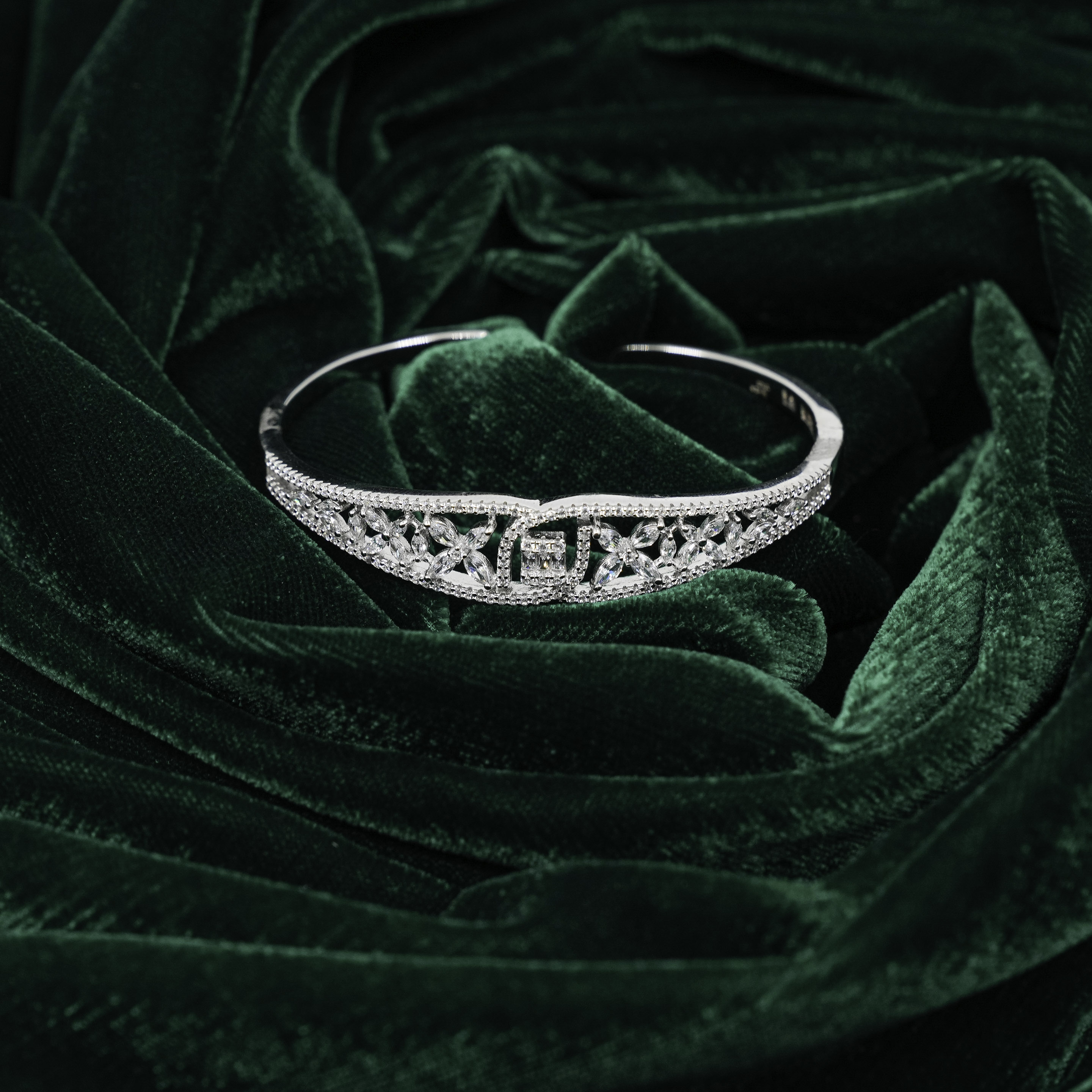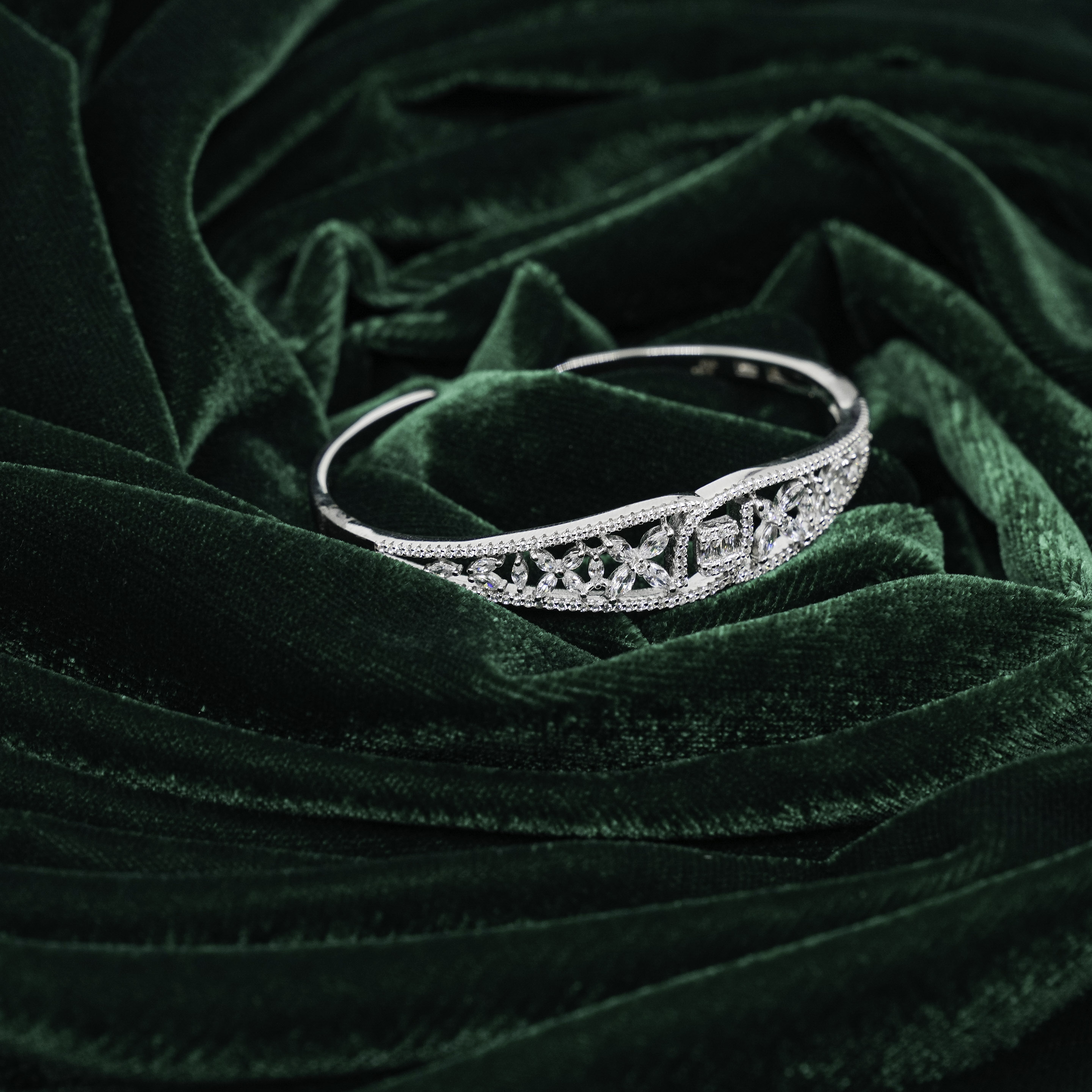 Elegant silver bangle bracelet with intricate detailing, a perfect accessory for any occasion. Buy silver bangle bracelet from Raag Silver Jewellery in Hyderabad.