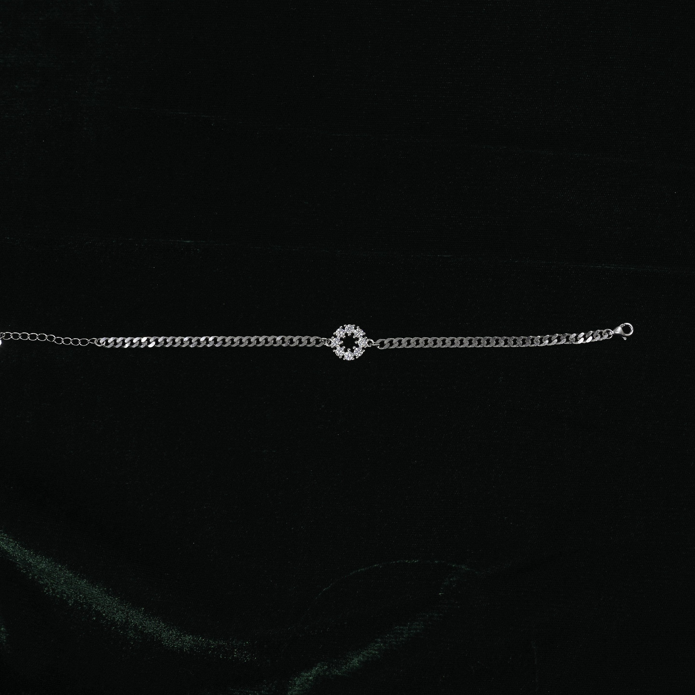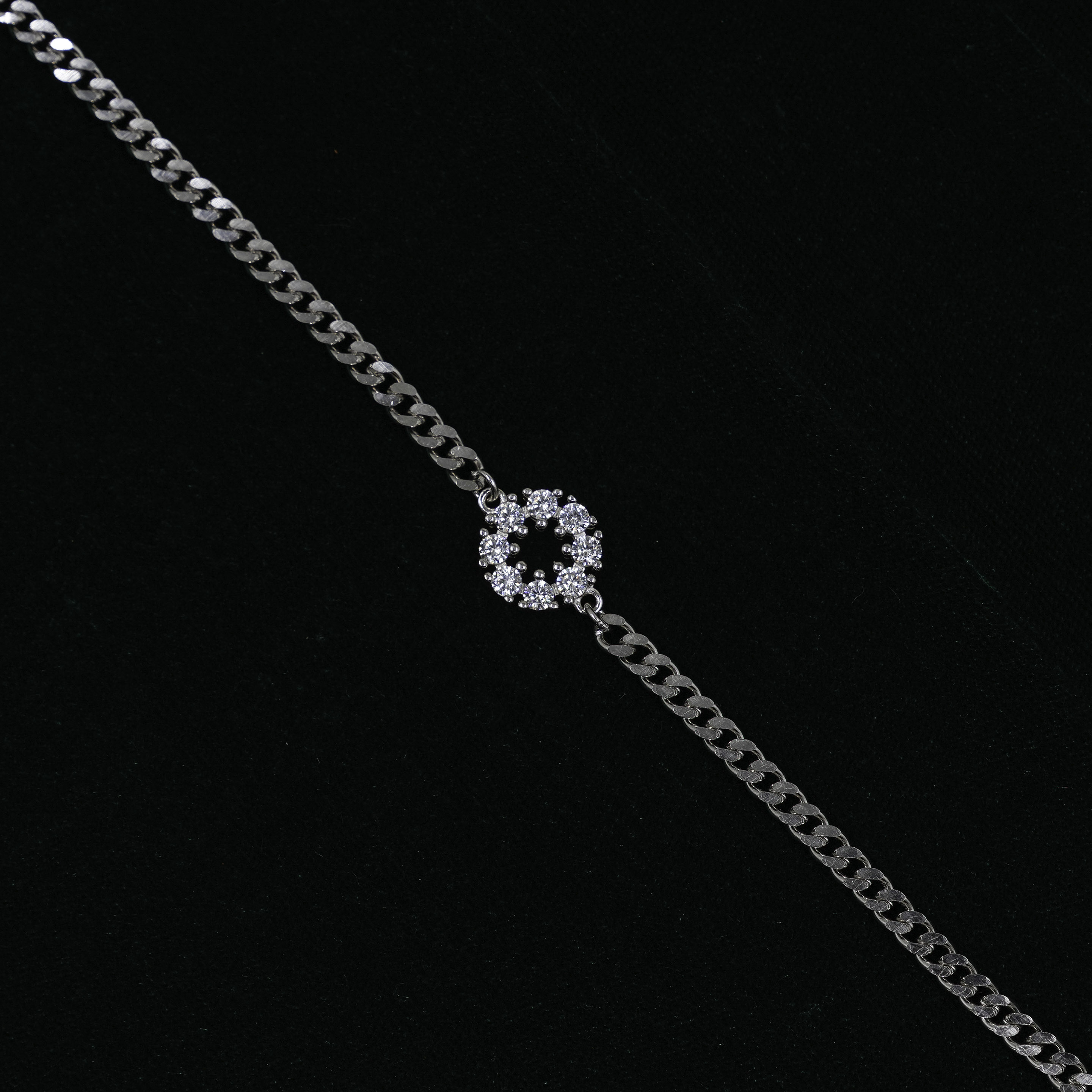 Elegant silver chain bracelet with a central zircon-studded embellishment. Buy Silver Chain Bracelet from Raag Silver Jewellery in Hyderabad.