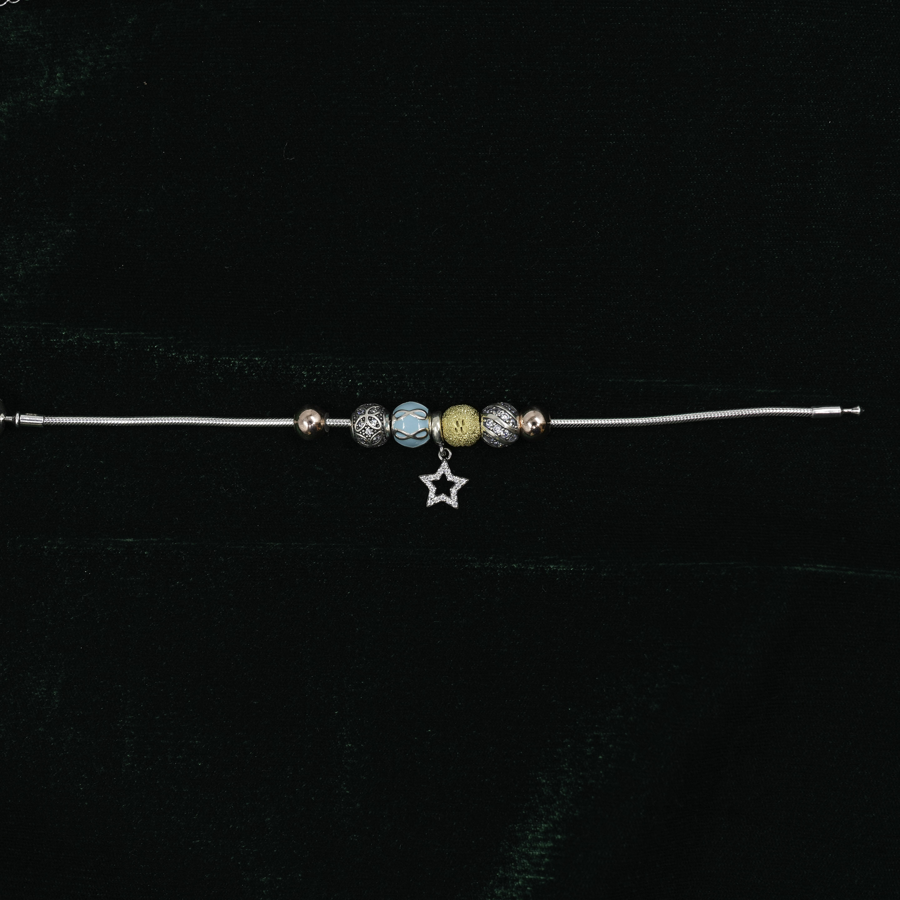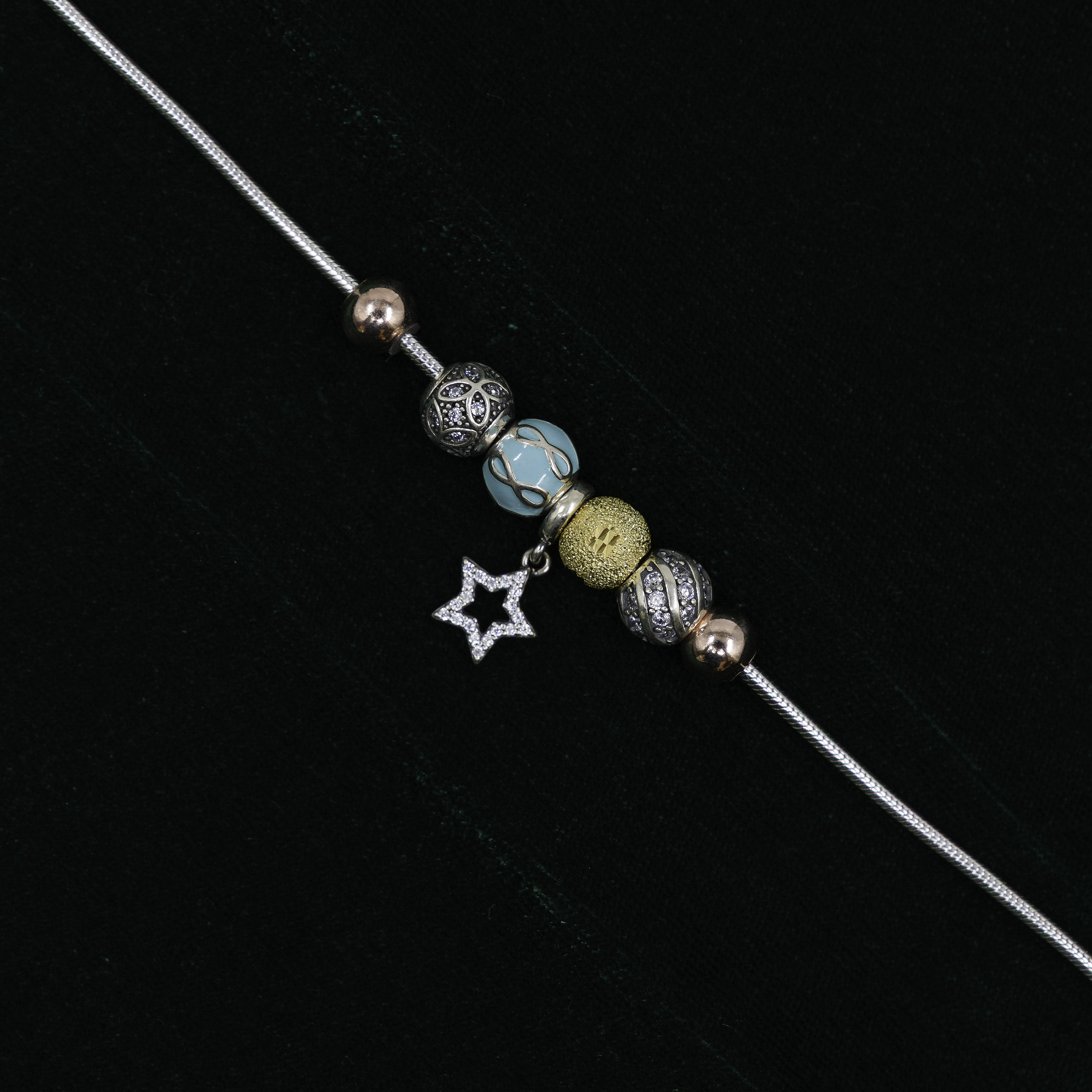 Elegant silver charm bracelet featuring star and bead charms, perfect for any occasion. Buy silver charm bracelet from Raag Silver Jewellery in Hyderabad.