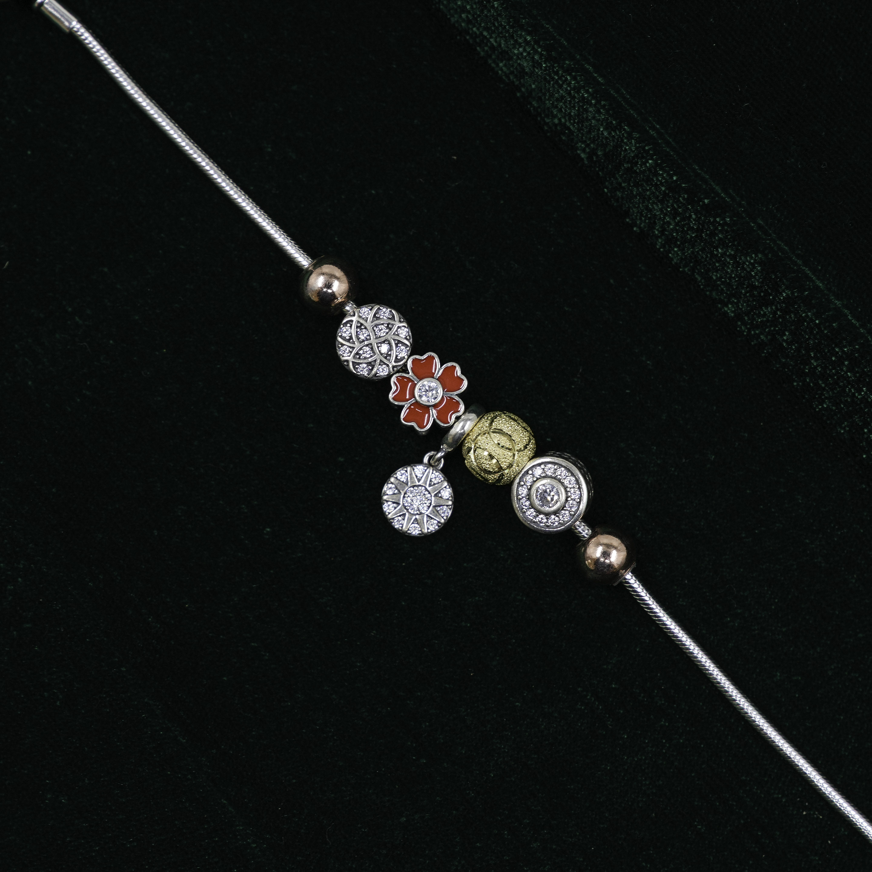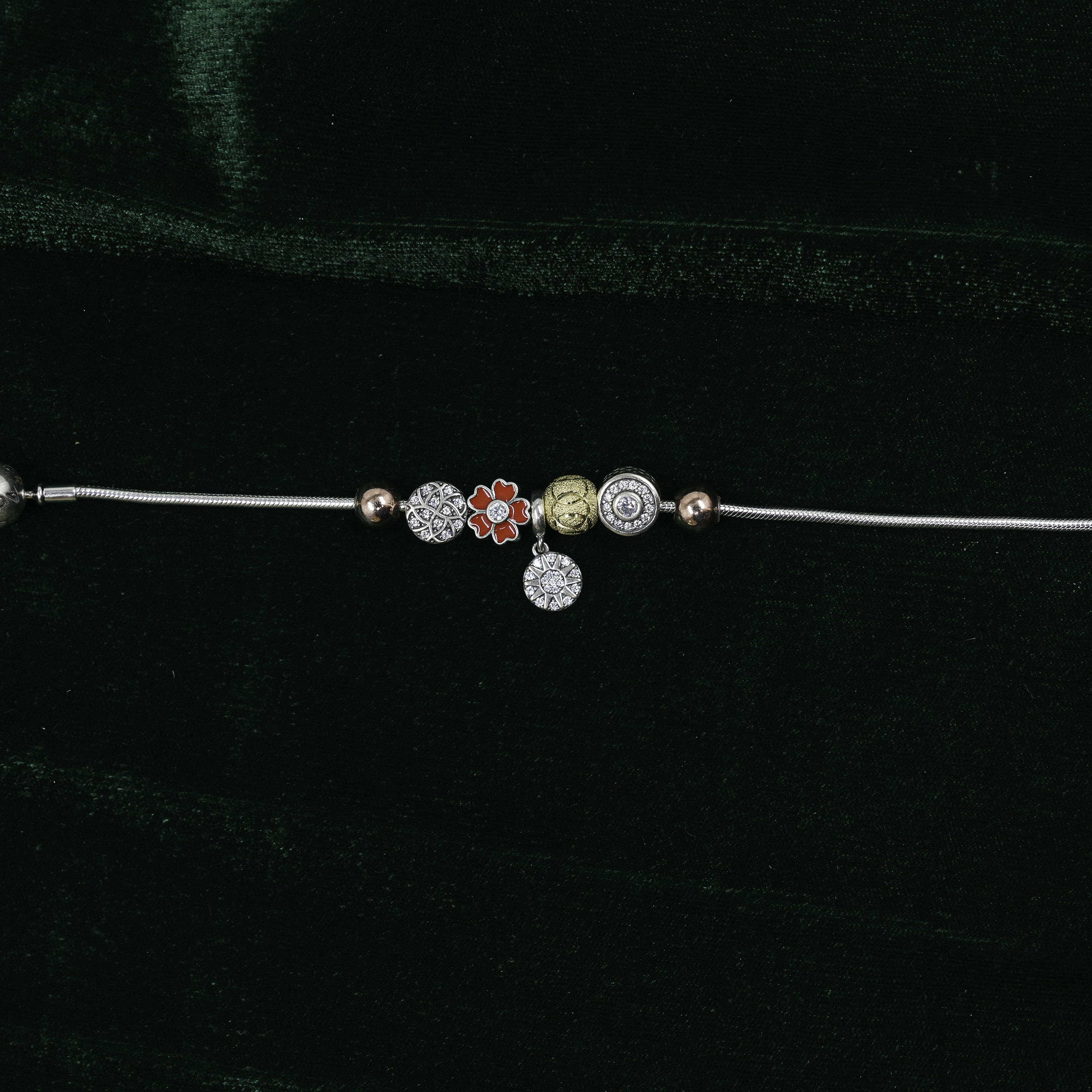 Elegant silver charm bracelet with intricate details, perfect for everyday wear. Buy Silver Charm Bracelet from Raag Silver Jewellery in Hyderabad.
