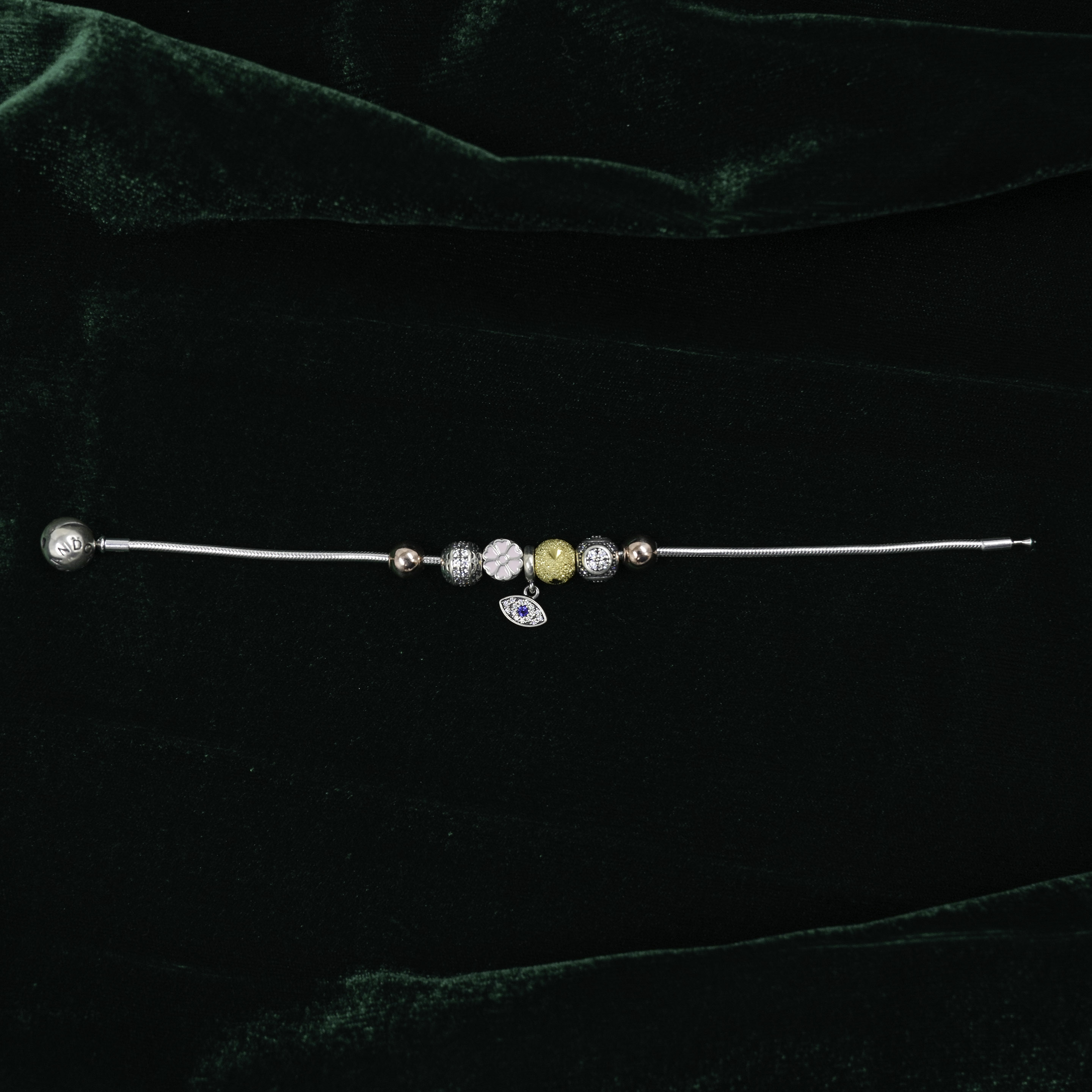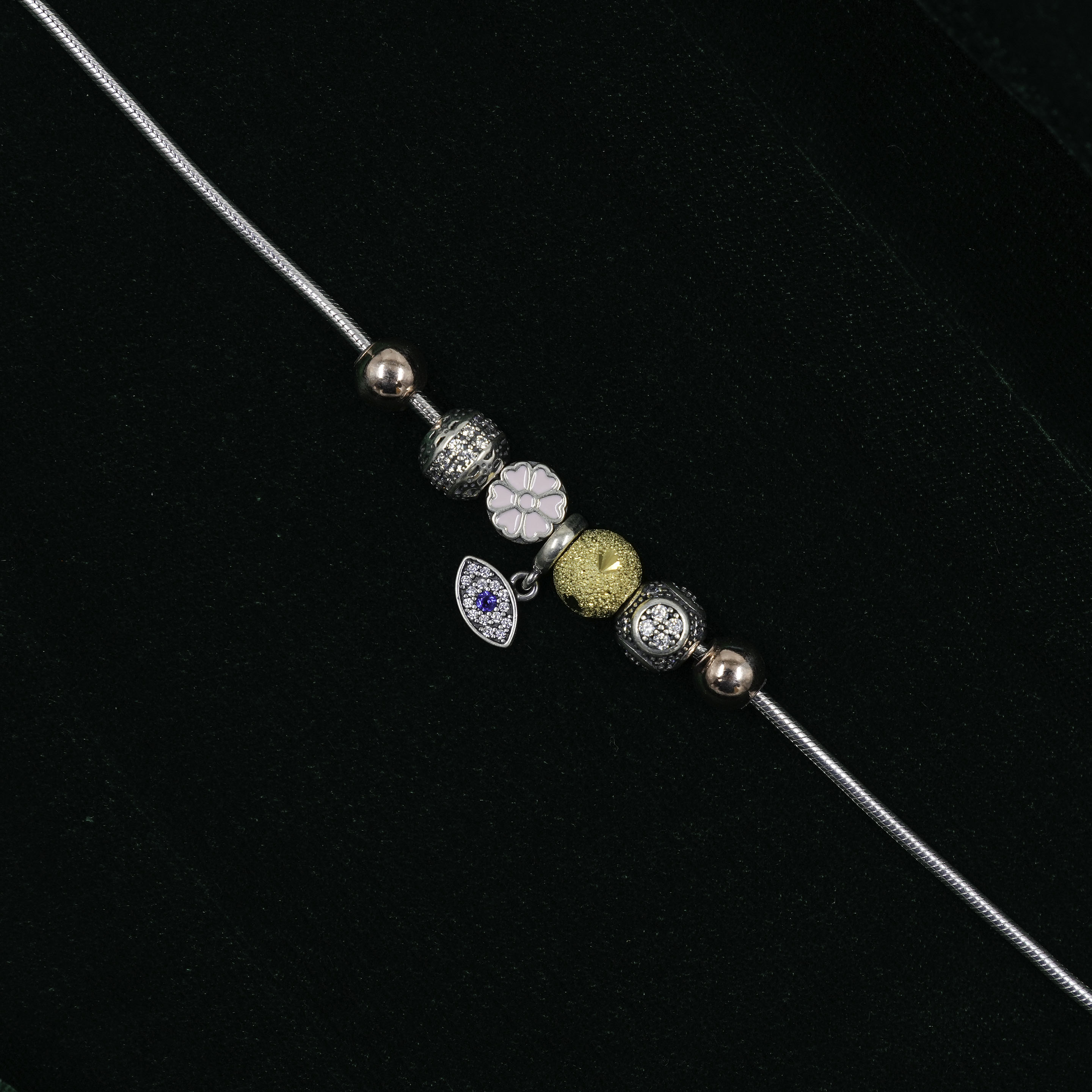 Elegant silver charm bracelet adorned with unique charms, perfect for personal expression. Buy Silver Charm Bracelet from Raag Silver Jewellery in Hyderabad.