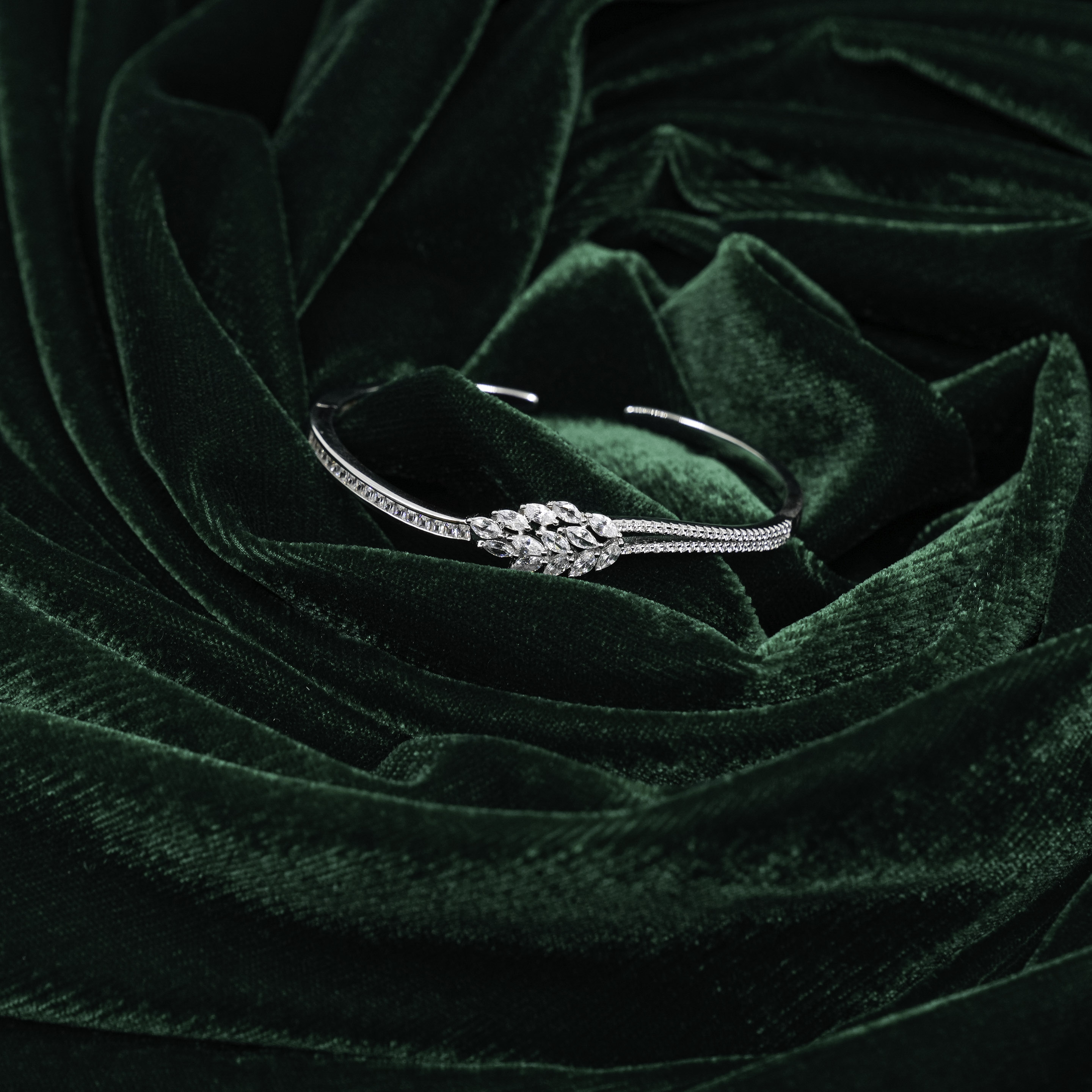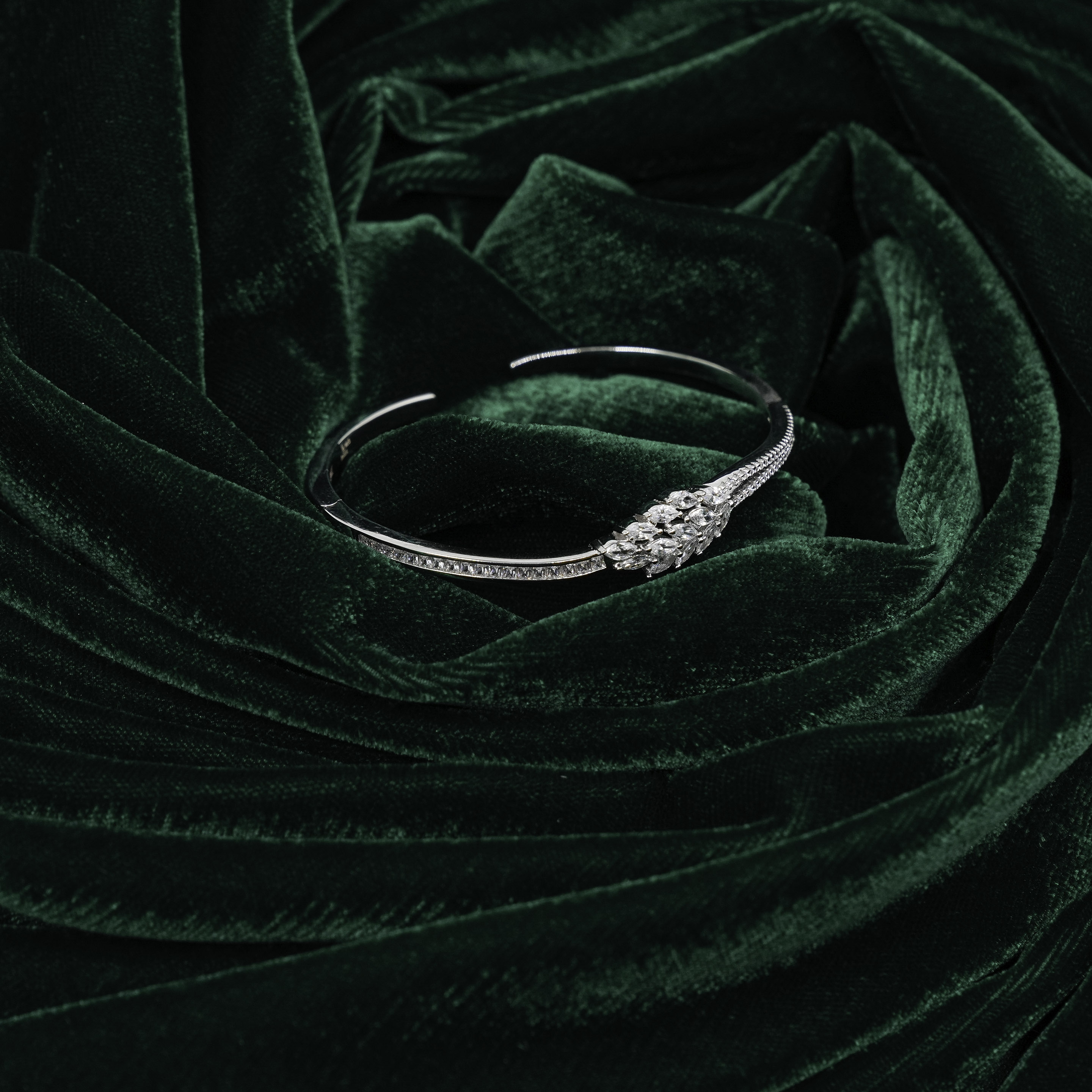 Elegant sterling silver cuff bracelet studded with zircons, perfect for parties and gifting. Buy silver cuff bracelet from Raag Silver Jewellery in Hyderabad.