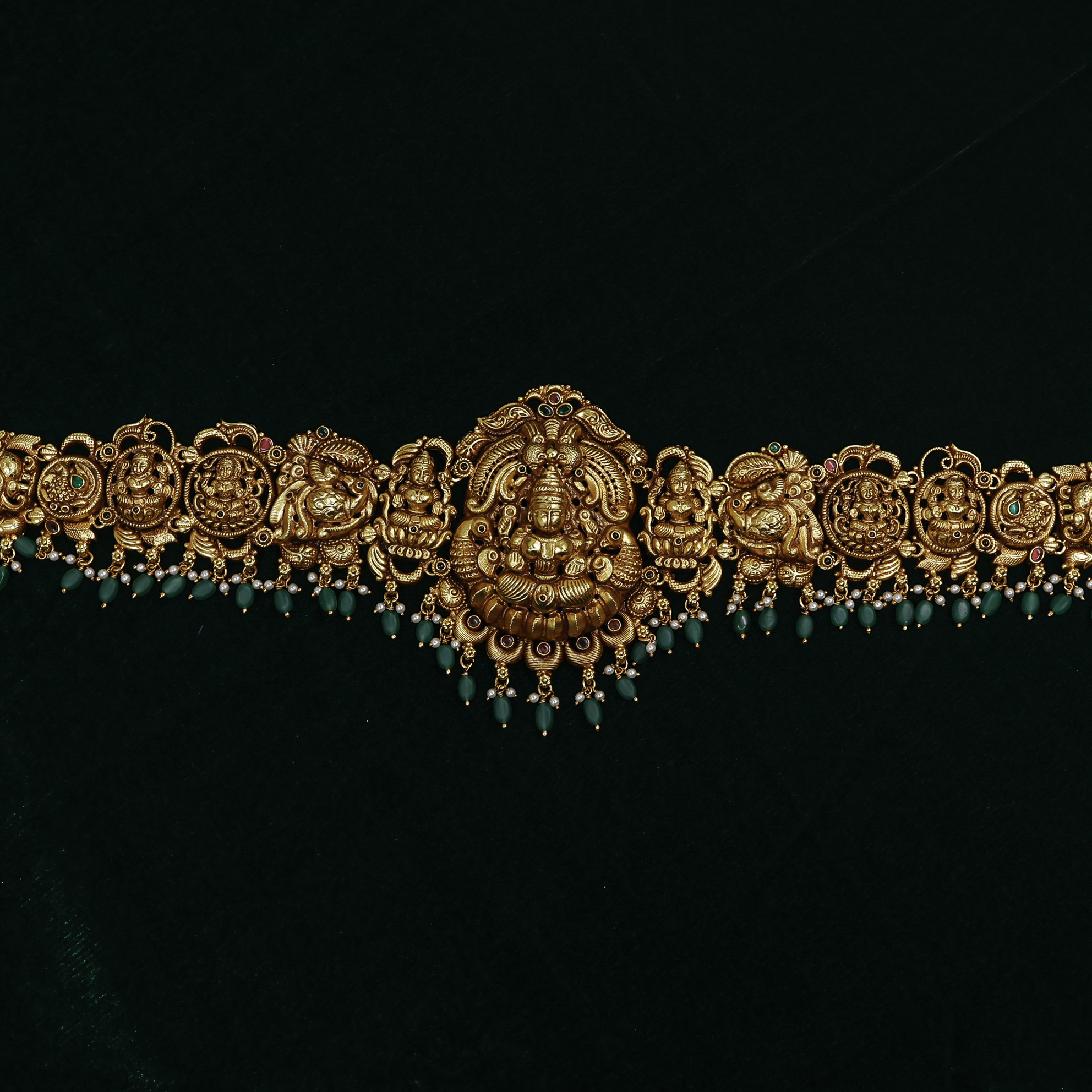 Ornate Silver Lakshmi belt, handcrafted with deity motifs, perfect for traditional occasions. Buy Silver Lakshmi Belt from Raag Silver Jewellery in Hyderabad.
