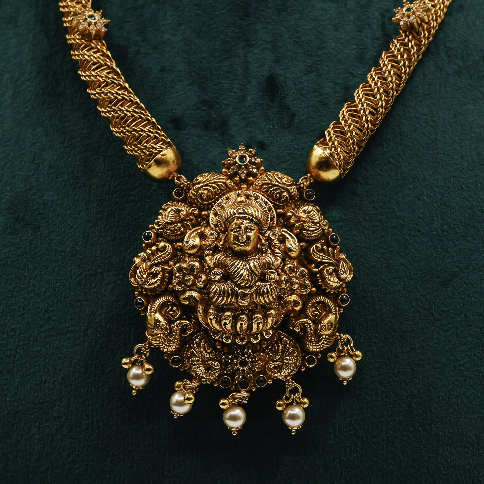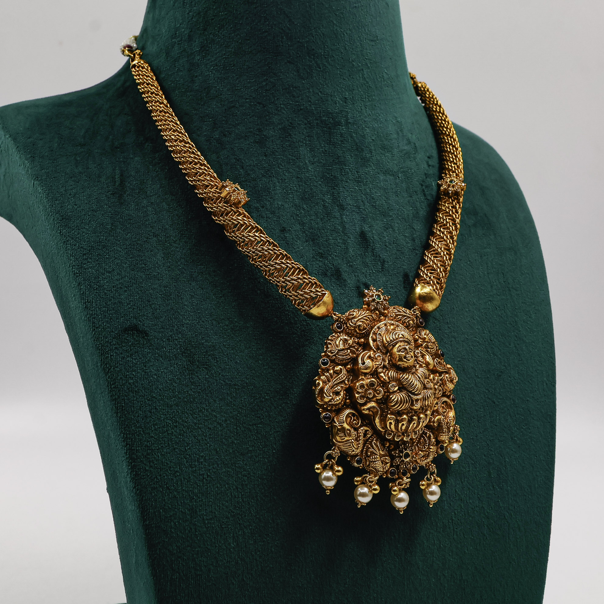Antique silver Lakshmi pendant necklace, embodying traditional Indian design and spirituality. Buy Silver Lakshmi Necklace from Raag Silver Jewellery in Hyderabad.