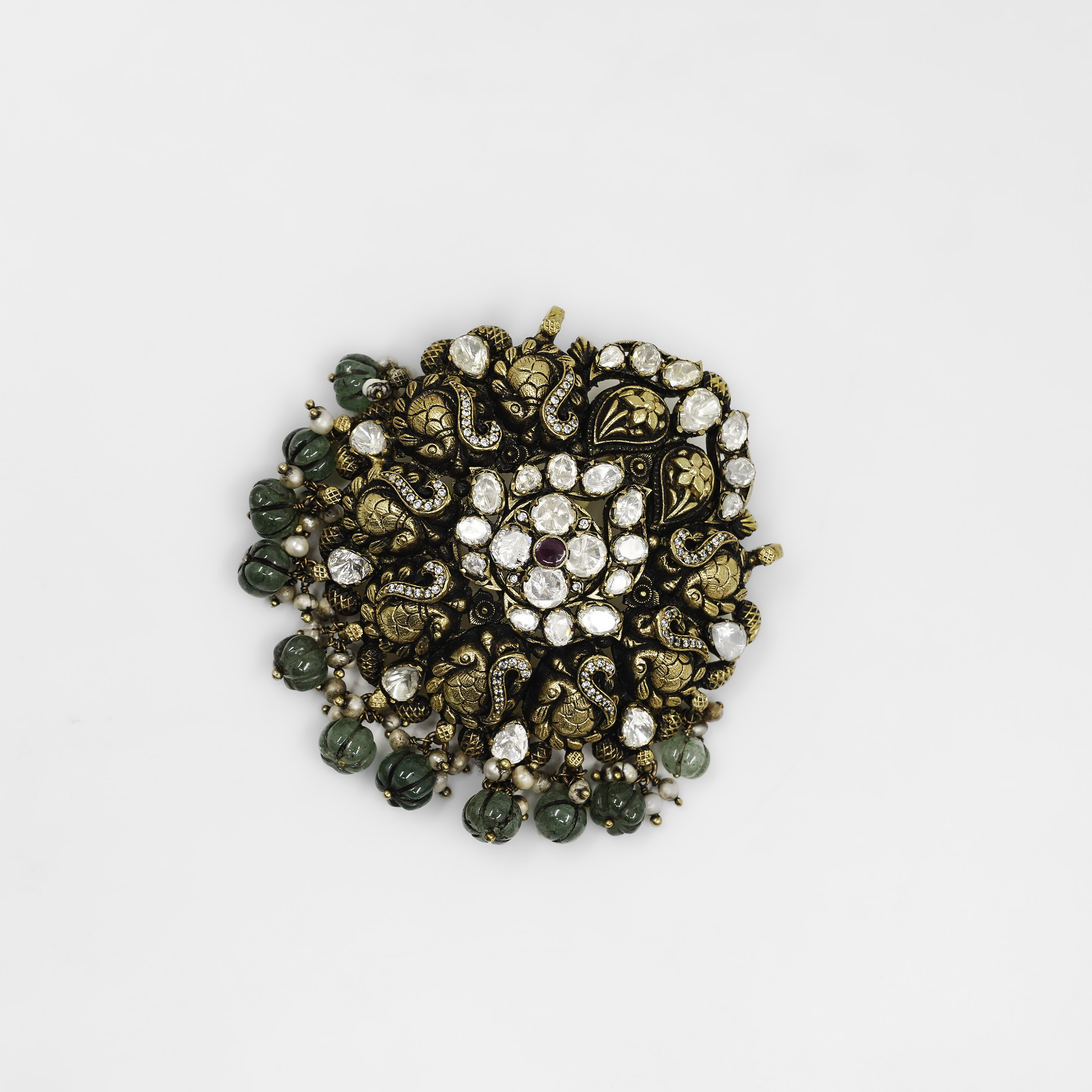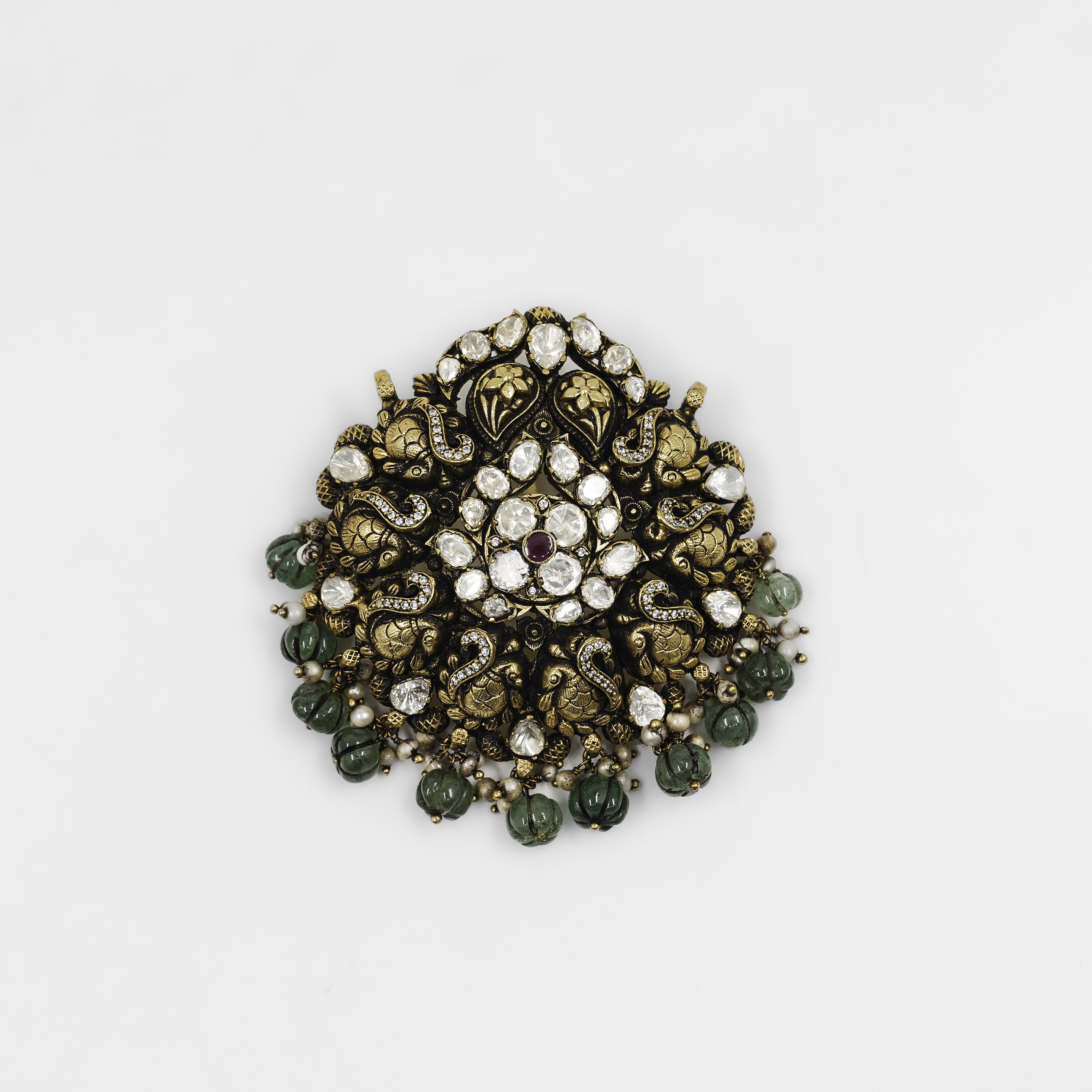 Elegant silver peacock pendant with intricate gemstone detailing. A perfect addition to your collection. Buy silver peacock pendant from Raag Silver Jewellery in Hyderabad.