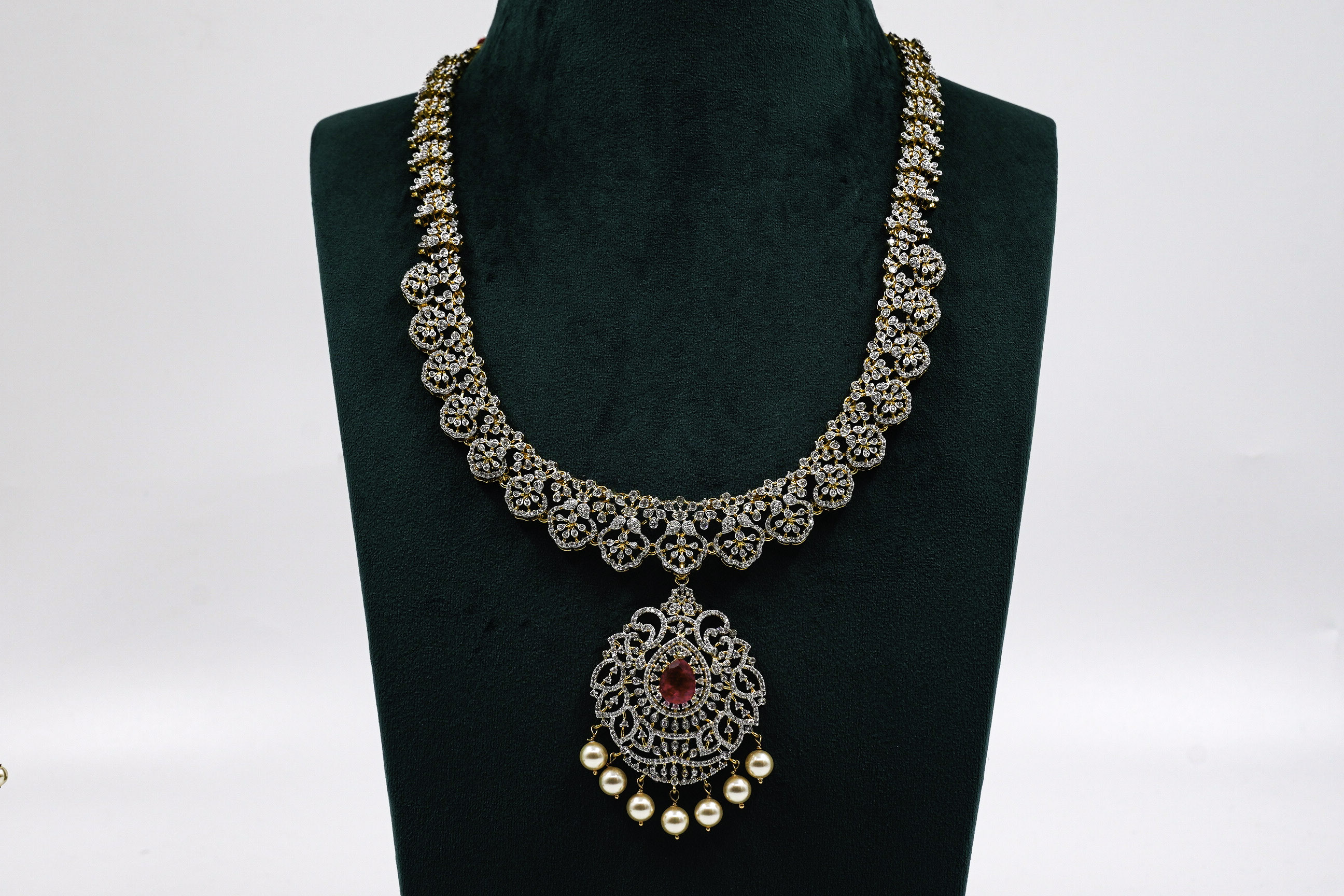 Elegant silver ruby necklace with intricate detailing, perfect for weddings and special occasions. Buy silver ruby necklace from Raag Silver Jewellery in Hyderabad.
