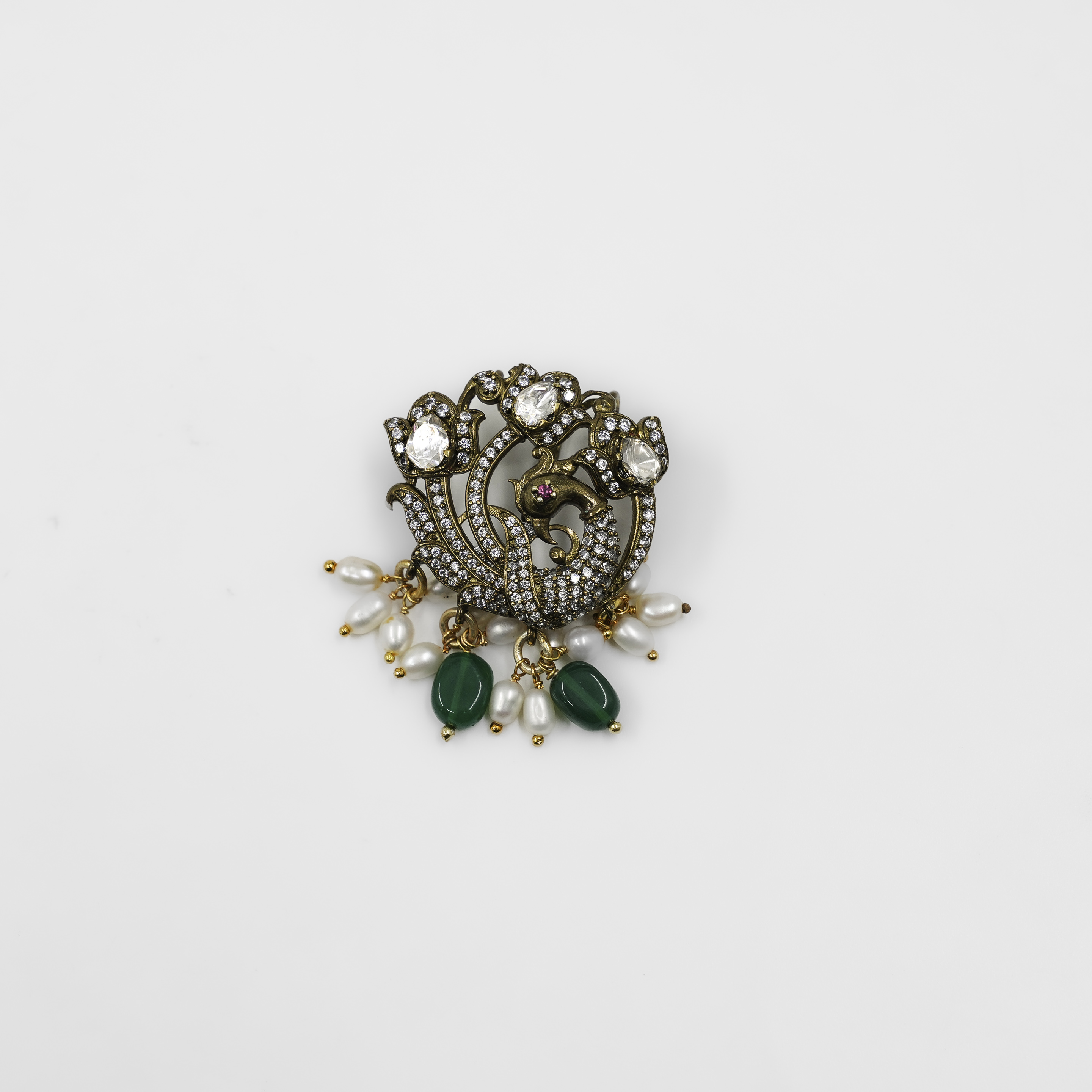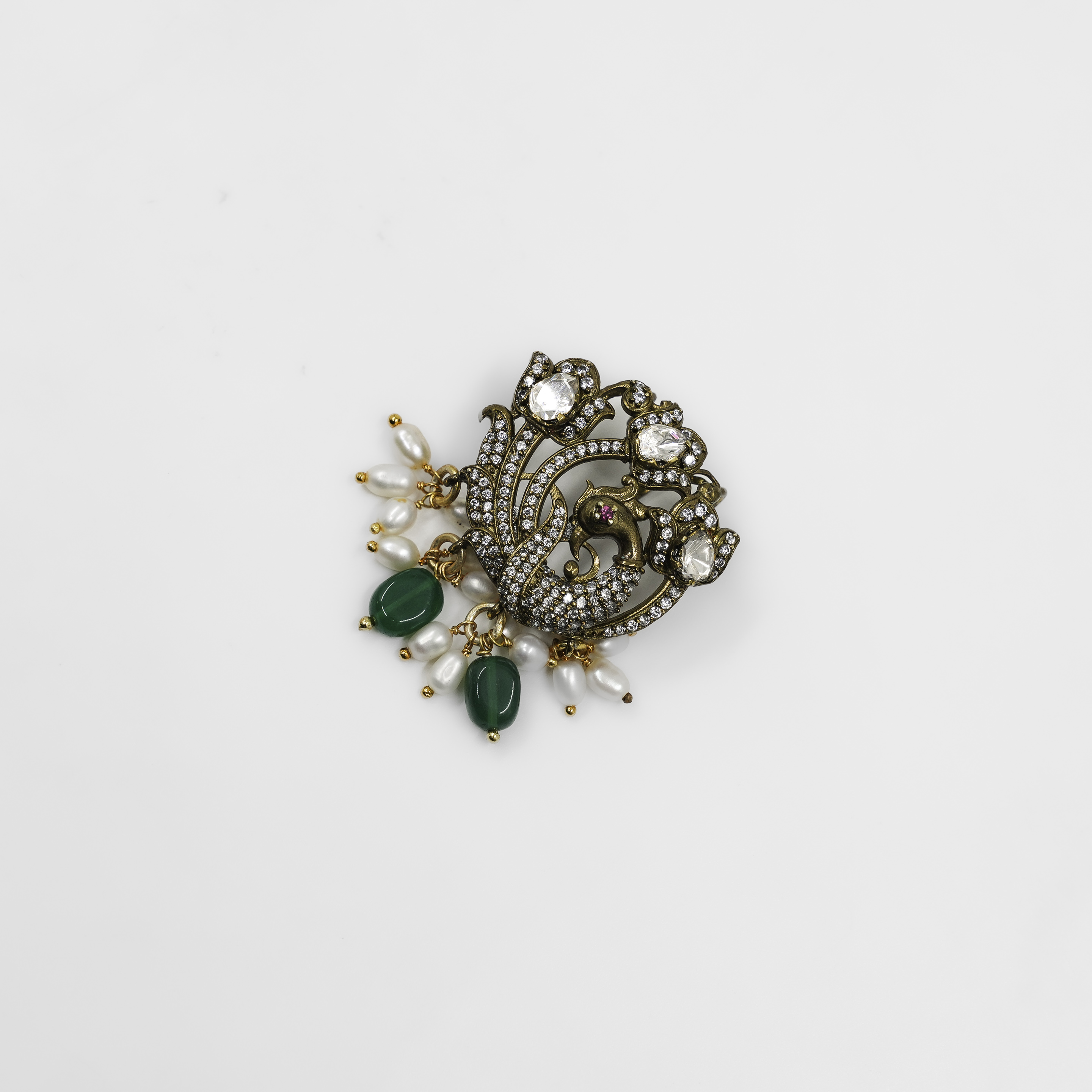 Intricate silver stone brooch with pink accents, perfect for adding a touch of elegance. Buy Silver Stone Brooch from Raag Silver Jewellery in Hyderabad.