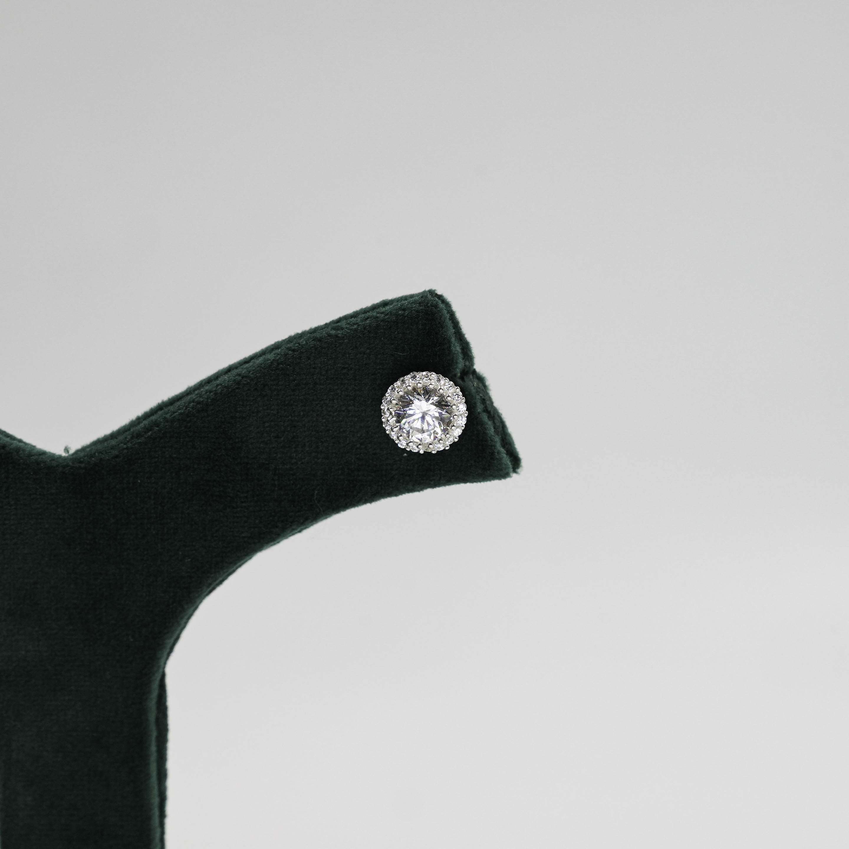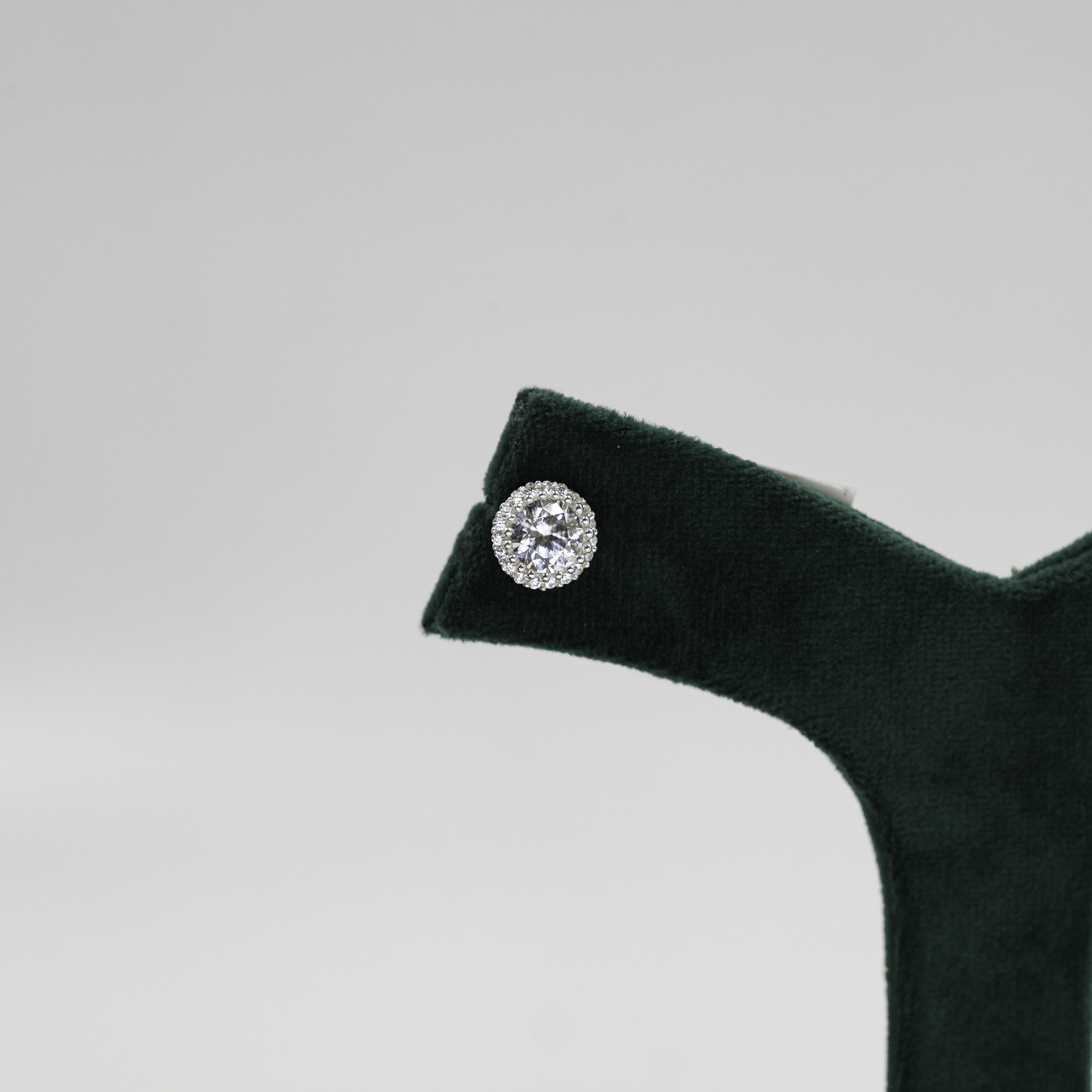 Elegant silver stud earrings with a floral halo design, perfect for daily wear and special occasions. Buy silver stud earrings from Raag Silver Jewellery in Hyderabad.