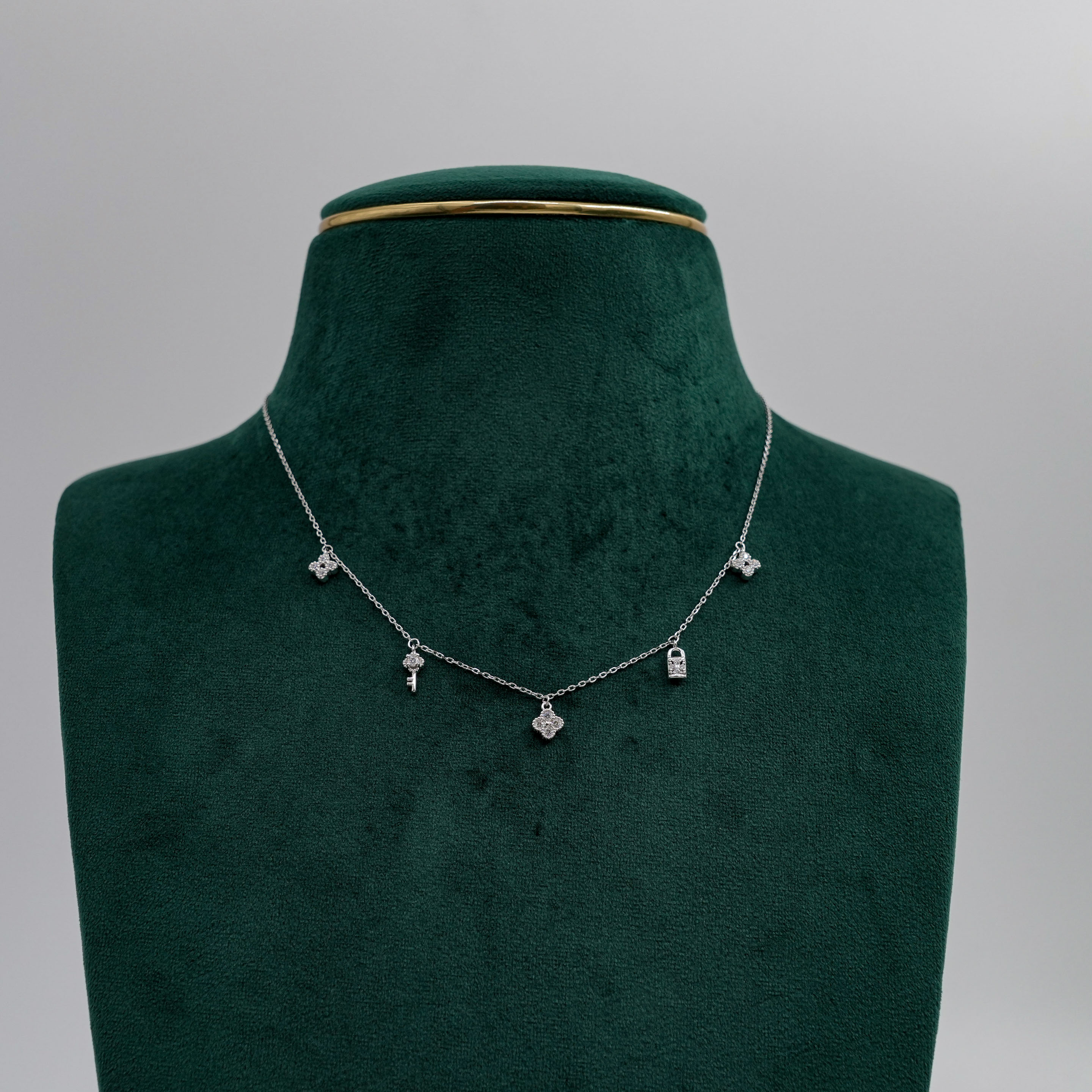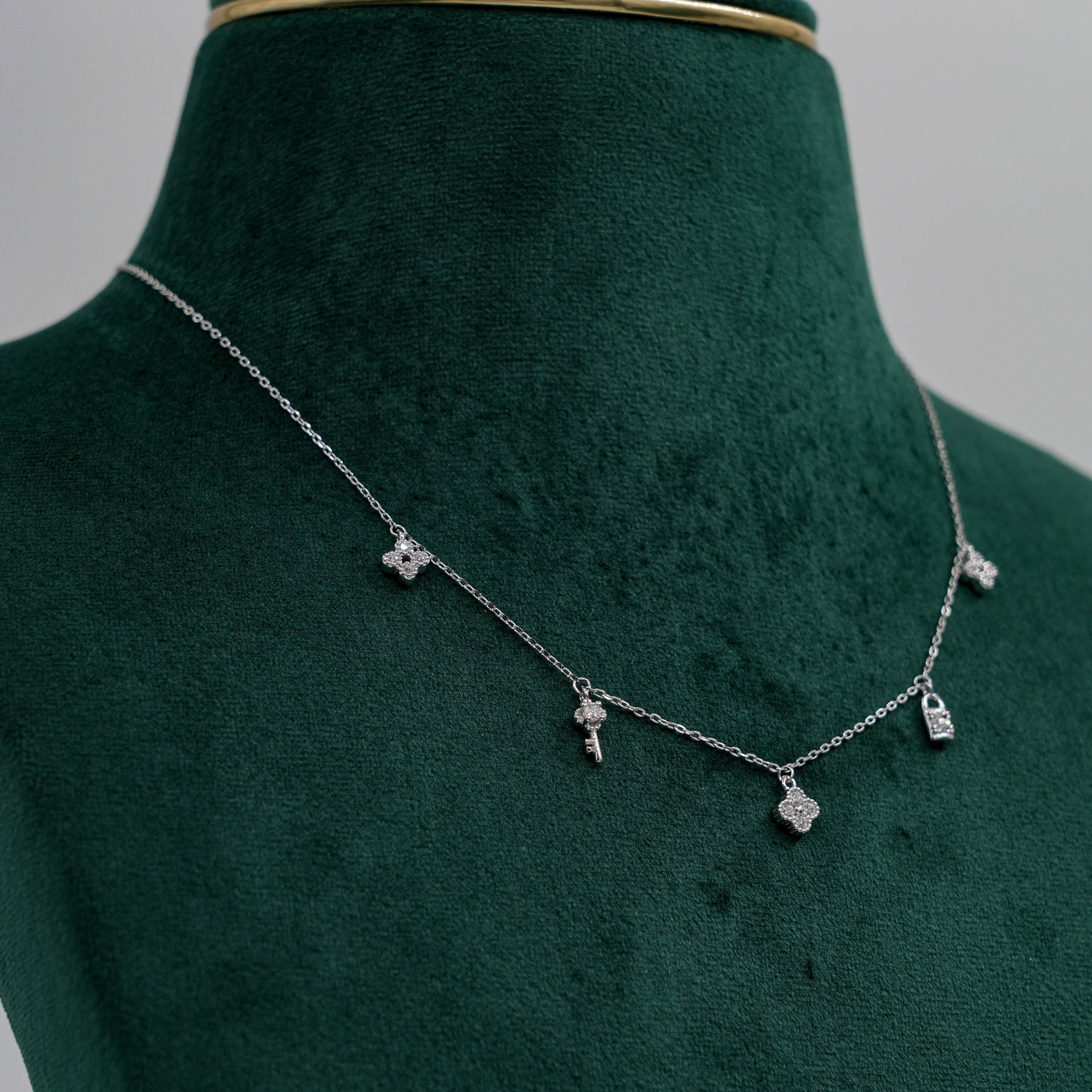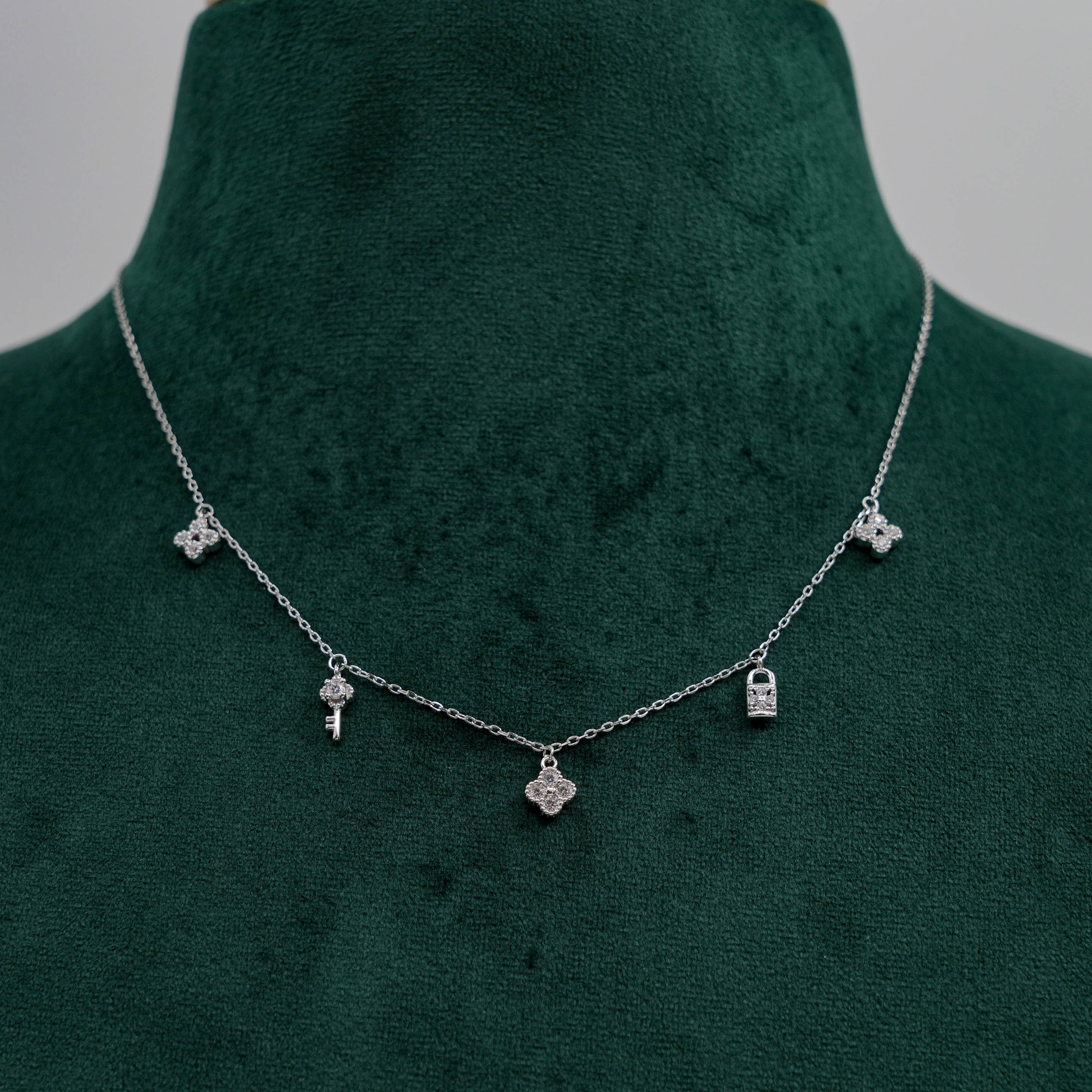 Delicate silver charm Necklace with key, lock, and floral clover pendants. Perfect for everyday wear. Buy silver charm Necklace from Raag Silver Jewellery in Hyderabad.