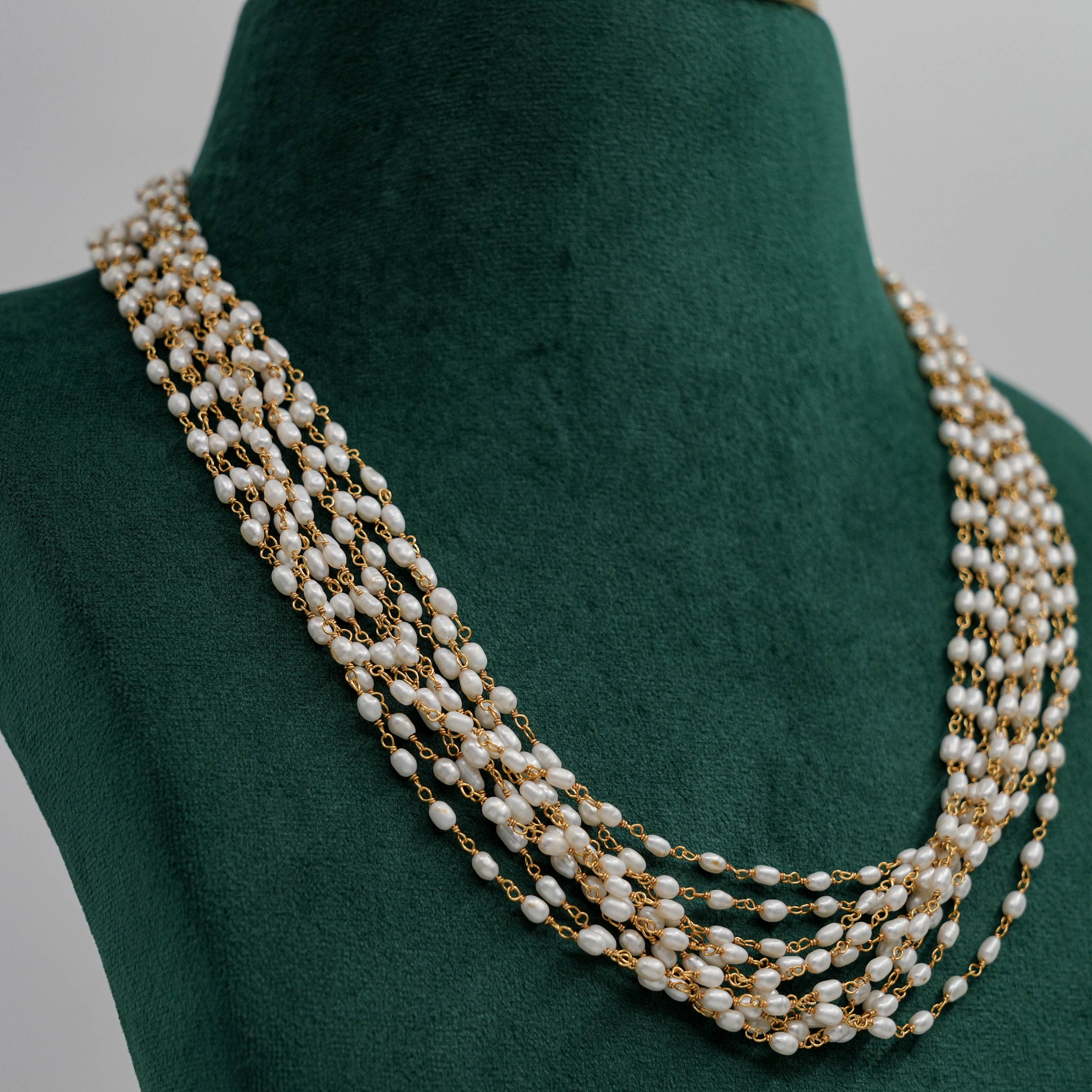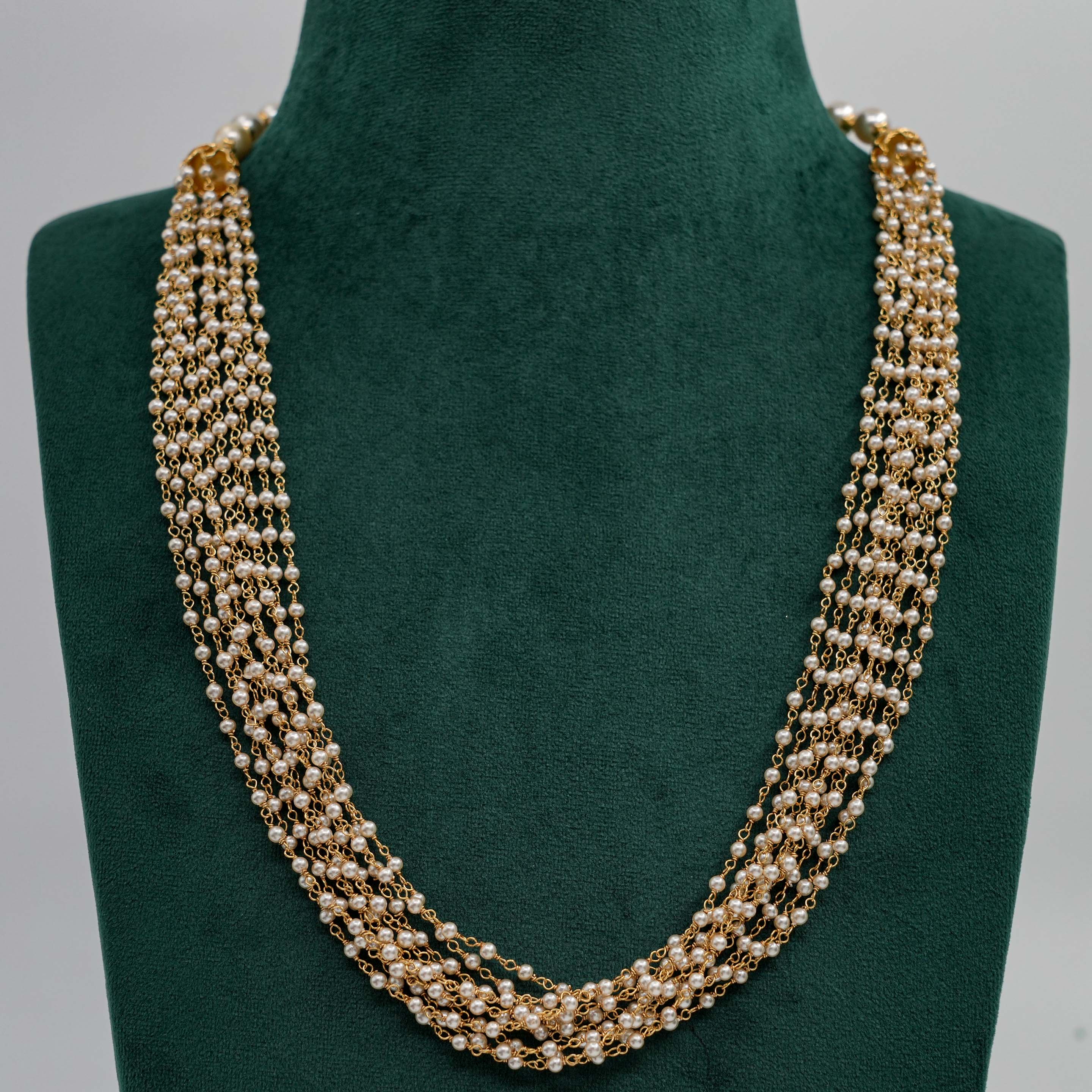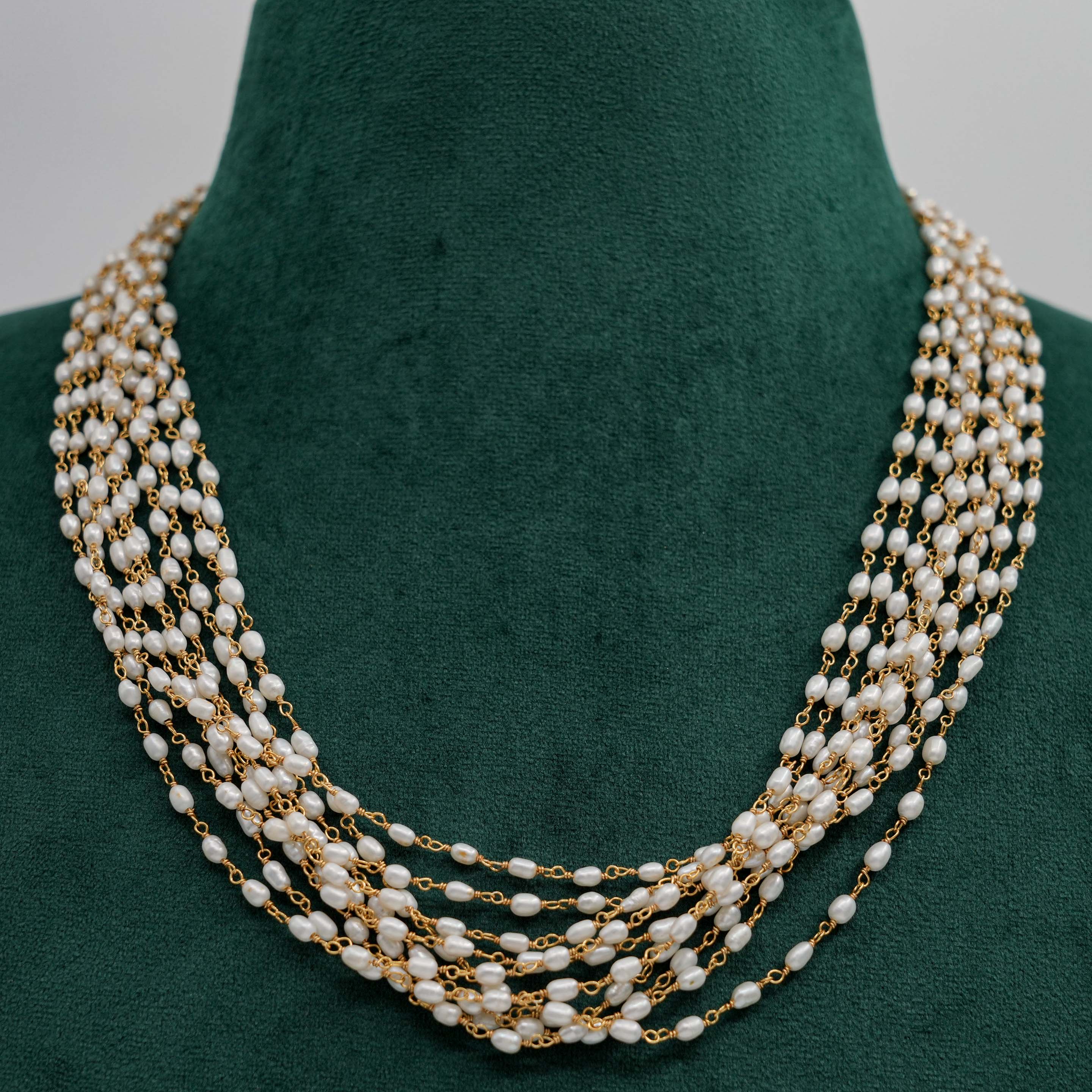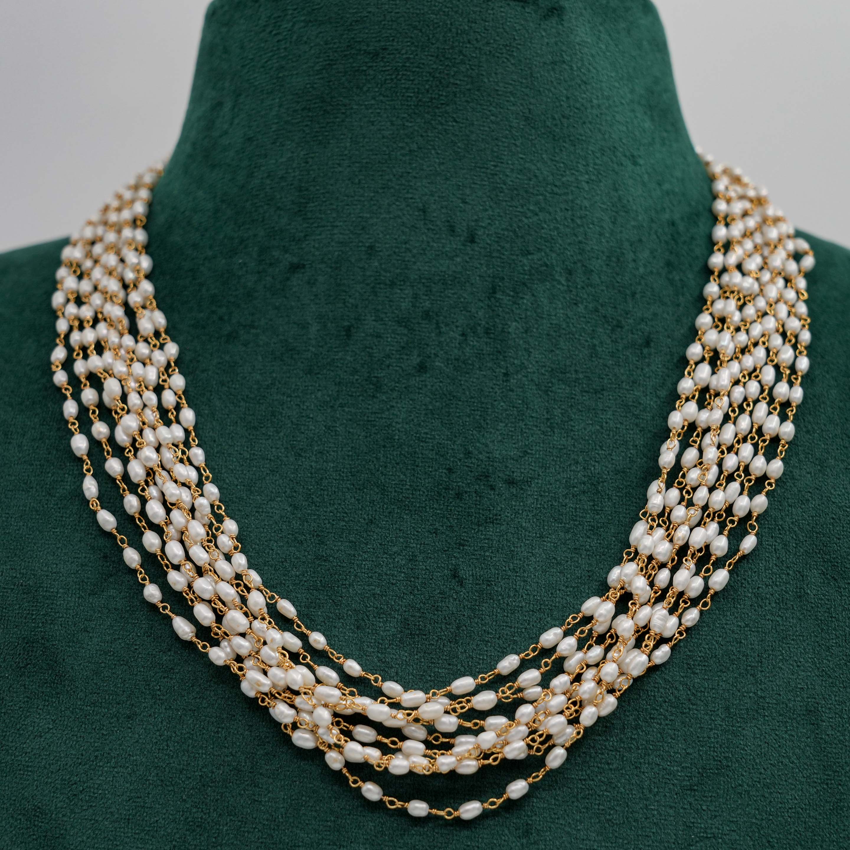 Elegant pearl strand Necklace with delicate gold chain accents, perfect for formal events. Buy pearl strand Necklace from Raag Silver Jewellery in Hyderabad.