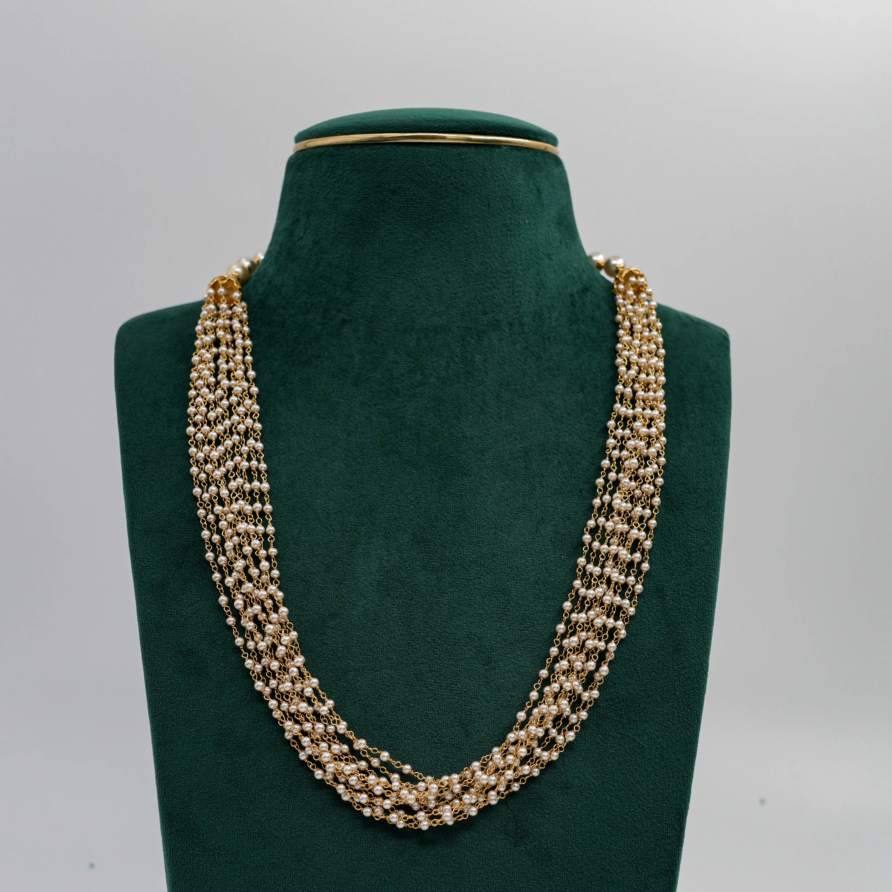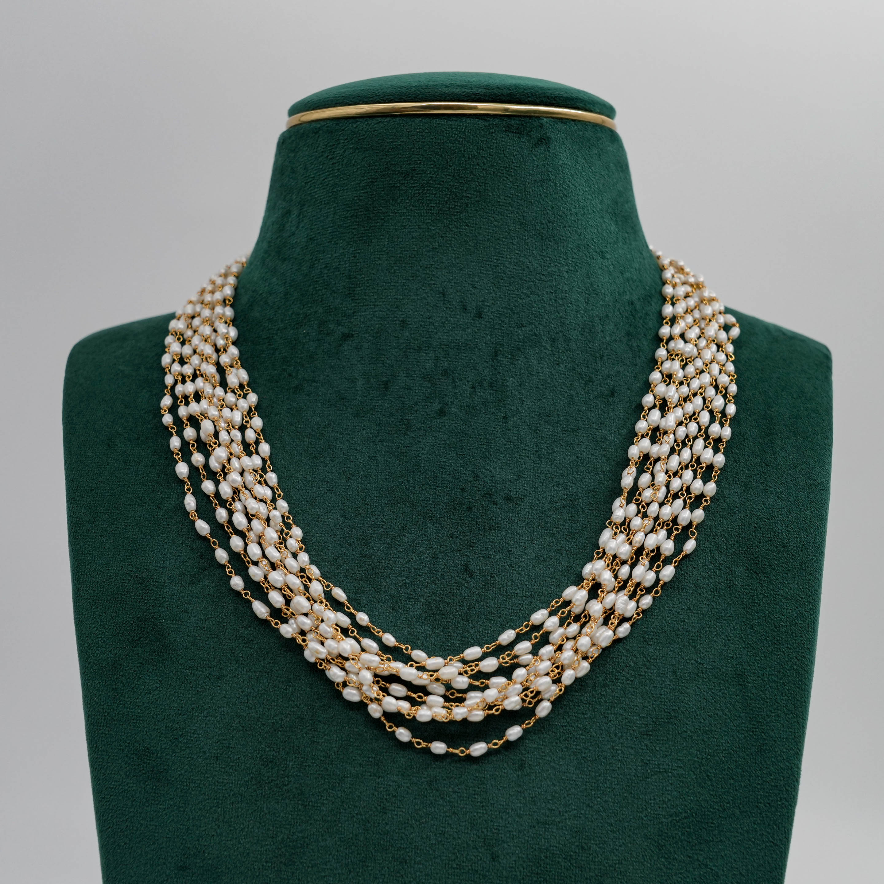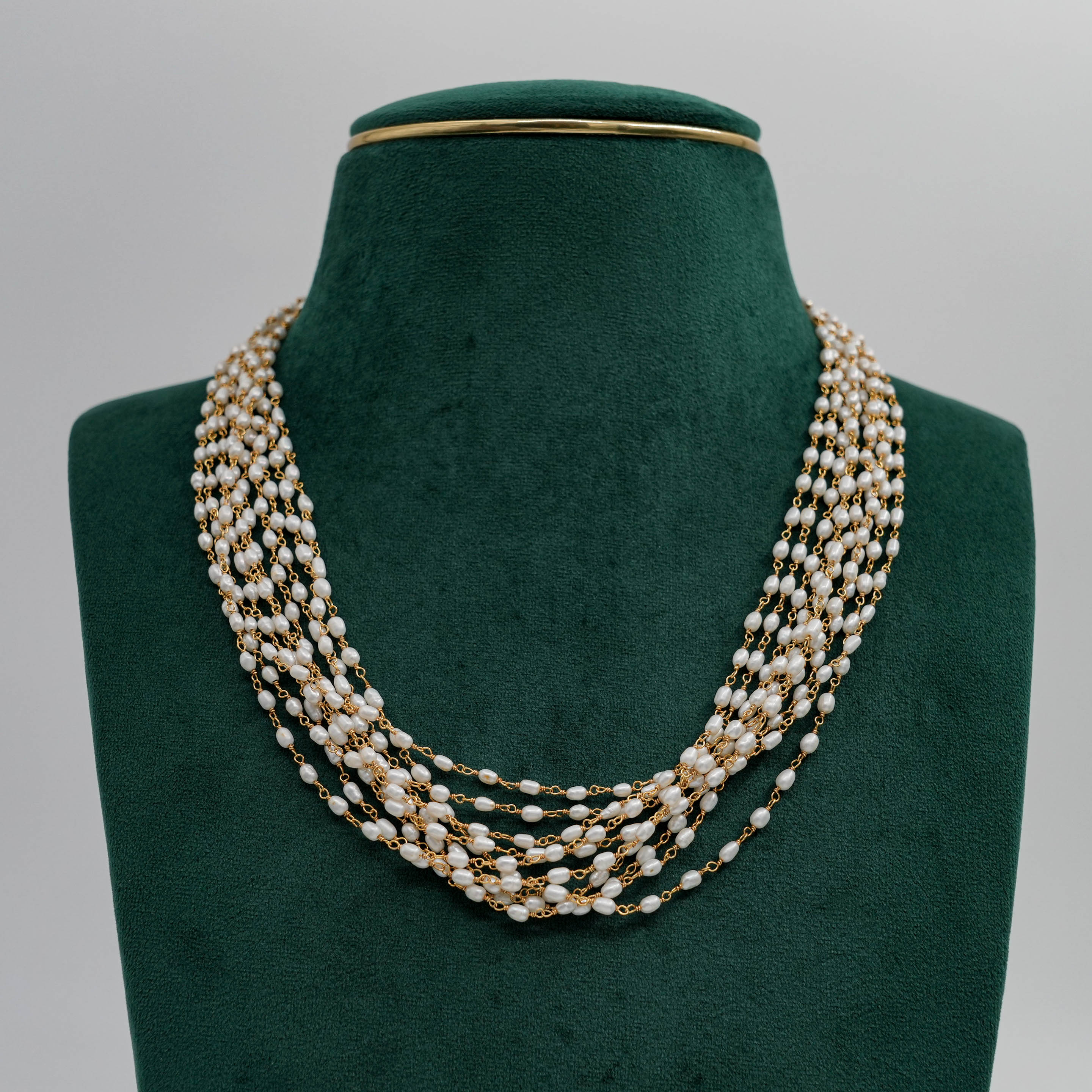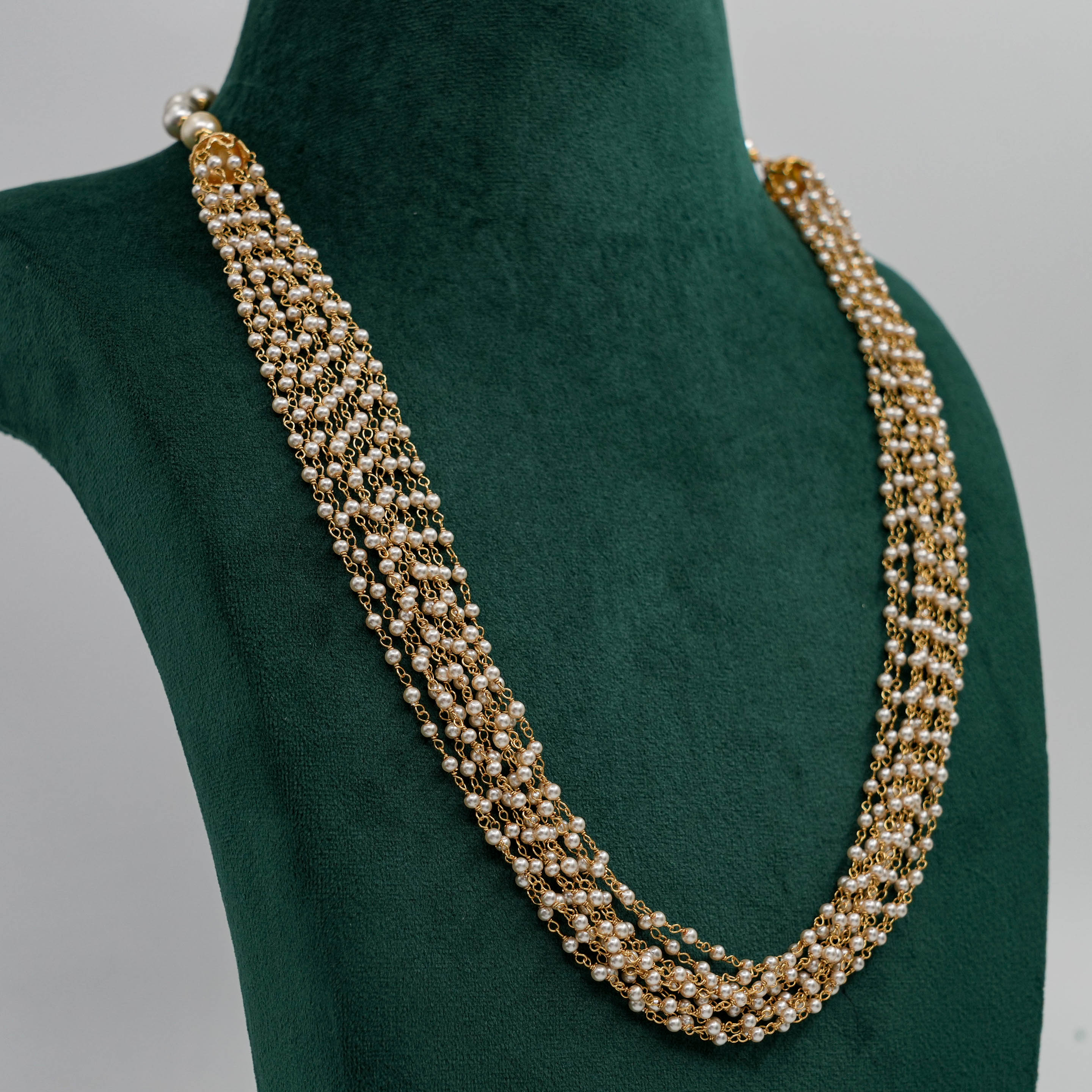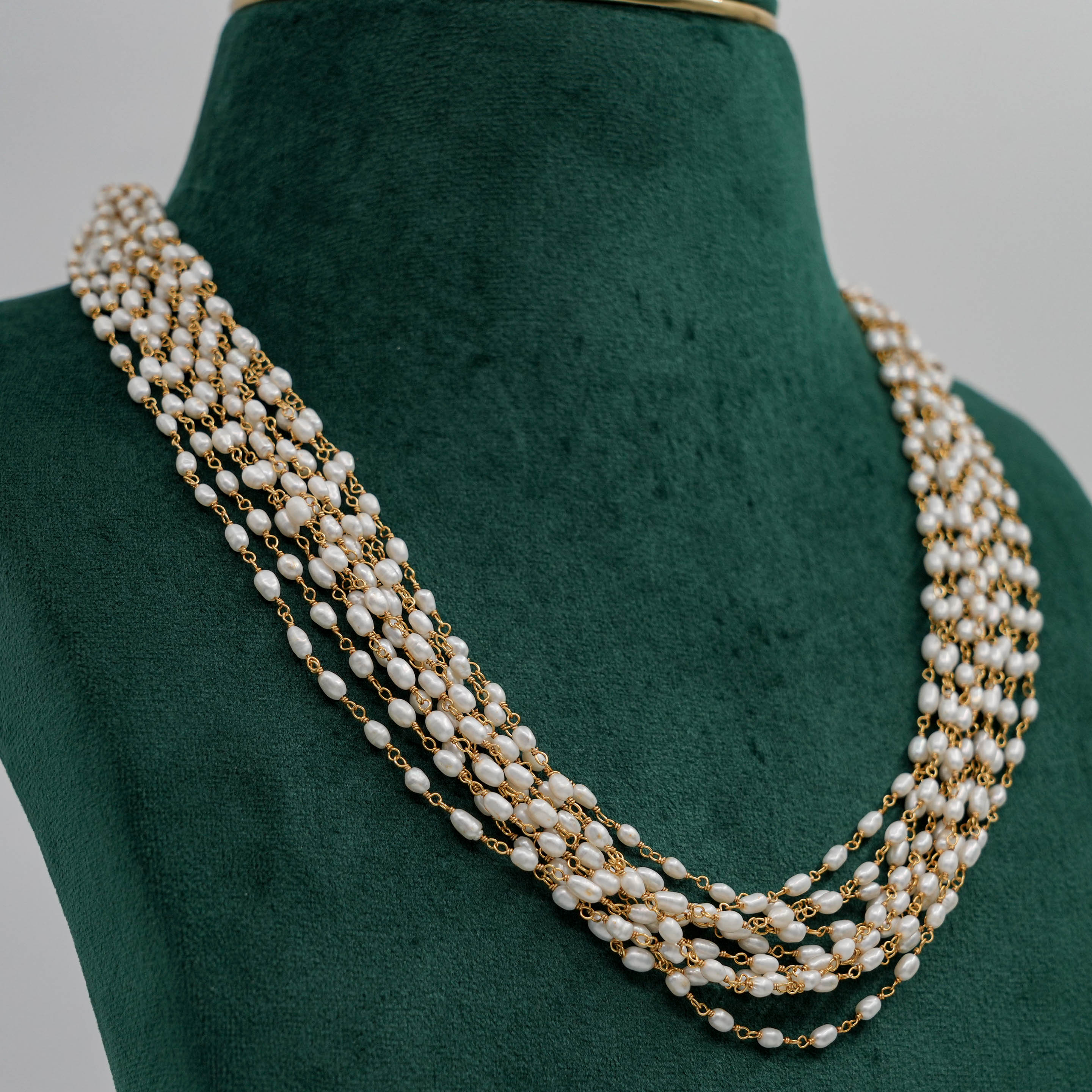 Elegant pearl strand Necklace with delicate gold chain accents, perfect for formal events. Buy pearl strand Necklace from Raag Silver Jewellery in Hyderabad.