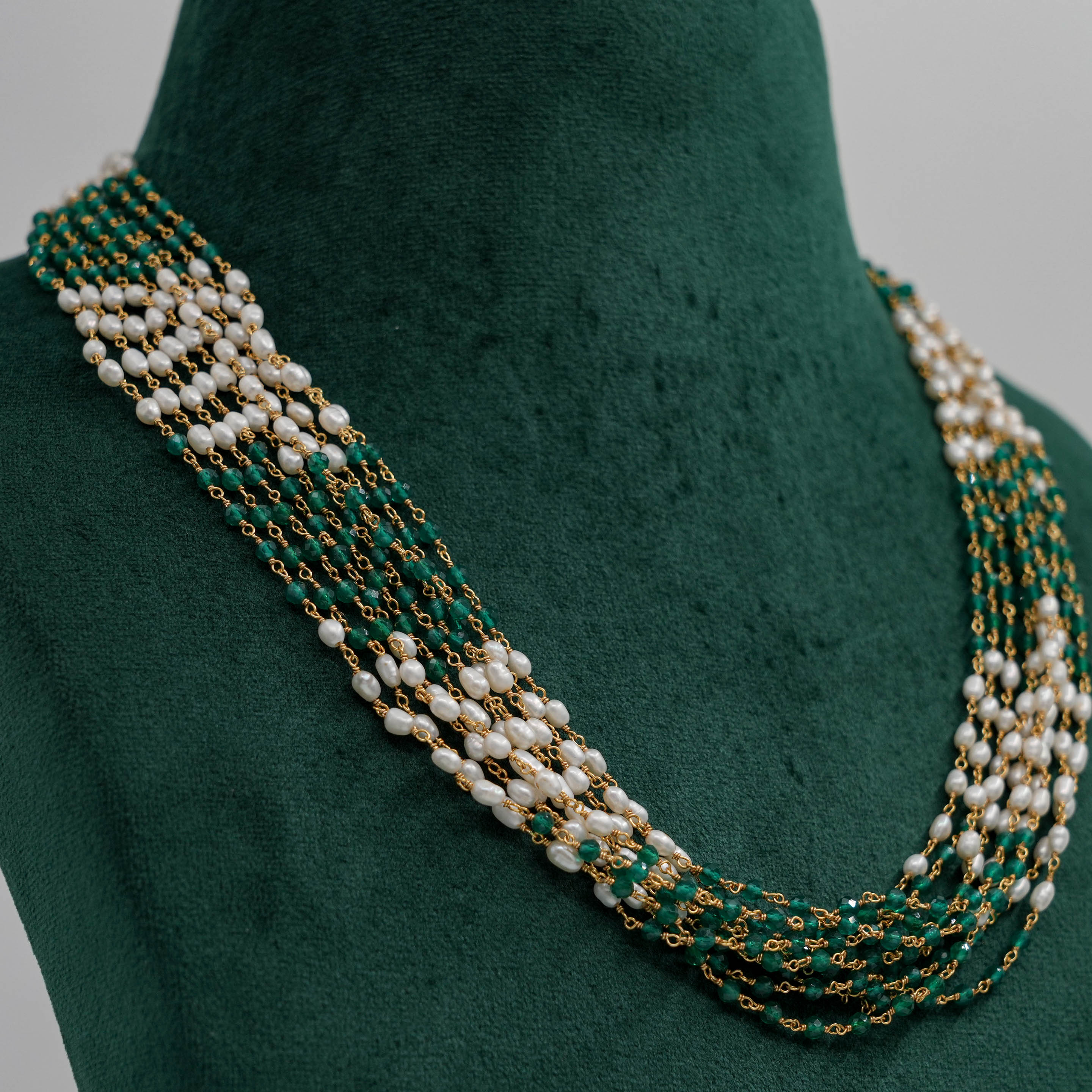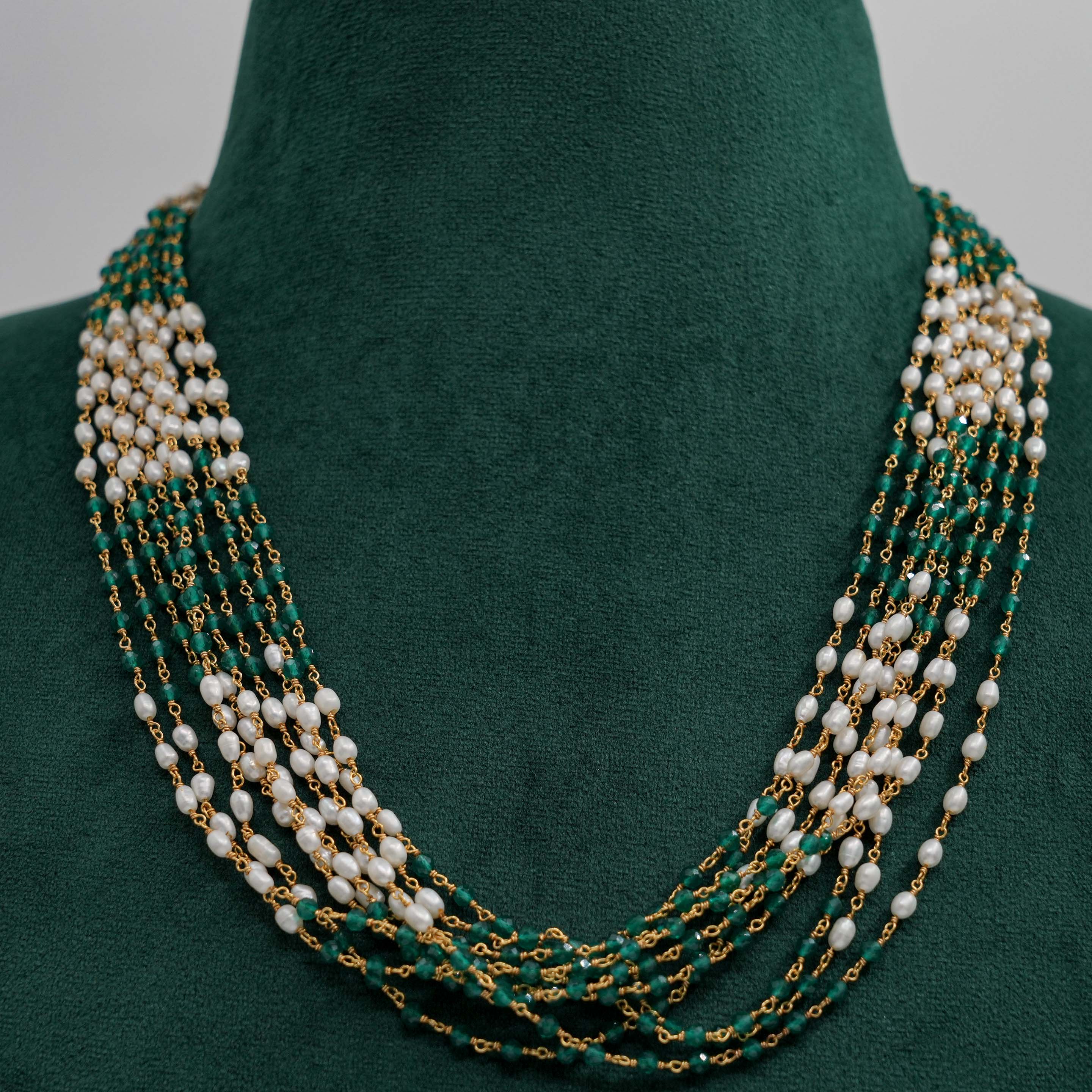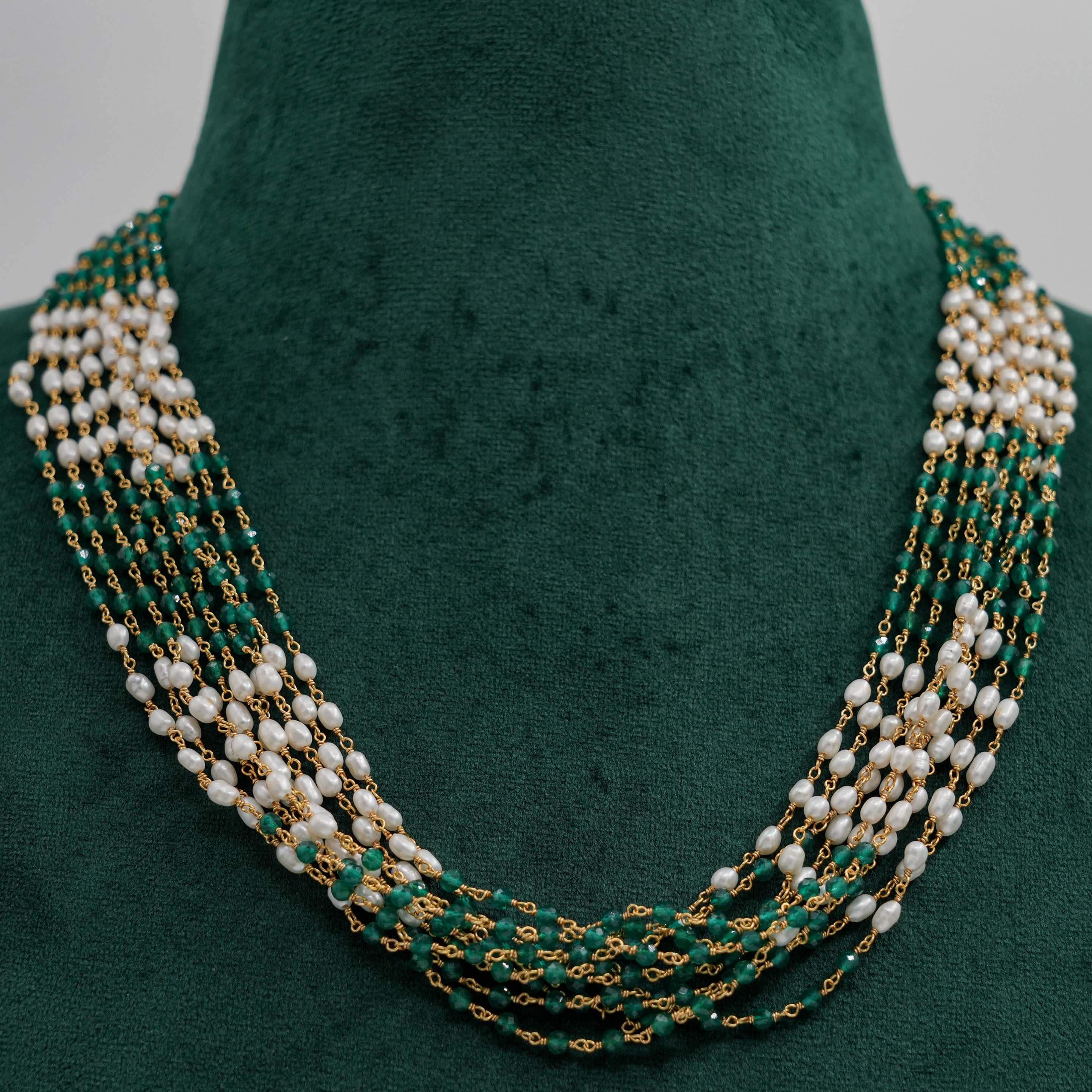 Elegant pearl and emerald beaded Necklace with gold accents. Perfect for special occasions. Buy pearl emerald Necklace from Raag Silver Jewellery in Hyderabad.