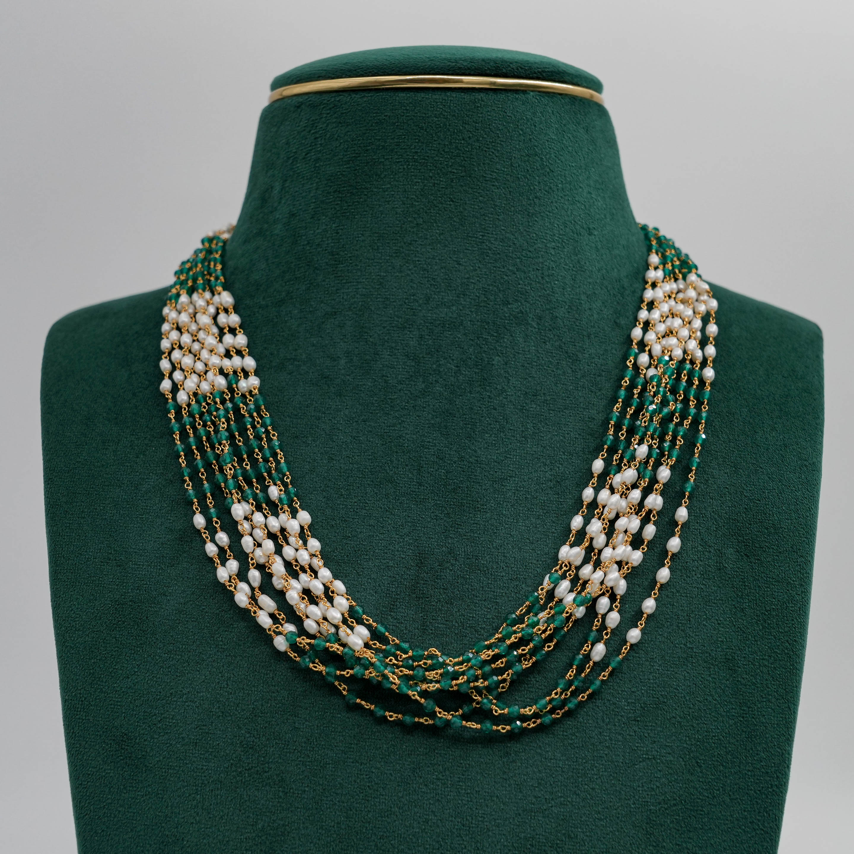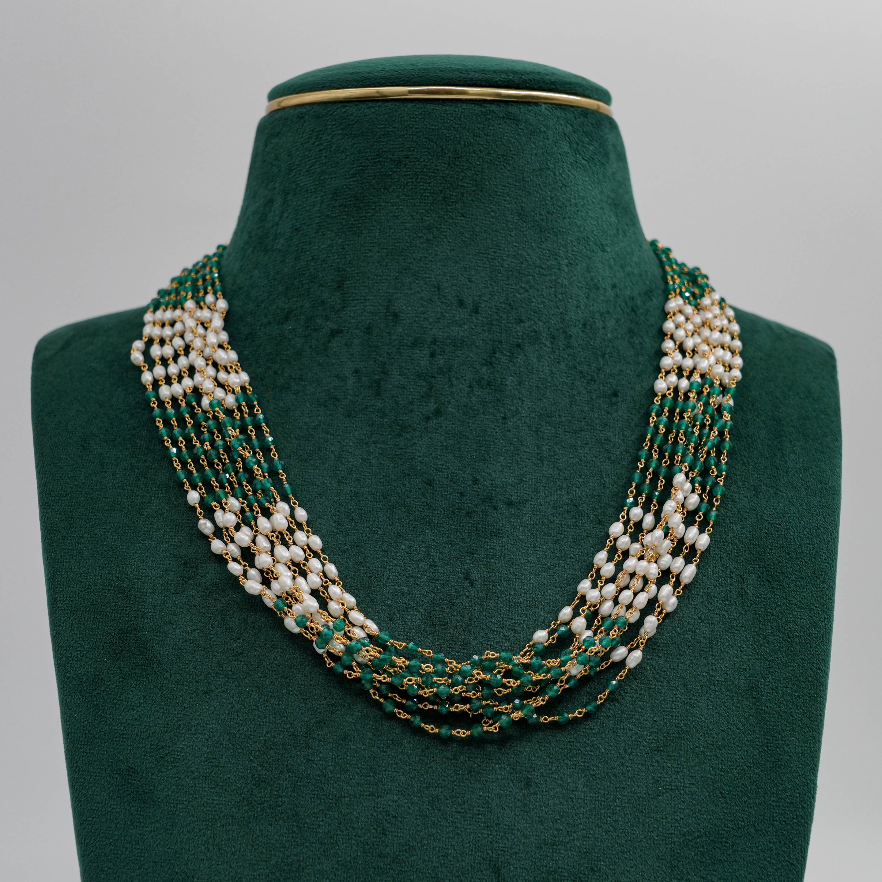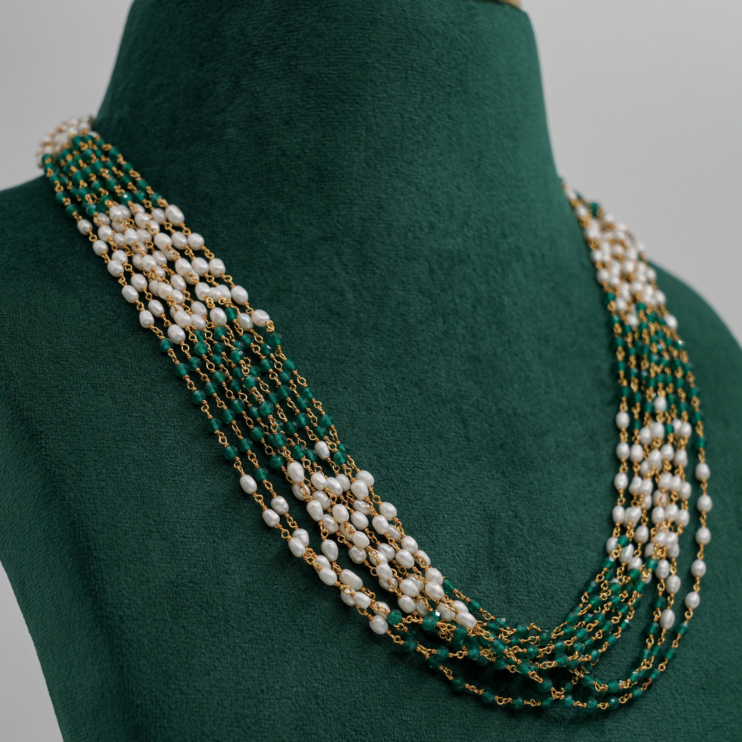 Elegant pearl and emerald beaded Necklace with gold accents. Perfect for special occasions. Buy pearl emerald Necklace from Raag Silver Jewellery in Hyderabad.