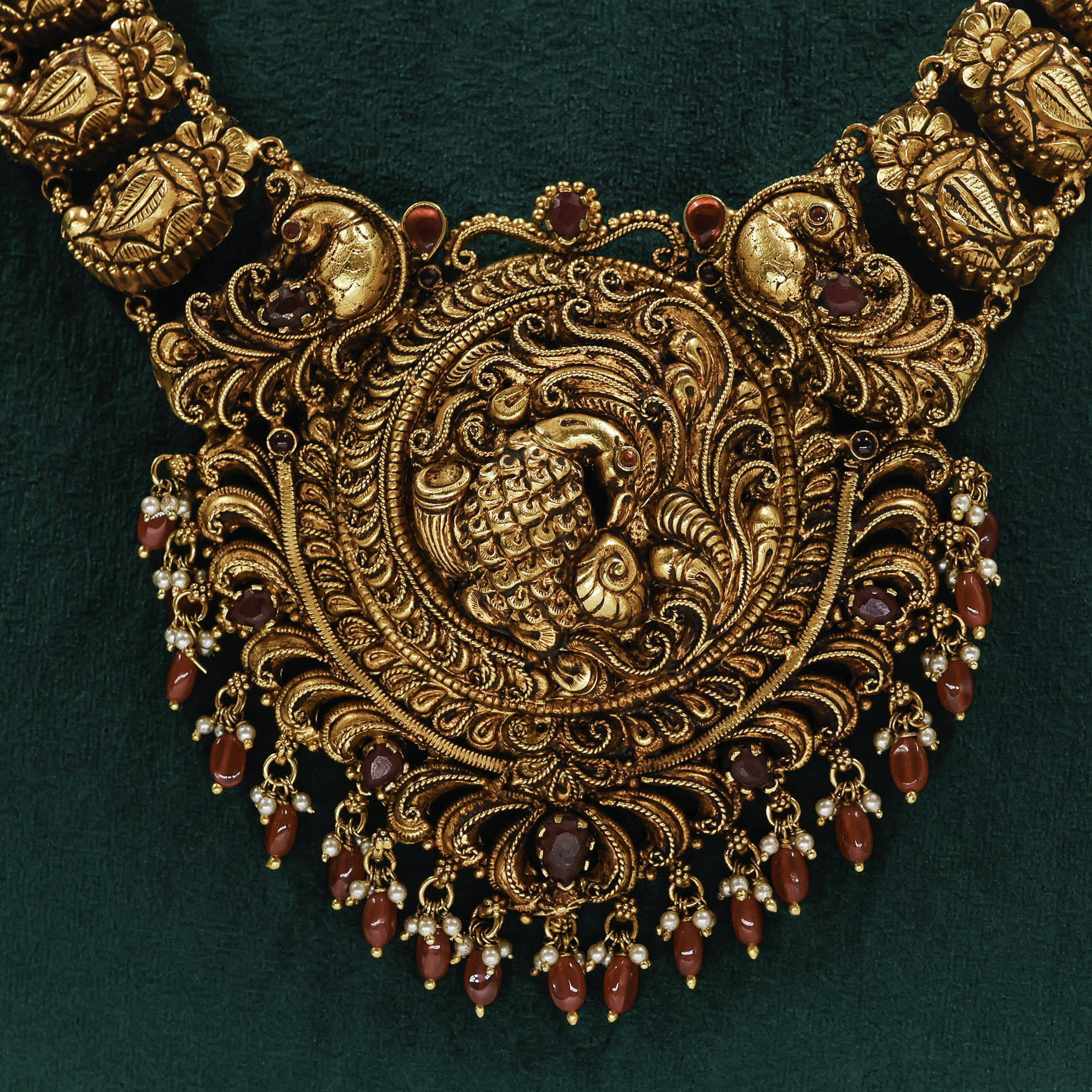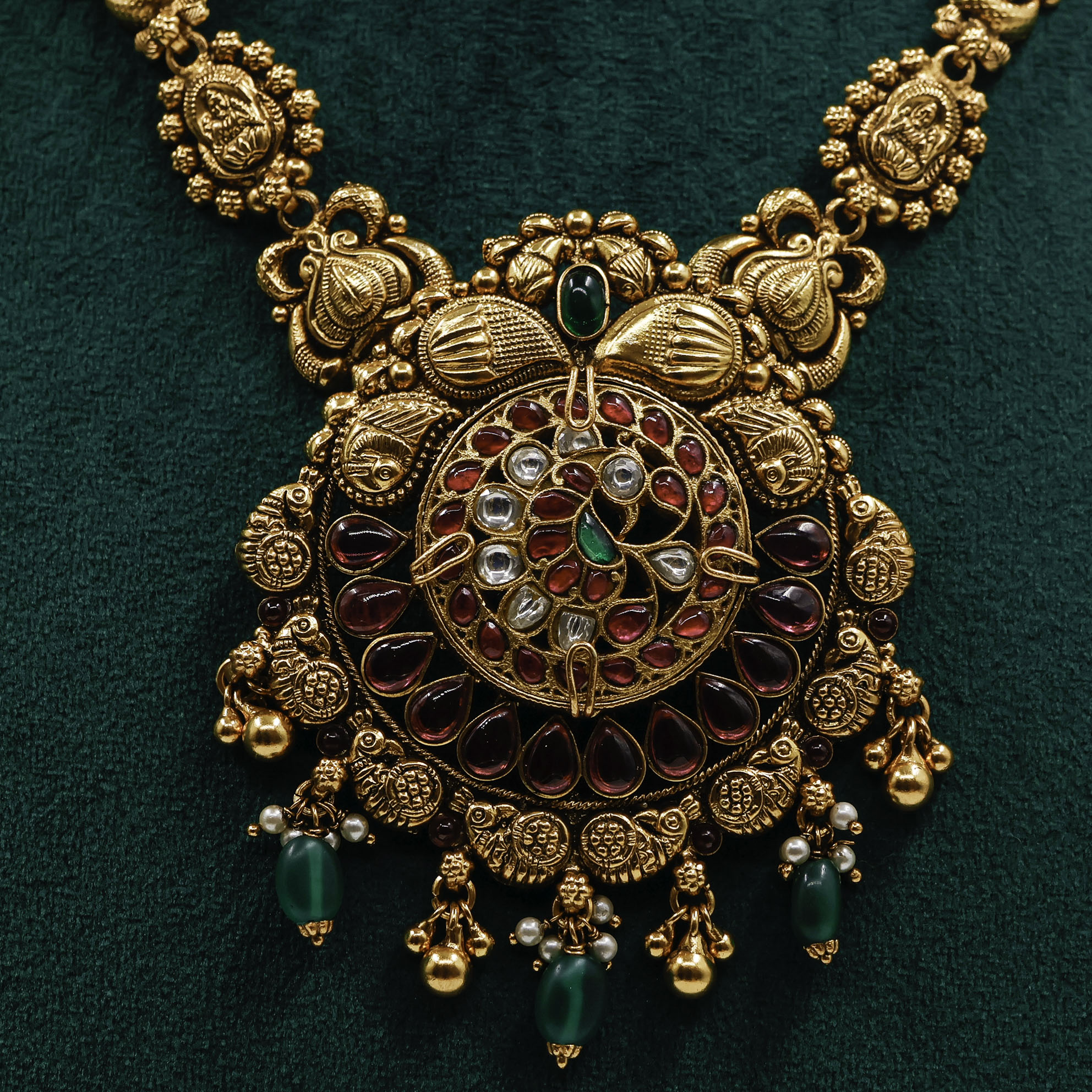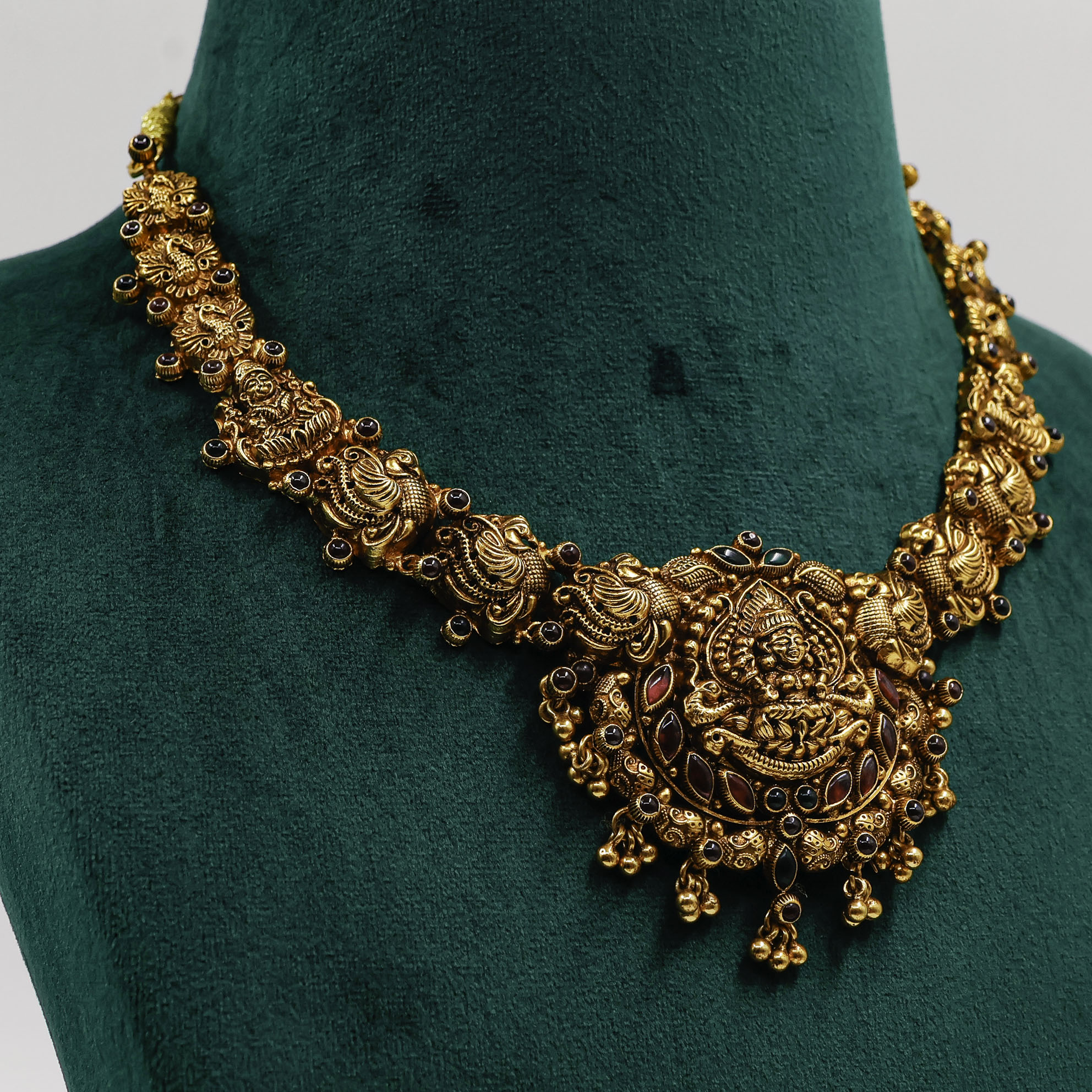 Antique Gold Polished Silver temple necklace featuring Lakshmi and peacock motifs, perfect for weddings and traditional occasions. Buy from Raag Silver Jewellery in Hyderabad.