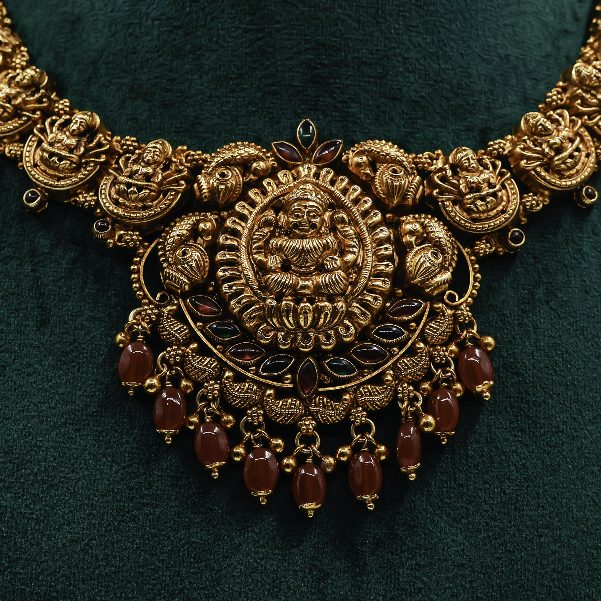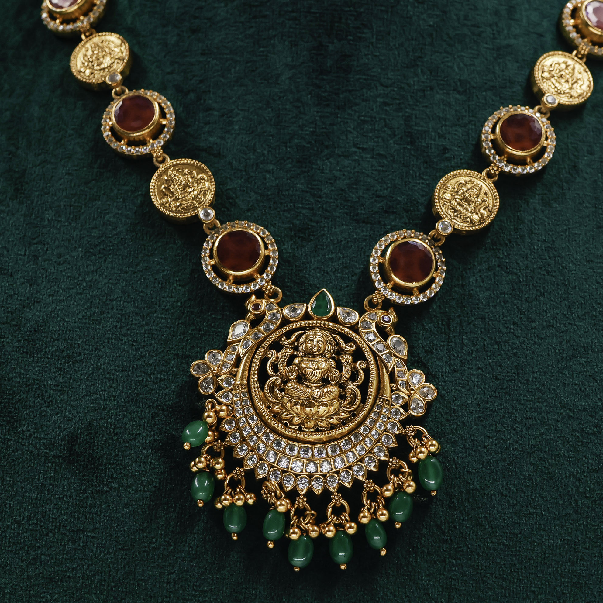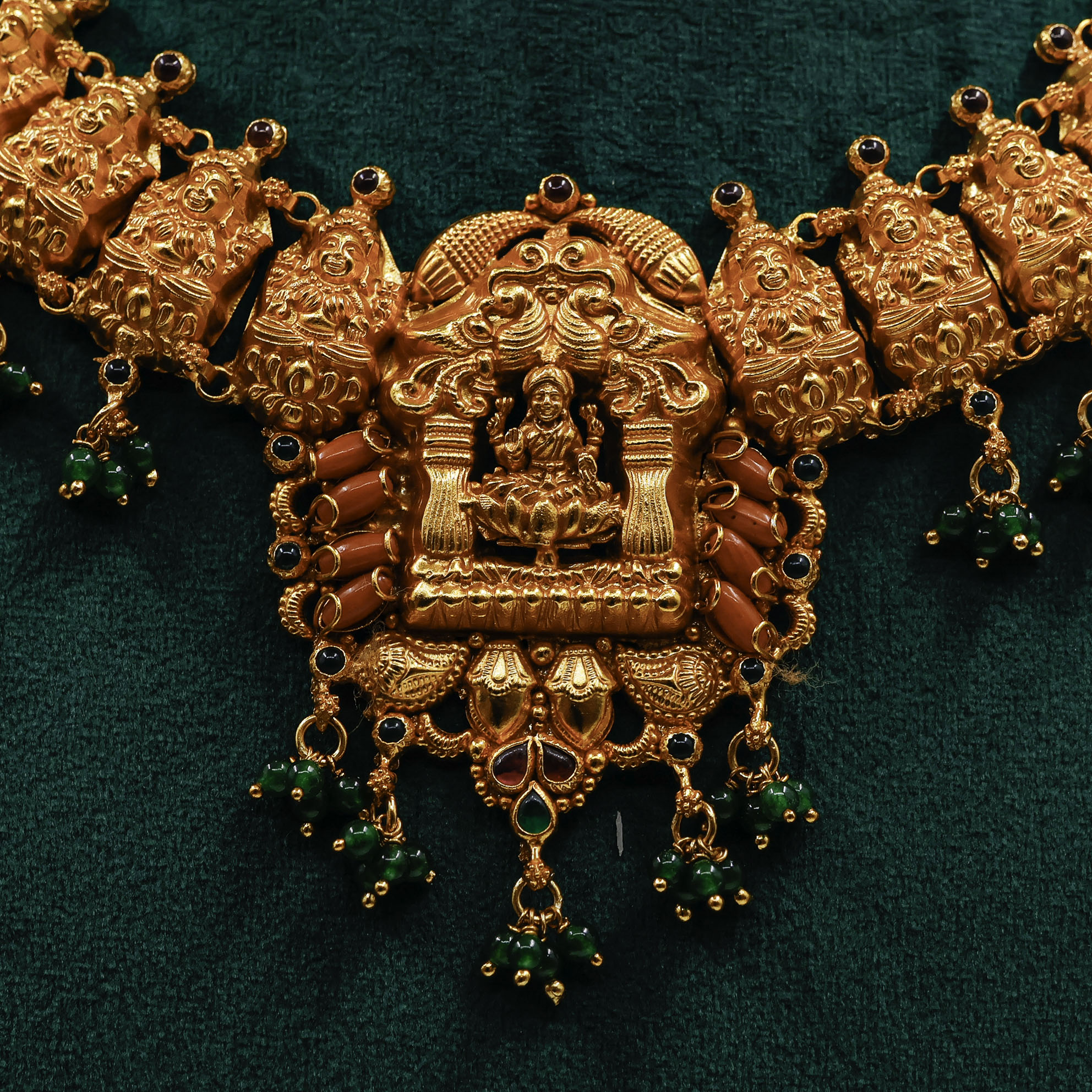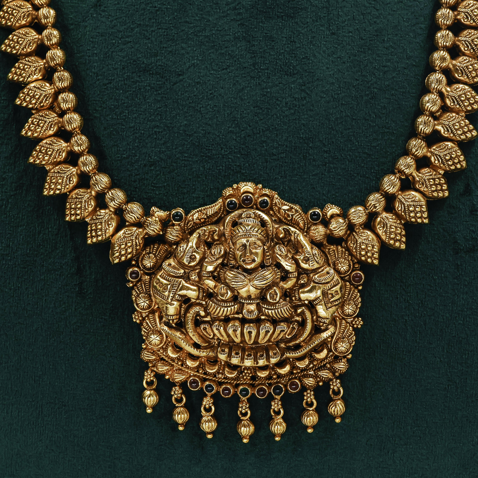 Ornate Gold Polished Silver Lakshmi necklace, a traditional Indian jewelry piece, perfect for weddings and festive occasions. Buy Gold Polished Silver Lakshmi necklace from Raag Silver Jewellery in Hyderabad.