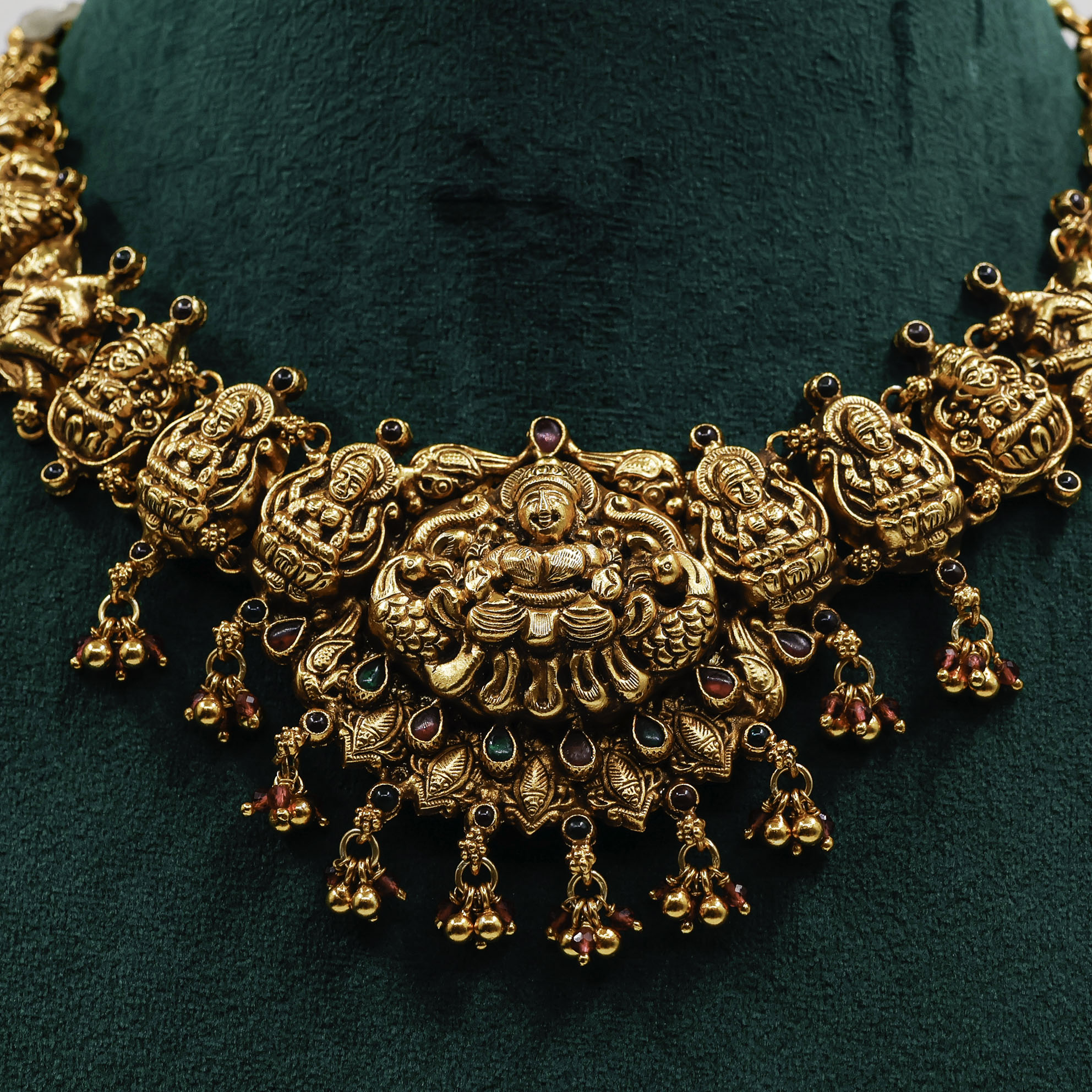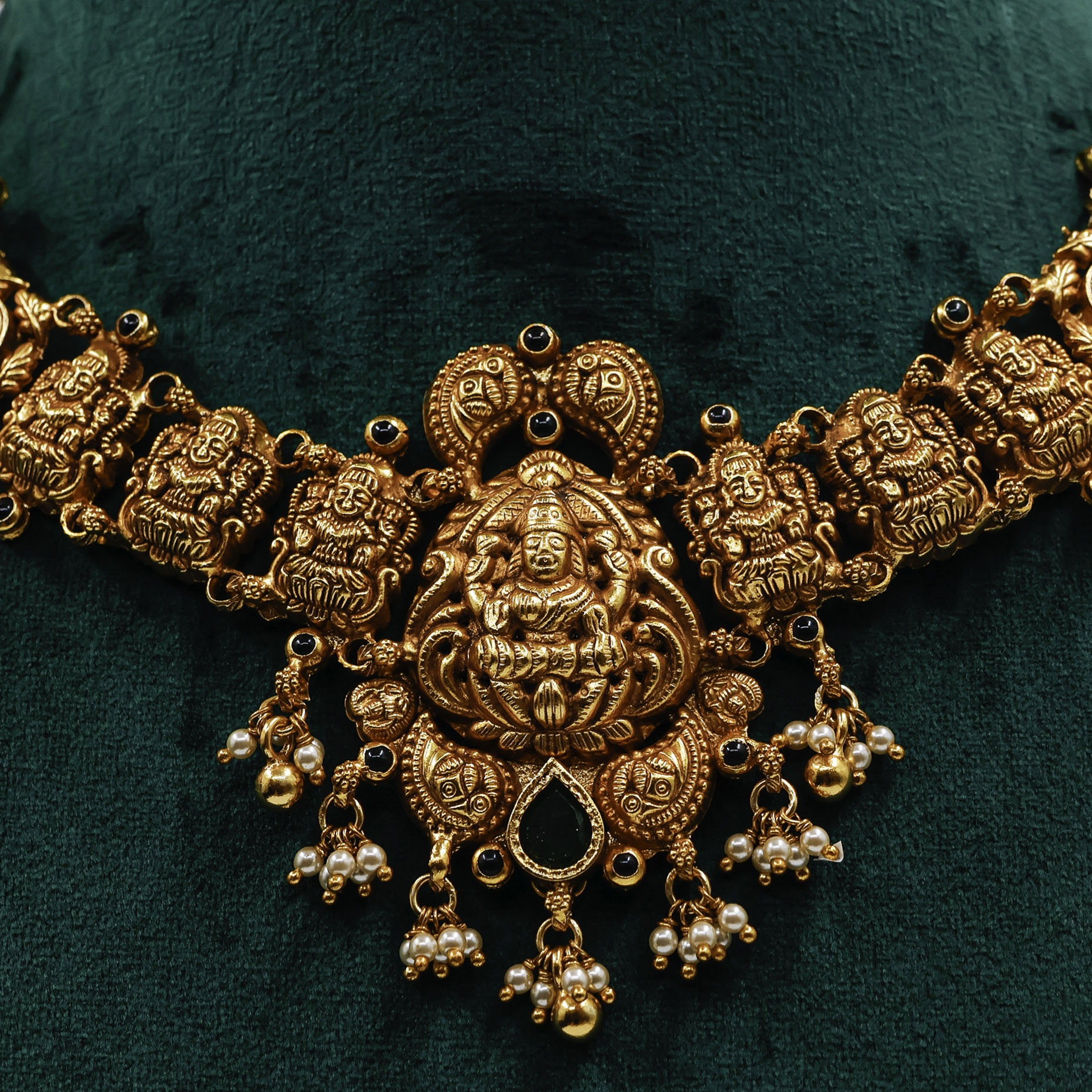 Antique Gold Polished Silver Lakshmi necklace featuring the goddess of wealth, perfect for traditional occasions. Buy Gold Polished Silver Lakshmi Necklace from Raag Silver Jewellery in Hyderabad.