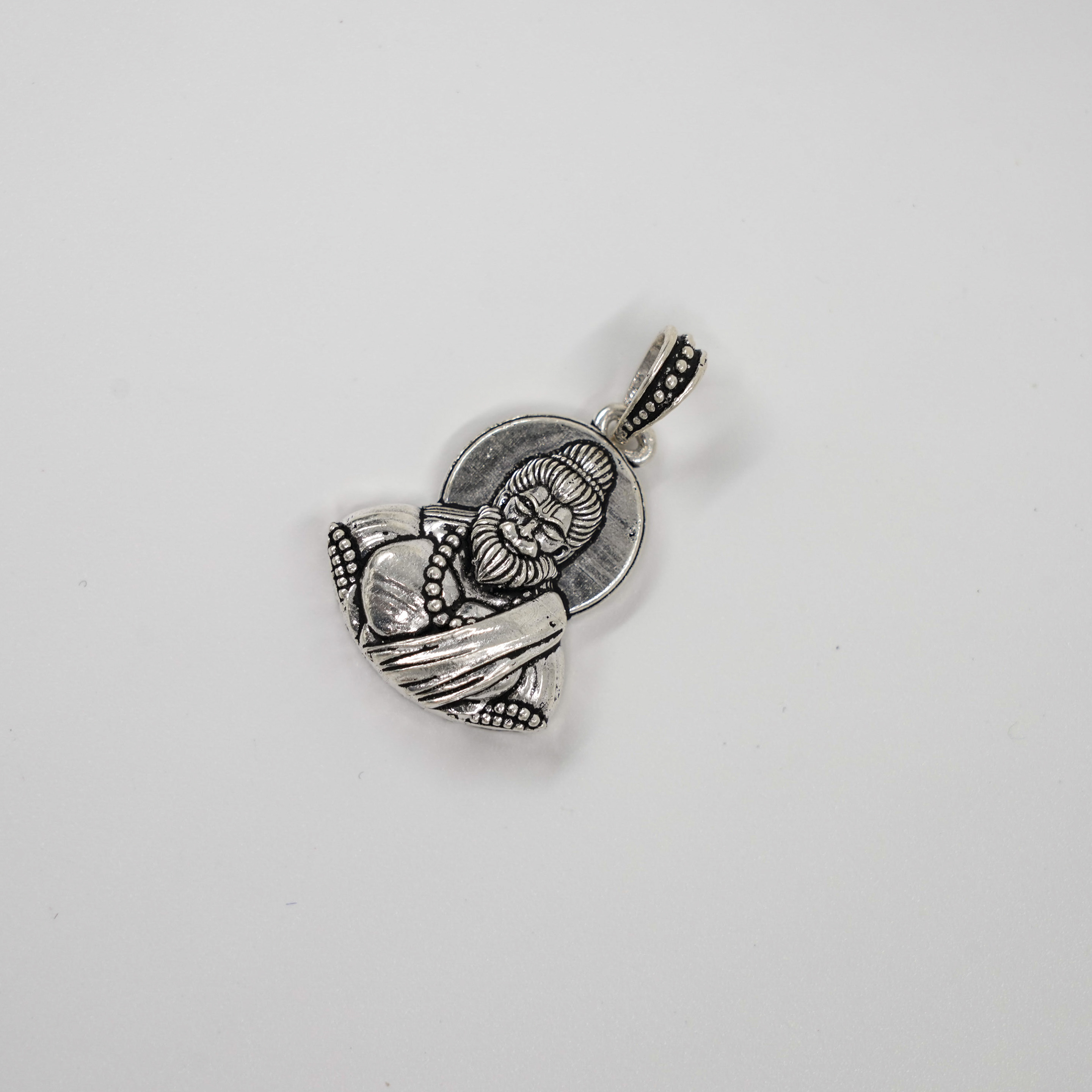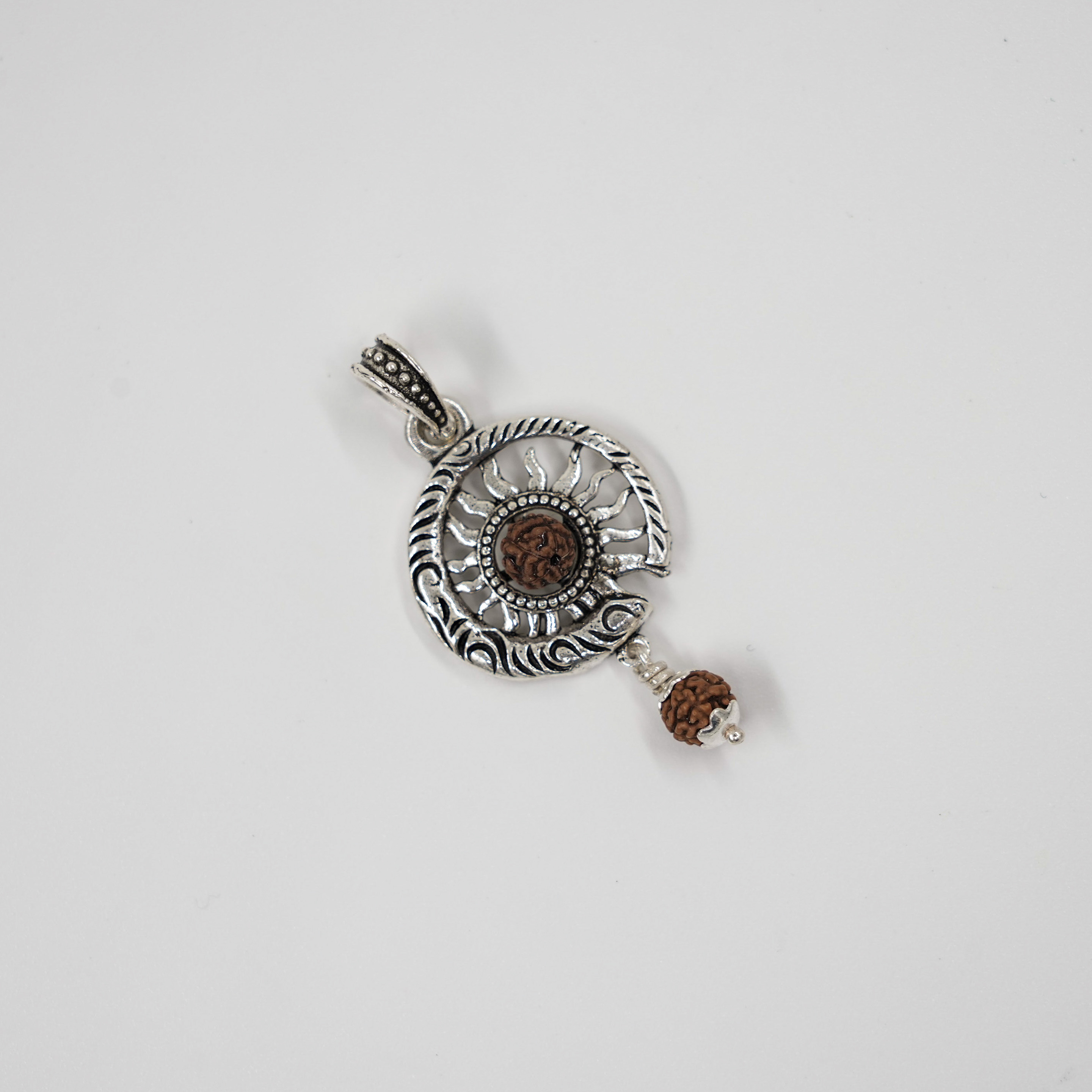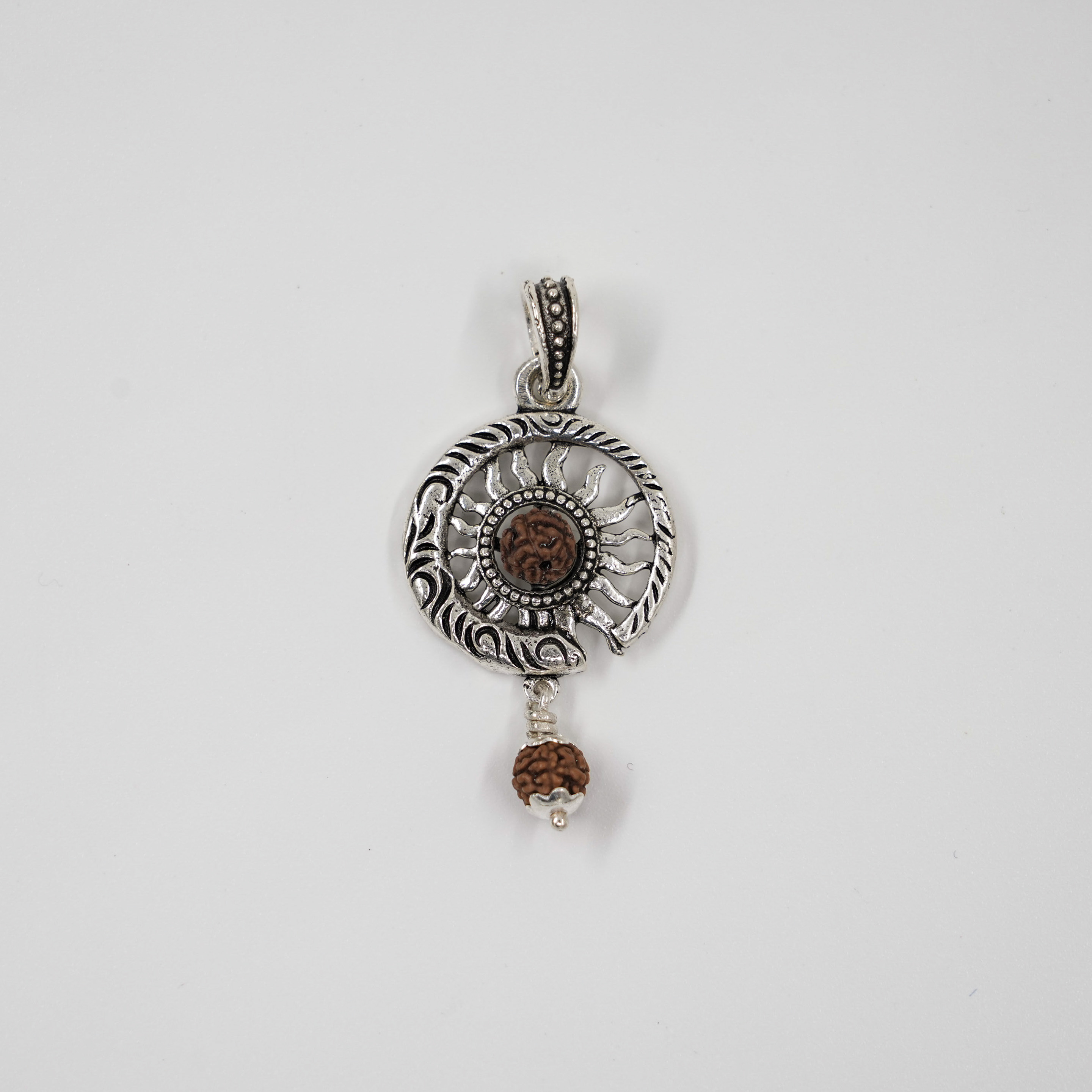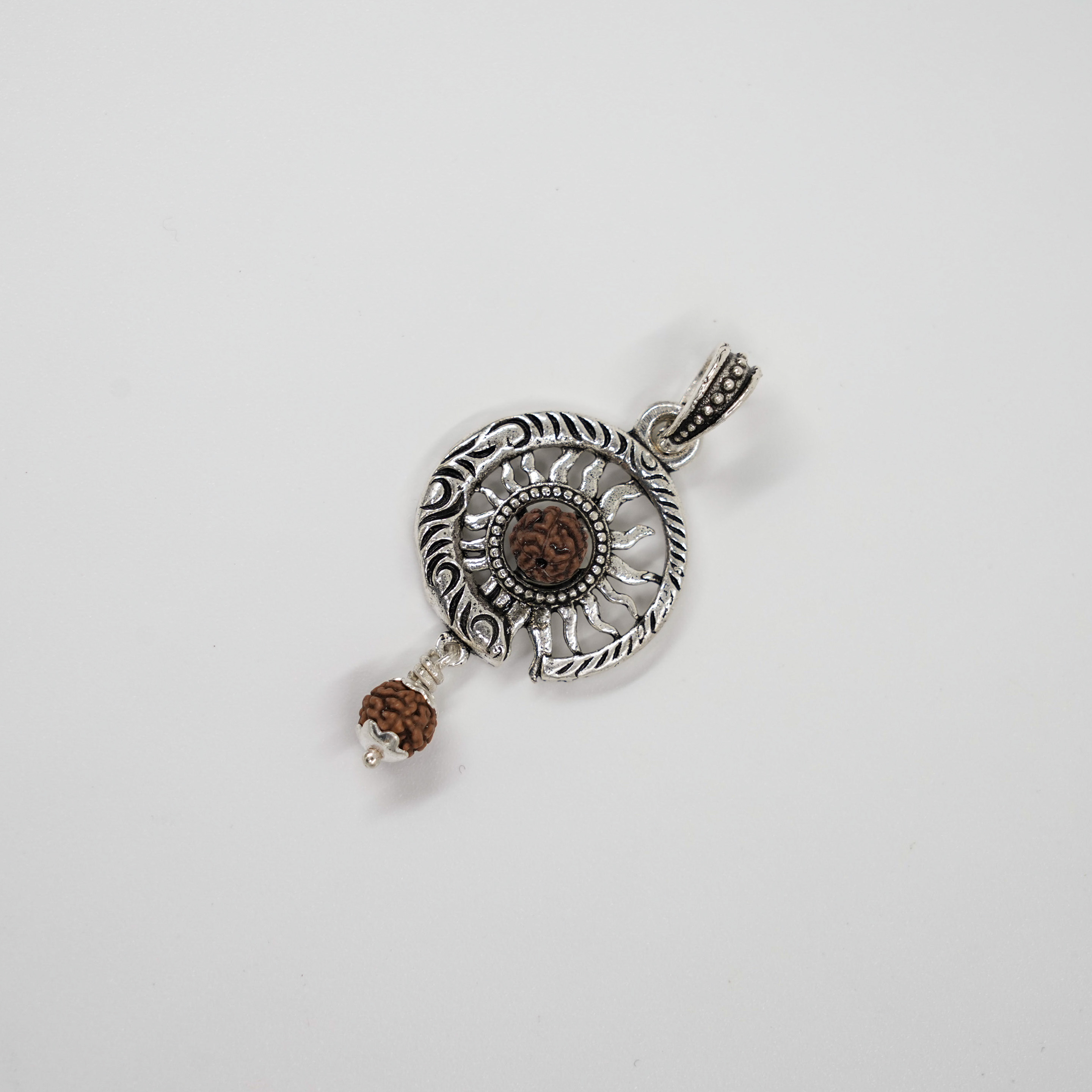 Ornate silver sun pendant with rudraksha bead, perfect for everyday wear or special occasions. Buy silver sun pendant from Raag Silver Jewellery in Hyderabad.