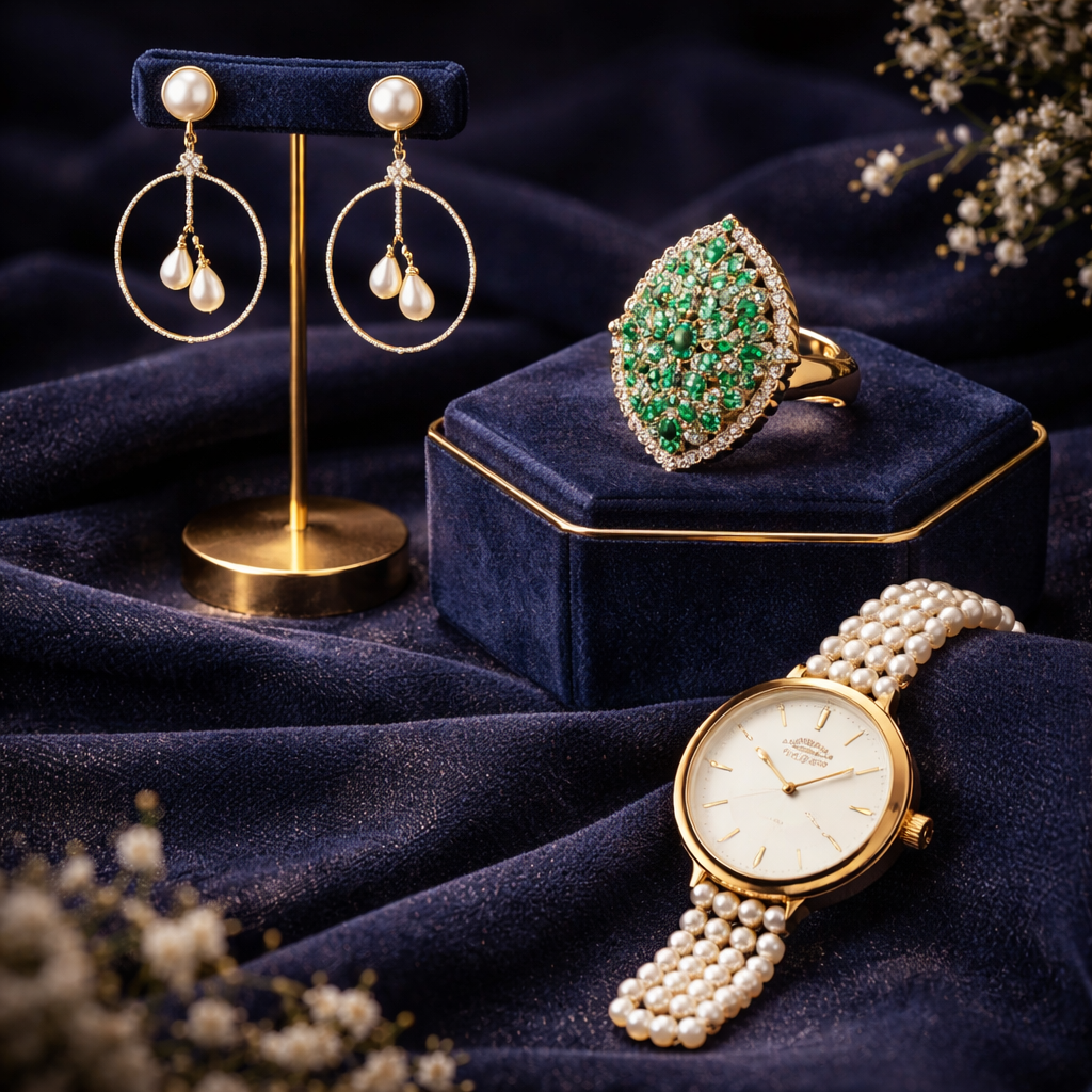 Elegant pearls with rich emerald detailing for a regal look. Perfect for weddings and special occasions.