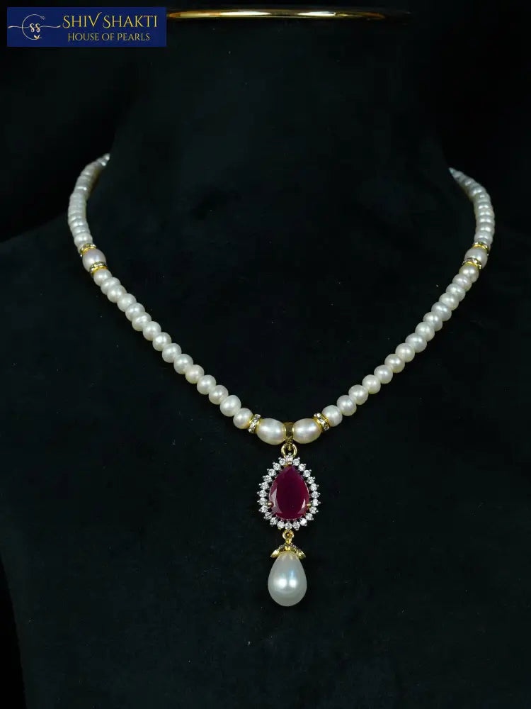 Discover the perfect blend of passion and grace with this exquisite Drop Ruby Pearl Necklace. Radiant pearls cascade elegantly alongside deep ruby gemstones, creating a mesmerizing focal point that commands attention. This versatile piece transitions seamlessly from boardroom to ballroom, adding instant sophistication to any ensemble. The thoughtfully designed drop silhouette flatters your neckline while the rich color palette complements all skin tones. Invest in a necklace that tells a story of luxury and timeless beauty�one that you'll treasure for years to come and pass down as a cherished heirloom.