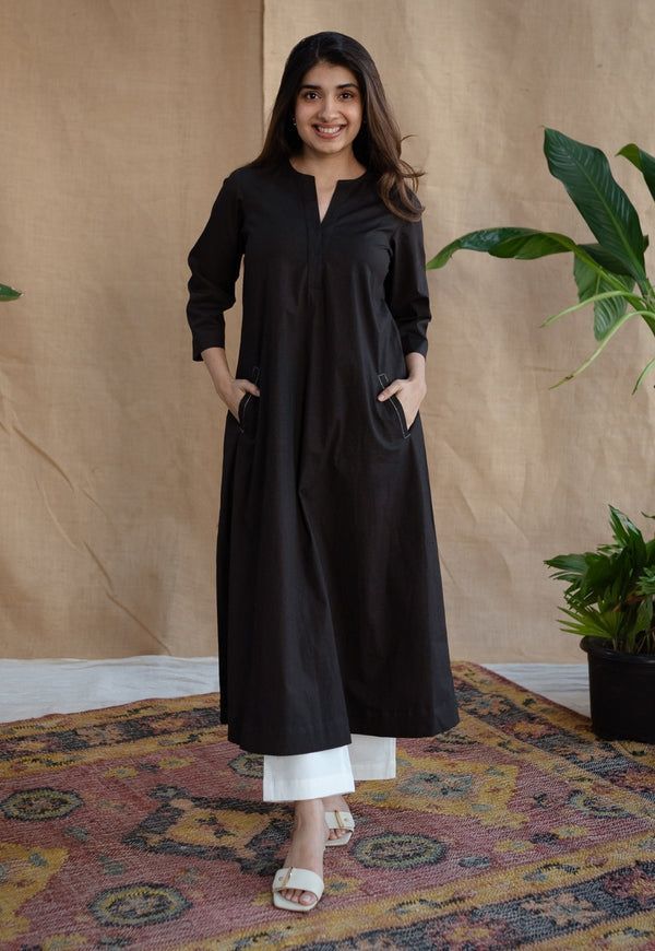 A stylish black and grey printed long kurti made from soft, breathable fabric. It has a simple and elegant design, perfect for daily wear or casual outings. You can pair it with leggings, palazzos, or jeans for a comfortable and trendy look. Ideal for office wear, small gatherings, or everyday use.