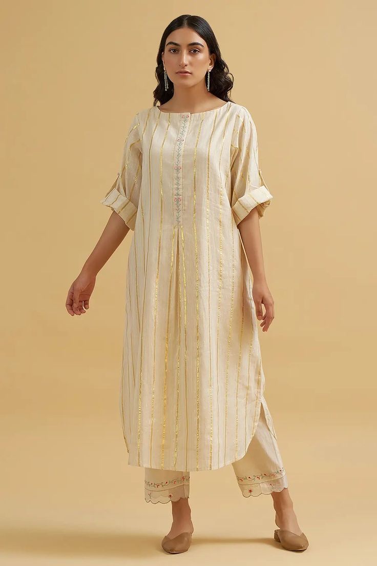 A stylish kurti in a unique olive and white color combination. The subtle vertical stripes are accented with a bold floral pattern, making it a great choice for everyday wear.