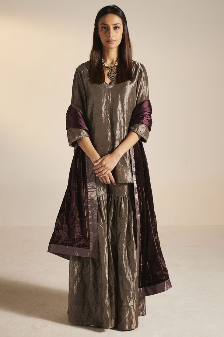Step into timeless elegance with this royal purple embroidered kurti sharara set. The sleeveless kurti is adorned with exquisite silver thread embroidery across the neckline, panels, and hem, creating a regal and refined look. Paired with flowy sharara pants detailed with delicate motifs and complemented by a matching dupatta, this ensemble offers graceful movement and luxurious appeal. Perfect for festive occasions, wedding functions, receptions, and evening celebrations, this outfit blends classic craftsmanship with contemporary style.