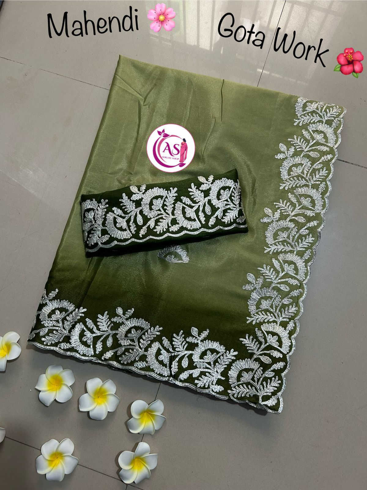 Enhance your festive style with this elegant saree crafted from premium Chinon fabric for a soft and flowy drape. Featuring full gota cut work on the pallu, beautifully designed borders, and intricate butti work all over, it offers a rich and graceful look, perfect for celebrations, functions, and special occasions.Fabric: ChinonStyle: Festive TraditionalWork: Gota Cut Work with Butti DesignType: Party / Festive WearBlouse: Mono Banglori Contrast with Full Work