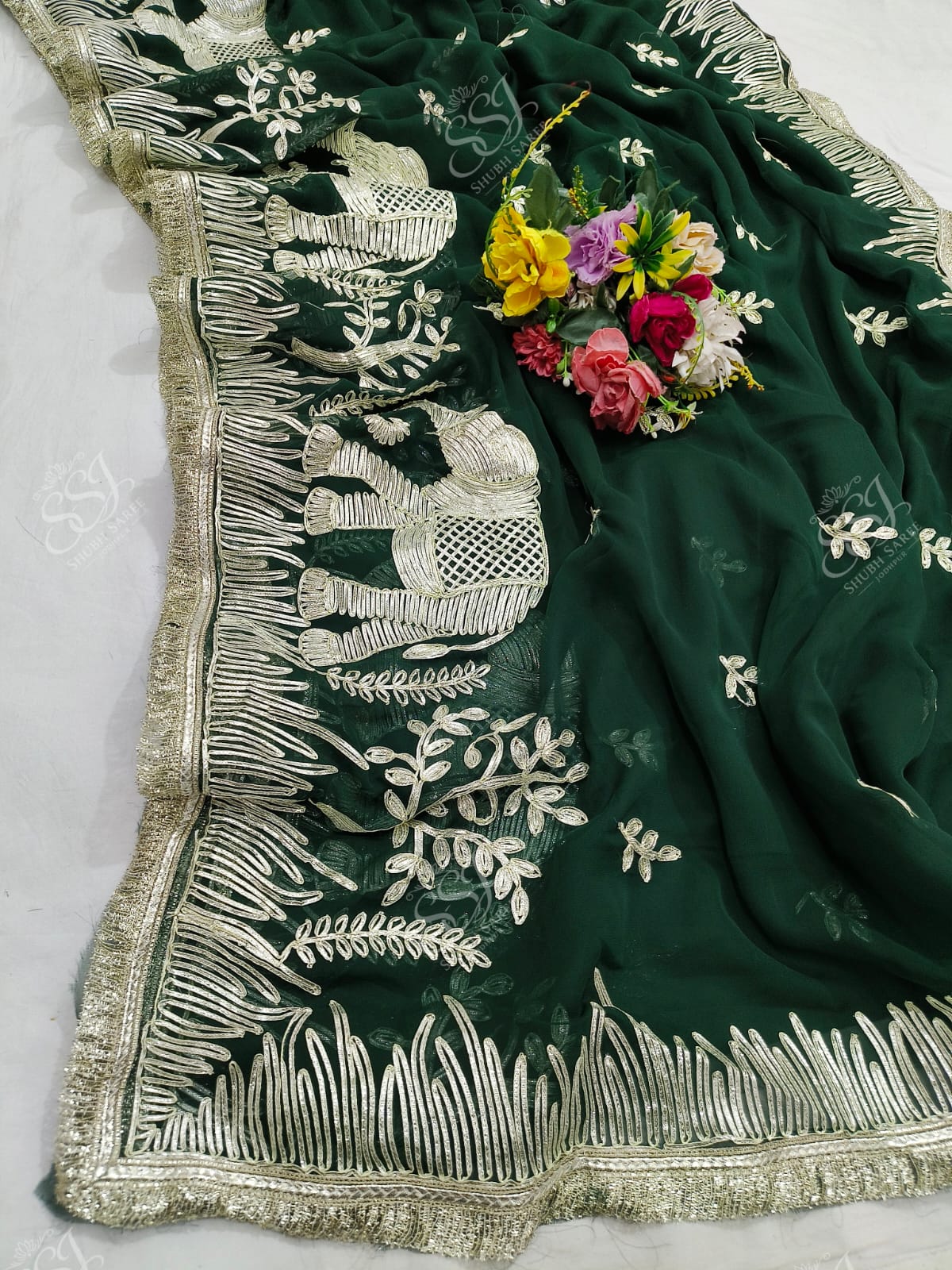 Beautiful soft georgette saree designed with rich traditional aesthetics, featuring intricate gota work with unique elephant and tree motifs. The saree is enhanced with all-over gota buti work and a heavy Rajputi-style border, giving it a royal and festive appeal. Perfect choice for ethnic occasions and celebrations.Fabric: Soft GeorgetteStyle: Rajputi Designer SareeWork: Gota Work with Buti & Motif DesignType: Festive Wear / Ethnic WearBlouse: Running BlouseOffers: Buy bulk on best pricePrice: ?850/-
