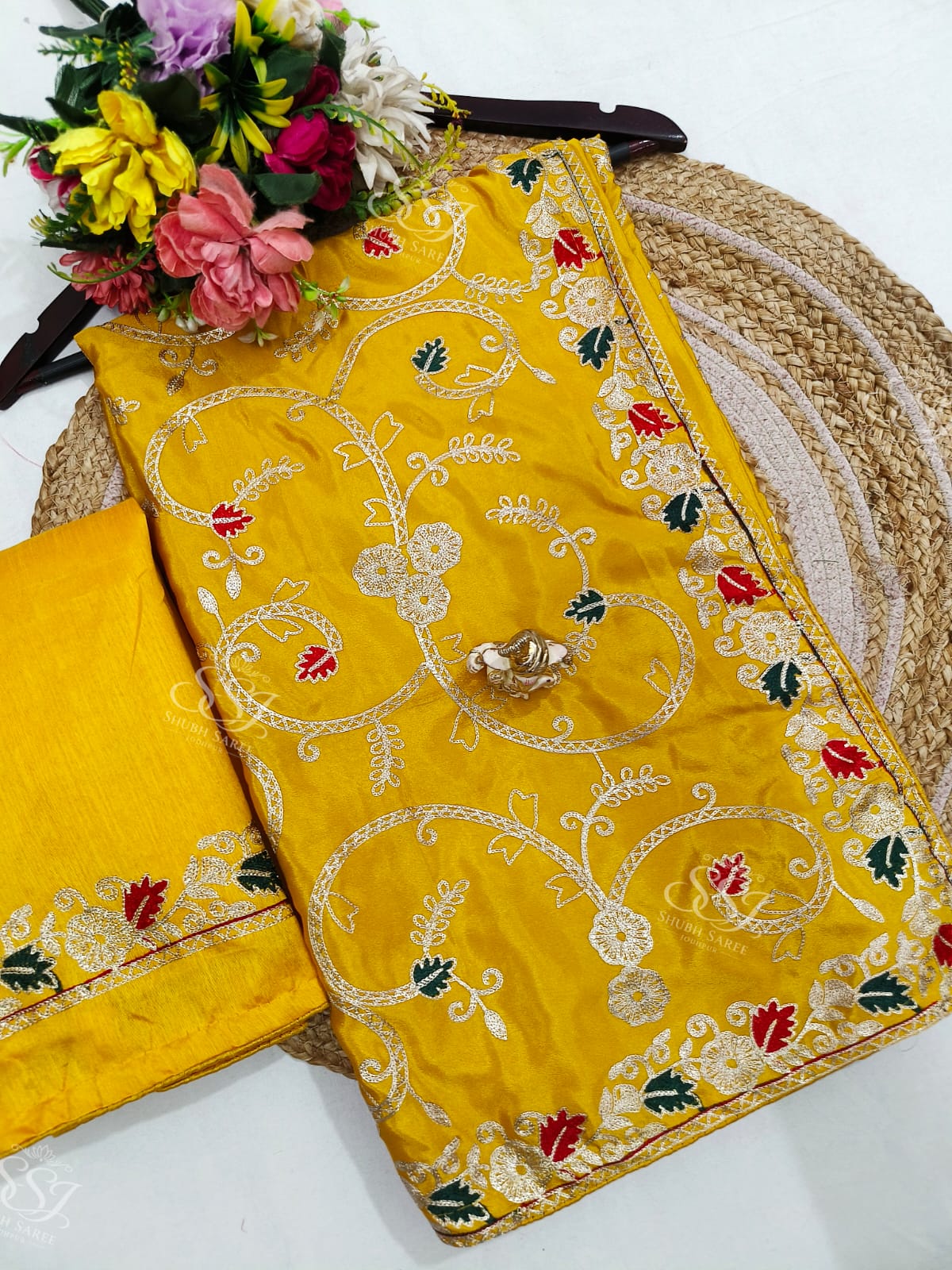 Elevate your festive look with this premium saree crafted from soft pure HO silk, offering a rich and elegant drape. Adorned with heavy chain stitched jaal work across the saree and a beautifully detailed border, it adds a luxurious touch. Perfect for weddings, celebrations, and special occasions.Fabric: Soft Pure HO SilkStyle: Festive TraditionalWork: Heavy Chain Stitched Jaal Work with BorderType: Party / Wedding WearBlouse: Space Silk with Full Work (Unstitched)Offers:5 pieces at ?850 each