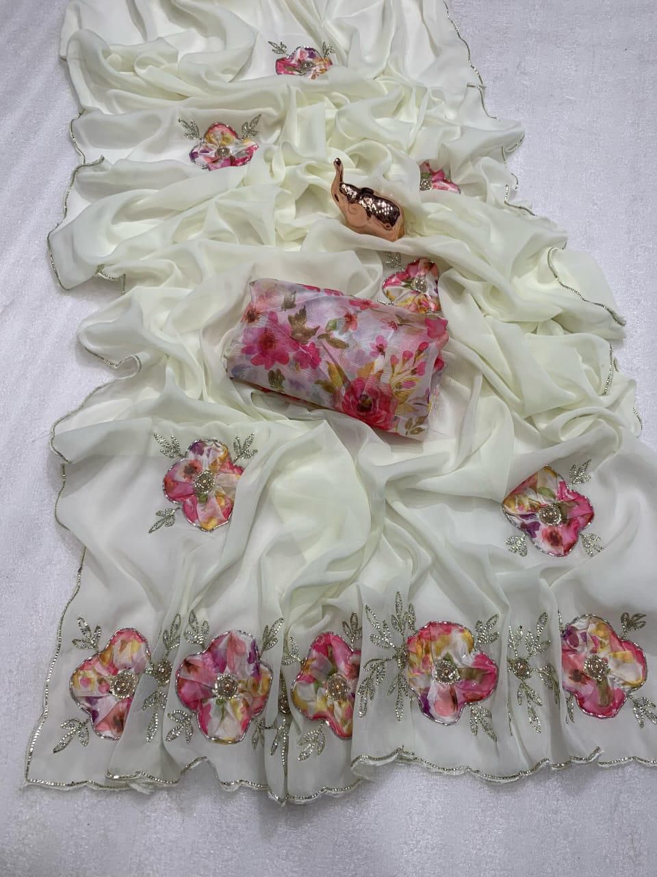 Enhance your style with this heavy star georgette saree featuring elegant digital floral prints combined with intricate thread, khatli, and moti work. Finished with a stylish lace border and paired with a matching digital print blouse, it offers a premium and graceful look perfect for festive and party wear.Fabric: Heavy Star GeorgetteStyle: Digital Floral DesignerWork: Thread, Khatli & Moti Work with Lace BorderType: Festive Wear SareeBlouse: Digital Print BlouseOffers: Price � ?1100 (Single Available)