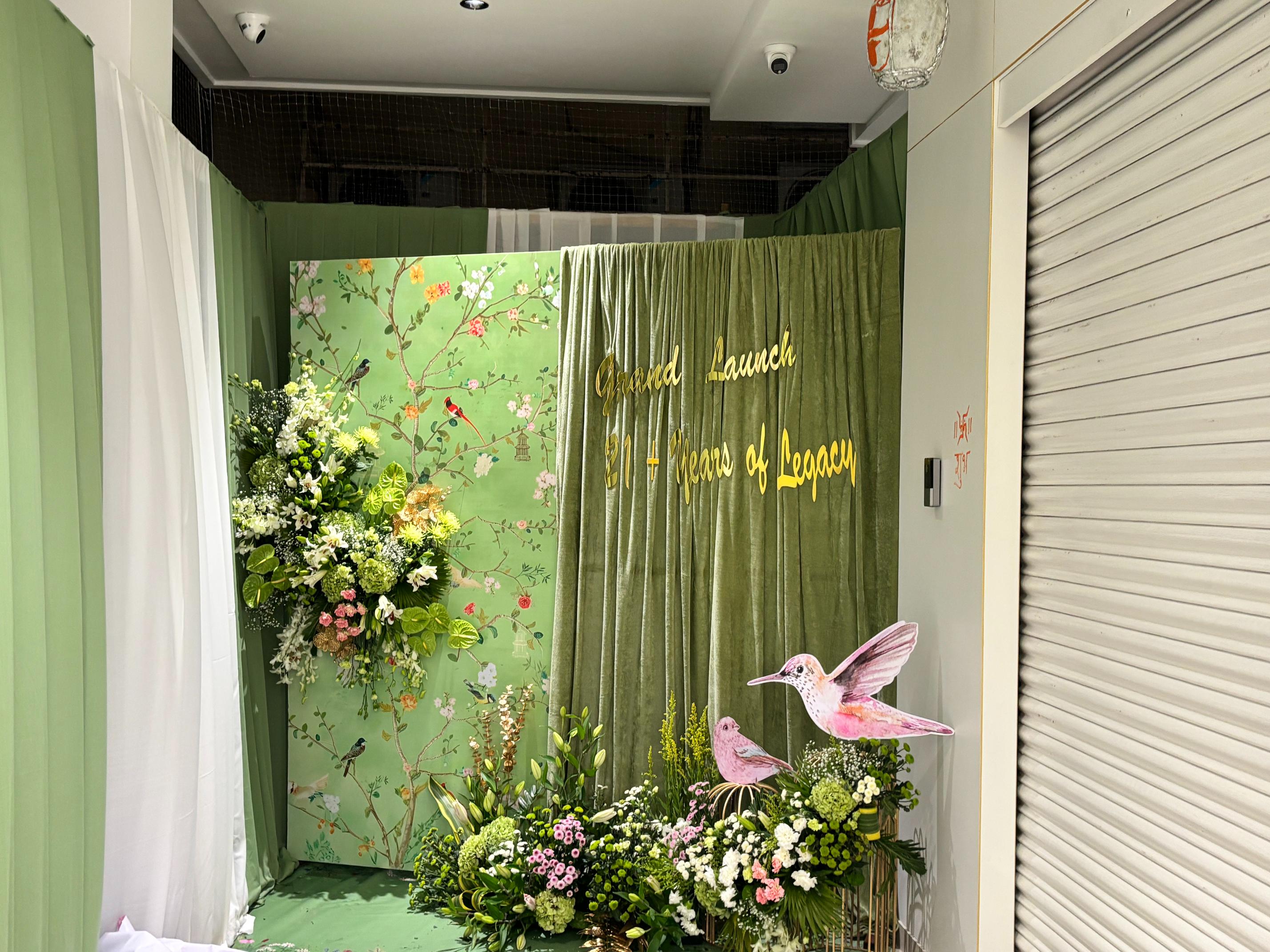 Modern brand signage setup with floral decor for jewelry event.