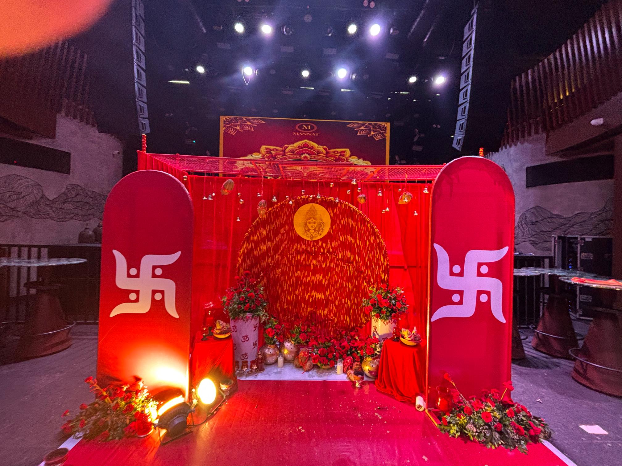 Red and floral-themed stage decoration for festive celebrations.