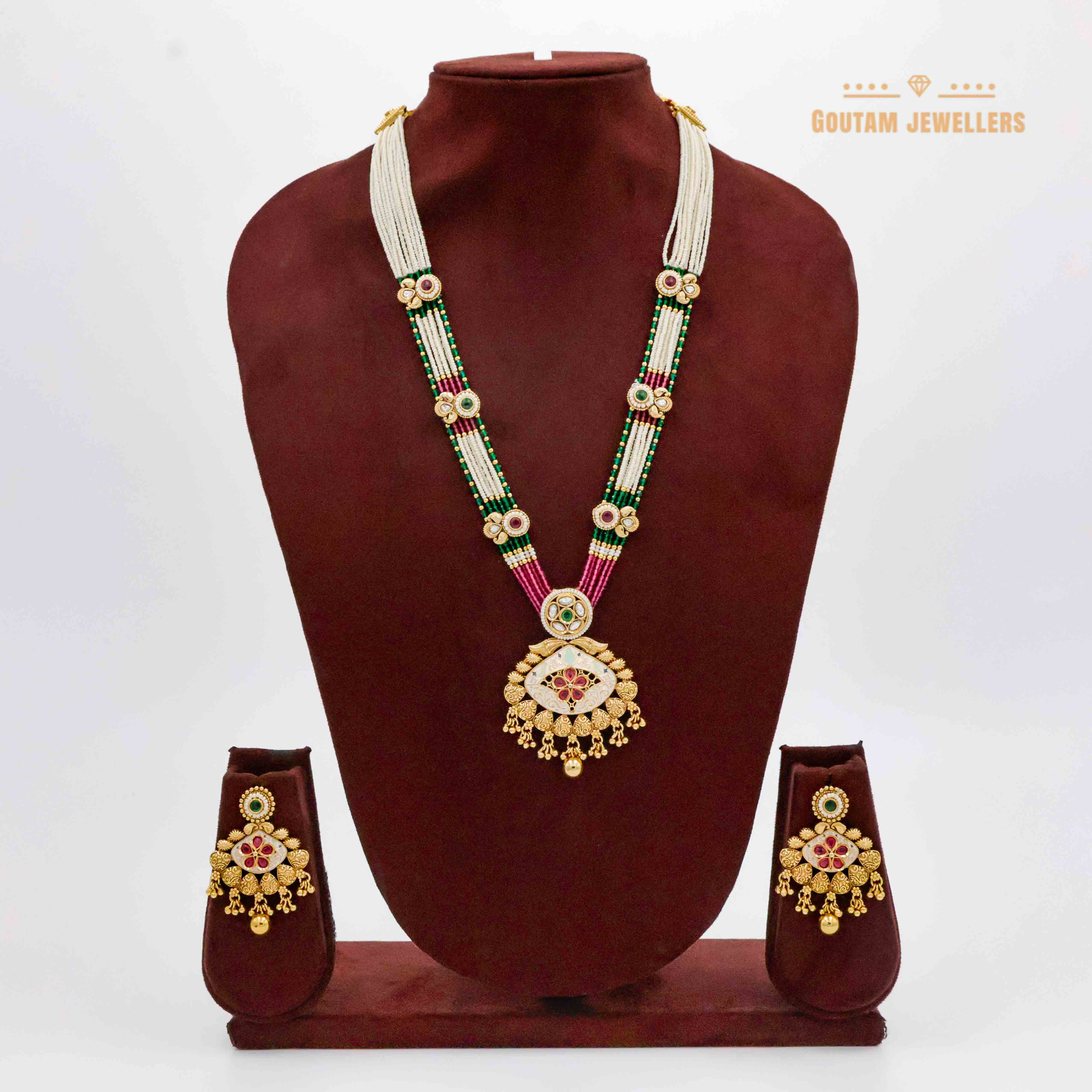 Crafted from copper-based alloy with gold plating, this embellished jewellery set features Kundan and imitation stones. Note that product colors may vary slightly due to lighting, and dimensions are approximate.