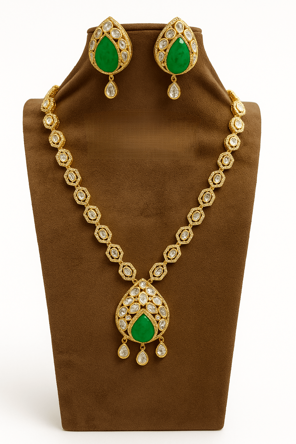 Crafted from copper-based alloy with gold plating, this embellished jewellery set features Kundan and CZ stones. Note that product colors may vary slightly due to lighting.